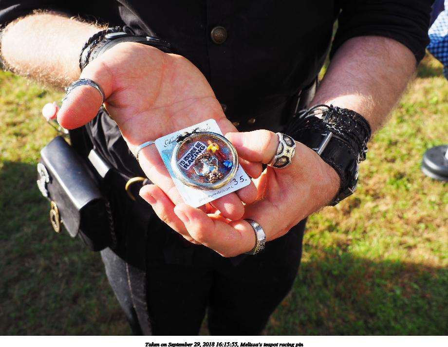 Picture #33: Melissa's teapot racing pin Small: 920x713, 106,876 bytes (105K), (html file) Large: 4600x3450, 2,432,359 bytes (2.3M), (html file) Olympus E-M10-II camera with Olympus-m43 12-40mm f/2.8 lens f/5.6, ISO 200, 1/250 sec, 18.0mm, auto mode, vivid color, SHQ, matrix metering, IS Auto, noise reduction auto 35mm equivalent focal length 36.0mm Programs used: crop, raw therapee Taken by Michael Meissner on September 29, 2018 16:15:55 Last modified on October 16, 2018 at 01:54 |