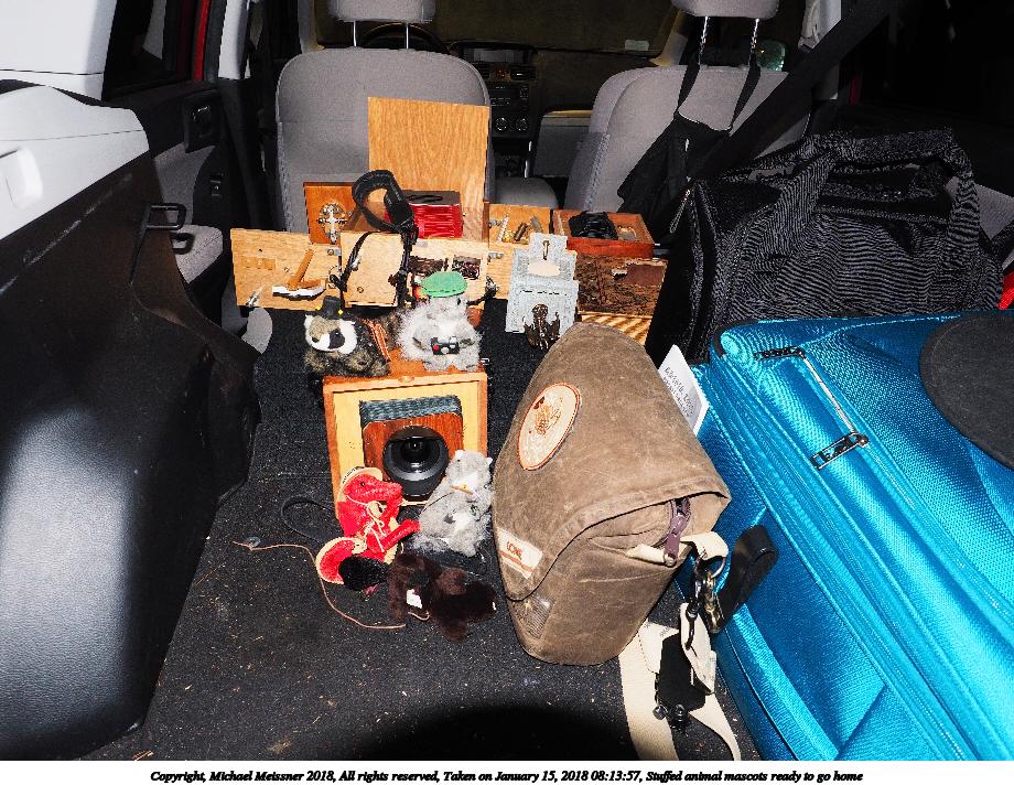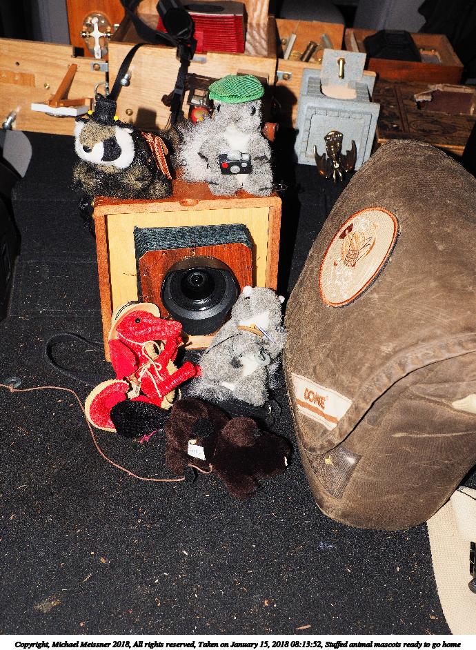 Picture #19: Stuffed animal mascots ready to go home Small: 690x942, 212,893 bytes (208K), (html file) Large: 3450x4600, 6,177,036 bytes (5.9M), (html file) Copyright, Michael Meissner 2018, All rights reserved Olympus E-M1-I camera with Olympus-m43 12-40mm f/2.8 lens f/5.6, ISO 640, flash (+0.33 flash compensation), 1/60 sec, 21.0mm, aperture priority, vivid color, SHQ, flash (5500K), matrix metering, IS Auto, noise filter low, anti-shock 35mm equivalent focal length 42.0mm Programs used: adjusttime, crop, raw therapee, rotate left Taken by Michael Meissner on January 15, 2018 08:13:52 Last modified on January 22, 2018 at 21:30 |