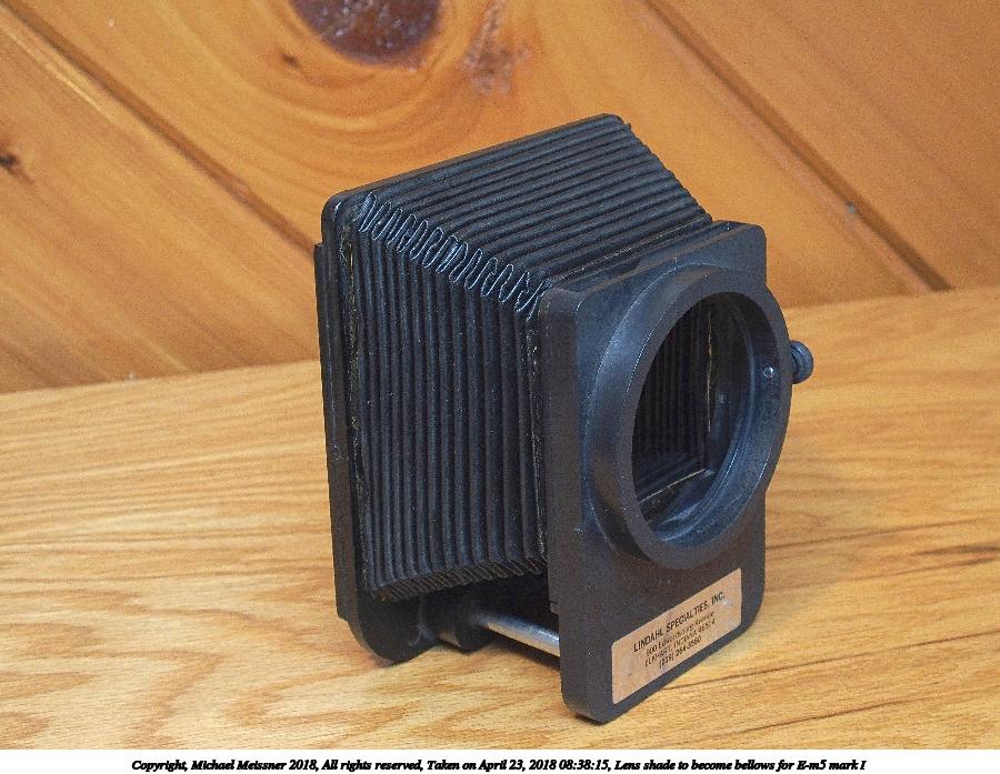 Picture #16: Lens shade to become bellows for E-m5 mark I Small: 900x697, 126,283 bytes (124K), (html file) Large: 3600x2700, 6,973,623 bytes (6.7M), (html file) Copyright, Michael Meissner 2018, All rights reserved Olympus Stylus-1 camera f/2.8, ISO 400, FL-36R flash, 1/60 sec, 13.2mm, auto mode, vivid color, SHQ, matrix metering, IS Auto, noise reduction auto, noise filter low 35mm equivalent focal length 62.0mm Programs used: crop, gimp, raw therapee Taken by Michael Meissner on April 23, 2018 08:38:15 Last modified on April 23, 2018 at 10:34 |