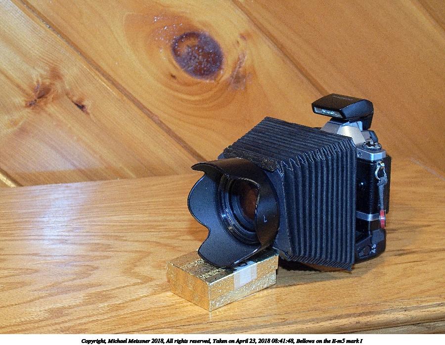 Picture #15: Bellows on the E-m5 mark I Small: 900x697, 139,596 bytes (137K), (html file) Large: 3600x2700, 7,774,468 bytes (7.4M), (html file) Copyright, Michael Meissner 2018, All rights reserved Olympus Stylus-1 camera f/2.8, ISO 400, FL-36R flash, 1/50 sec, 12.0mm, auto mode, vivid color, SHQ, matrix metering, IS Auto, noise reduction auto, noise filter low 35mm equivalent focal length 57.0mm Programs used: crop, gimp, raw therapee Taken by Michael Meissner on April 23, 2018 08:41:48 Last modified on April 23, 2018 at 10:36 |
