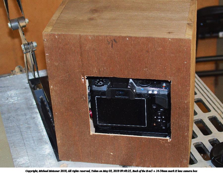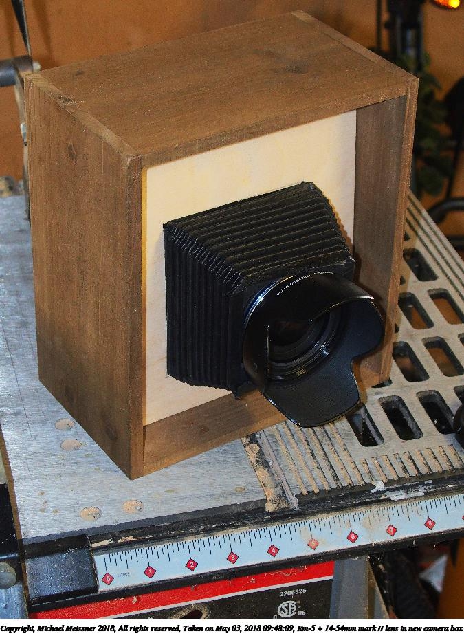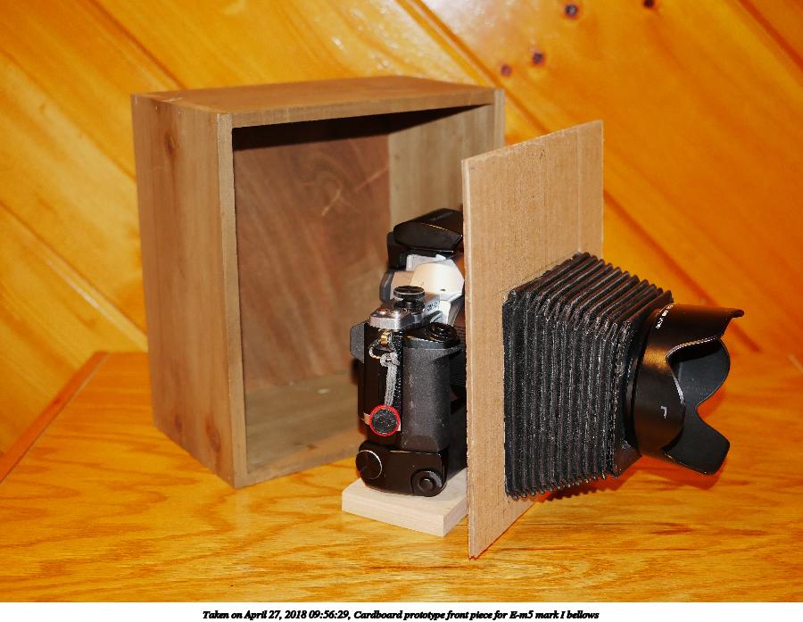 Picture #14: Cardboard prototype front piece for E-m5 mark I bellows Small: 900x697, 116,975 bytes (115K), (html file) Large: 4500x3375, 3,022,391 bytes (2.9M), (html file) Panasonic G85 camera with Olympus-m43 12-40mm f/2.8 lens f/2.8, ISO 800, flash, 1/60 sec, 25.0mm, auto mode, auto wb (5500), matrix metering, image stabilization, noise reduction 1 35mm equivalent focal length 50.0mm Programs used: crop, raw therapee Taken by Michael Meissner on April 27, 2018 09:56:29 Last modified on April 27, 2018 at 10:22 |