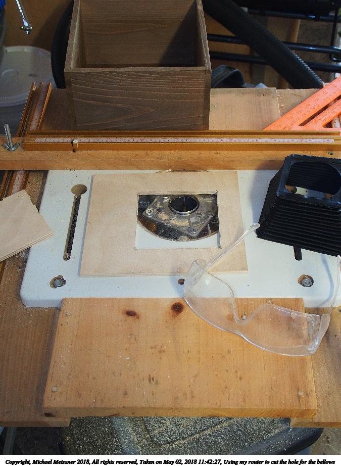 Picture #13: Using my router to cut the hole for the bellows Small: 675x922, 119,801 bytes (117K), (html file) Large: 2700x3600, 2,600,868 bytes (2.5M), (html file) Copyright, Michael Meissner 2018, All rights reserved Olympus Stylus-1 camera f/2.8, ISO 400, flash, 1/50 sec, 9.8mm, auto mode, vivid color, SHQ, matrix metering, IS Auto, noise reduction auto, noise filter low 35mm equivalent focal length 46.0mm Programs used: crop, raw therapee, rotate left Taken by Michael Meissner on May 02, 2018 11:42:27 Last modified on May 03, 2018 at 11:06 |
