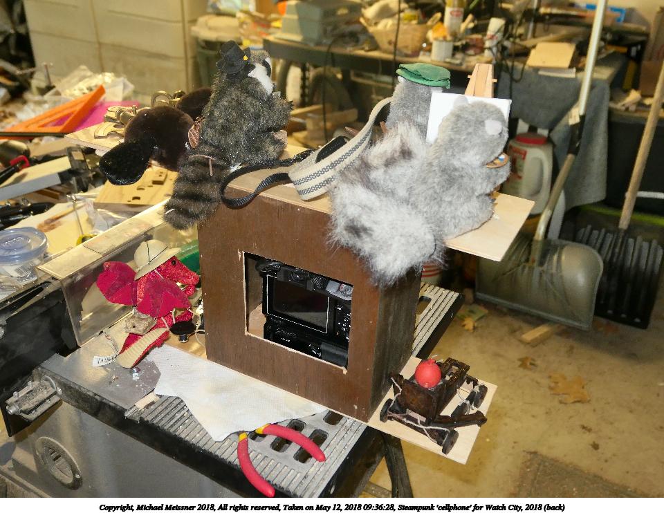 Picture #8: Steampunk 'cellphone' for Watch City, 2018 (back) Small: 960x742, 162,777 bytes (159K), (html file) Large: 4800x3600, 11,627,858 bytes (12M), (html file) Copyright, Michael Meissner 2018, All rights reserved Panasonic LX-10 camera f/2.5, ISO 800, flash, 1/60 sec, 10.5mm, auto mode, auto wb (5900), matrix metering, image stabilization 35mm equivalent focal length 31.0mm Programs used: crop, gimp Taken by Michael Meissner on May 12, 2018 09:36:28 Last modified on May 13, 2018 at 22:44 |