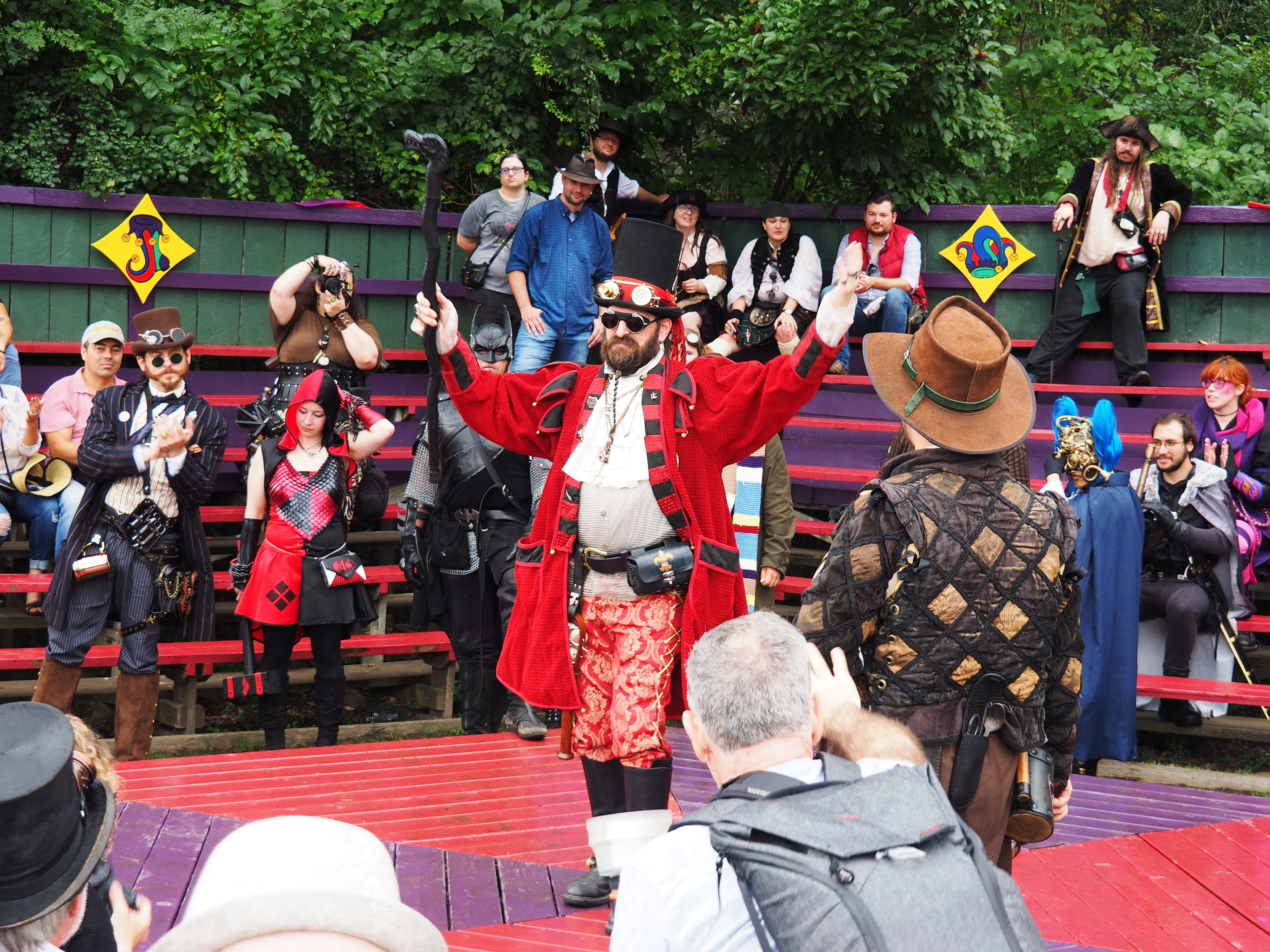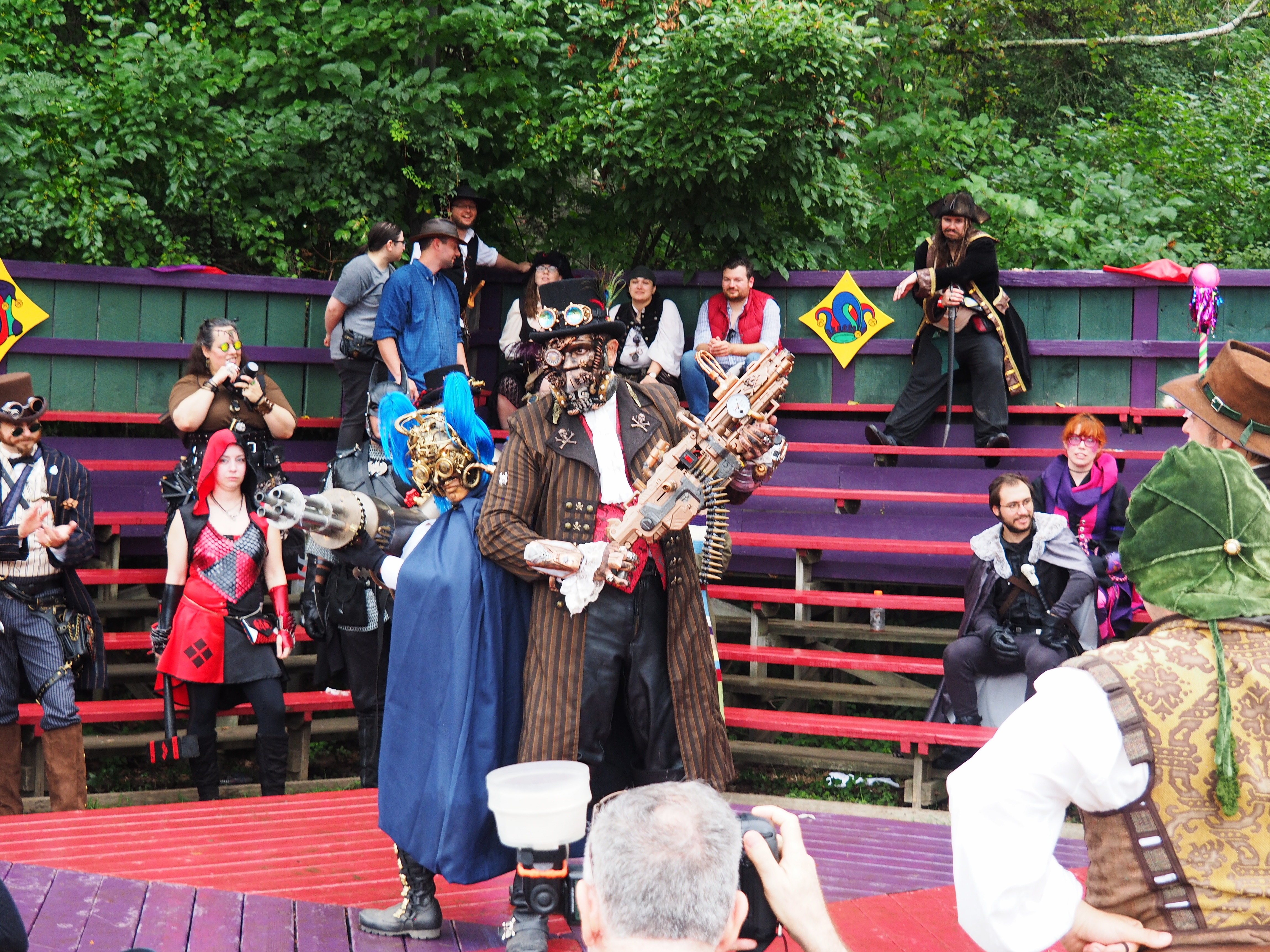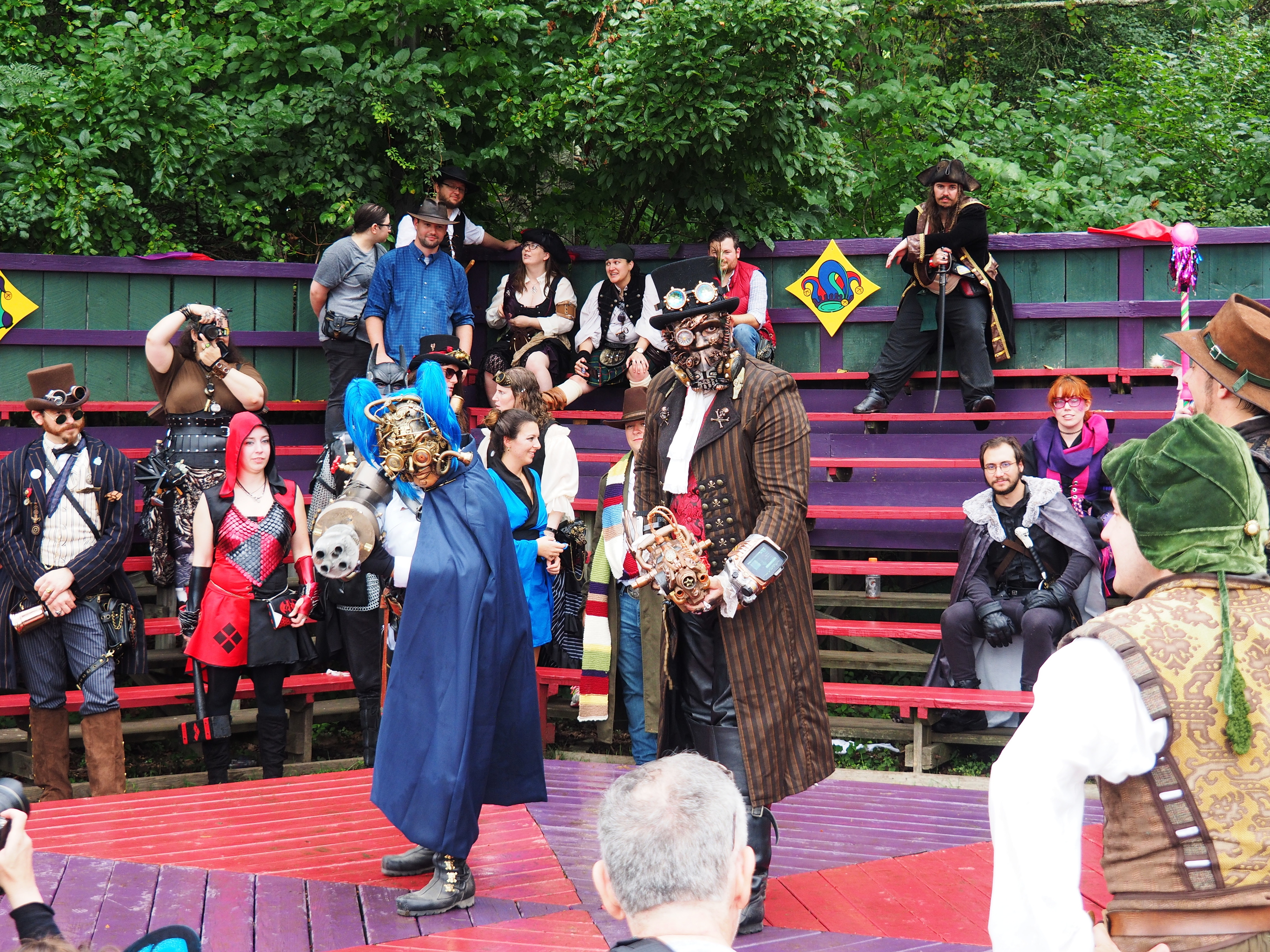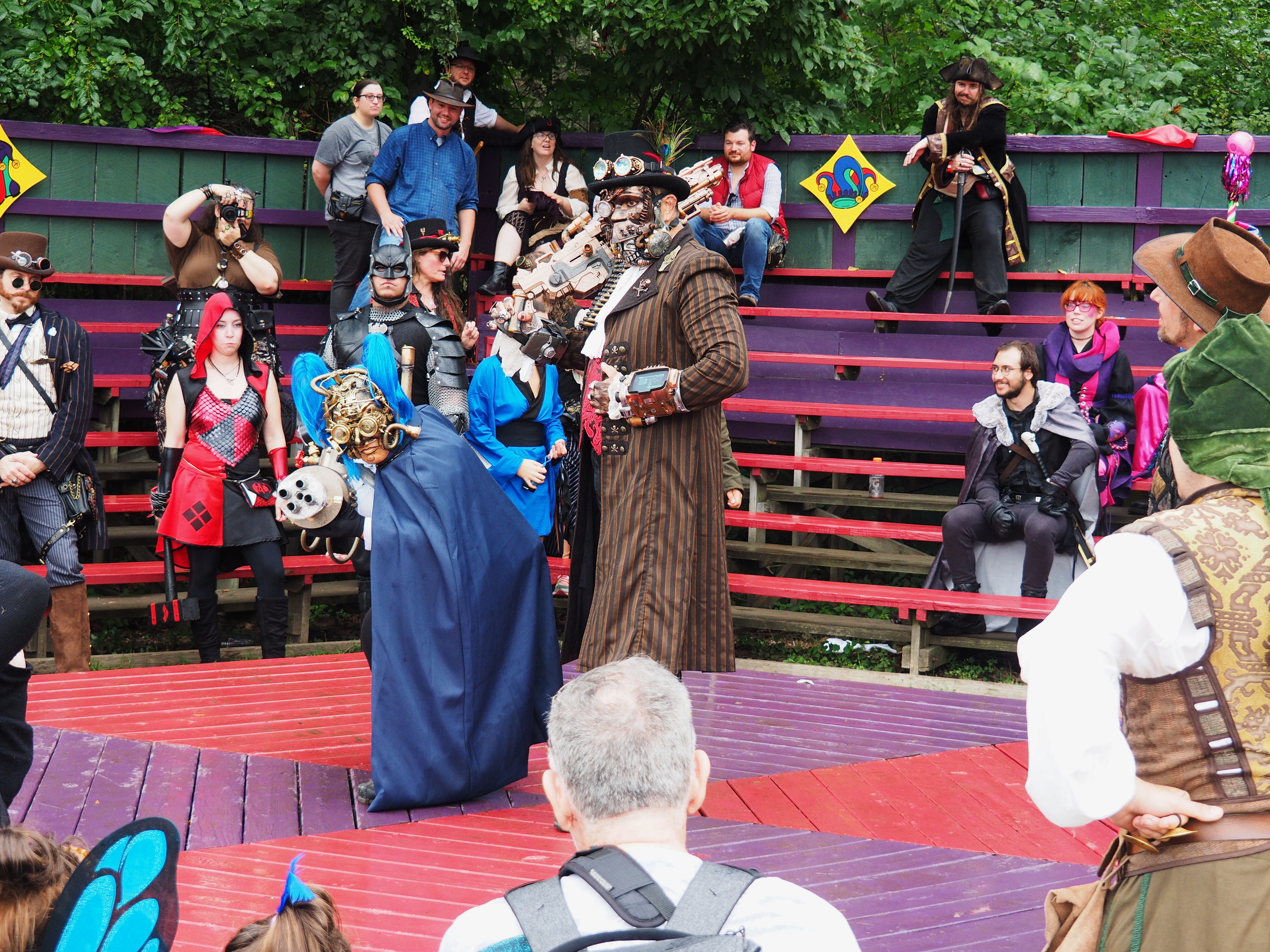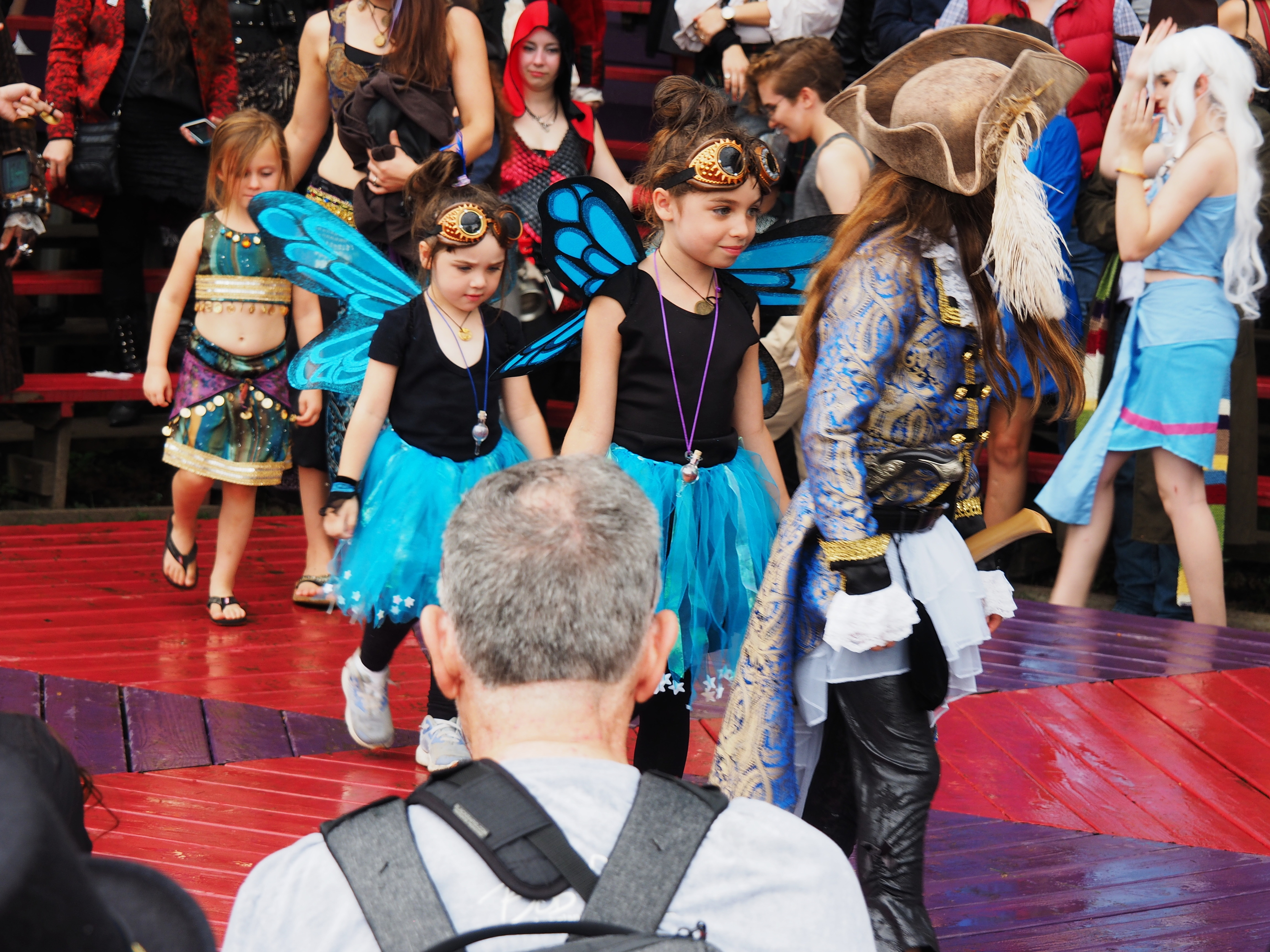 The theme for the weekend was time travelers weekend, and there was a patron costume contest in the afternoon. I carried my smaller steampunk camera box to the faire with the Olympus E-m5 mark I and Olympus 12-50mm lens inside. It was rather wet on the second day.