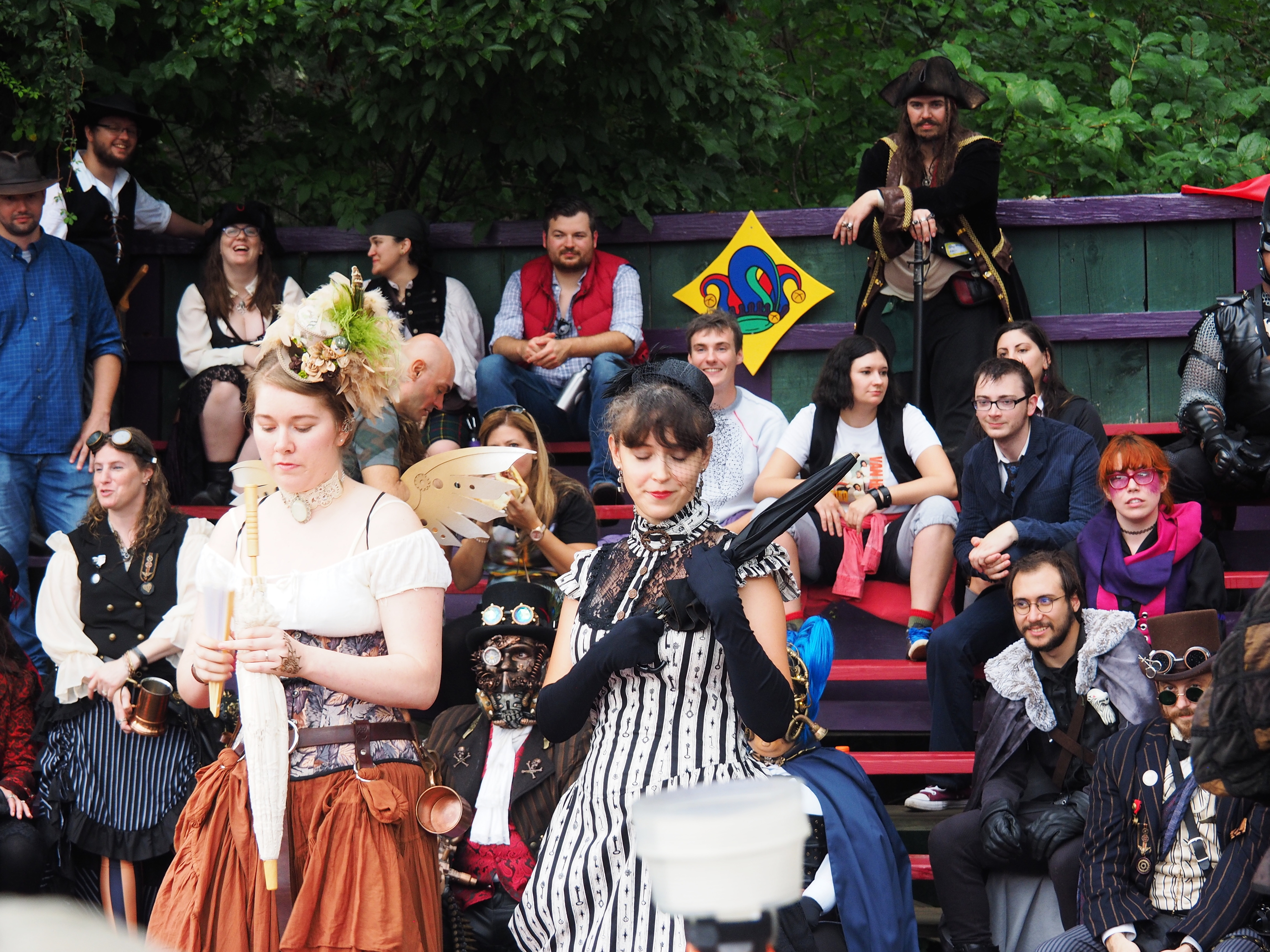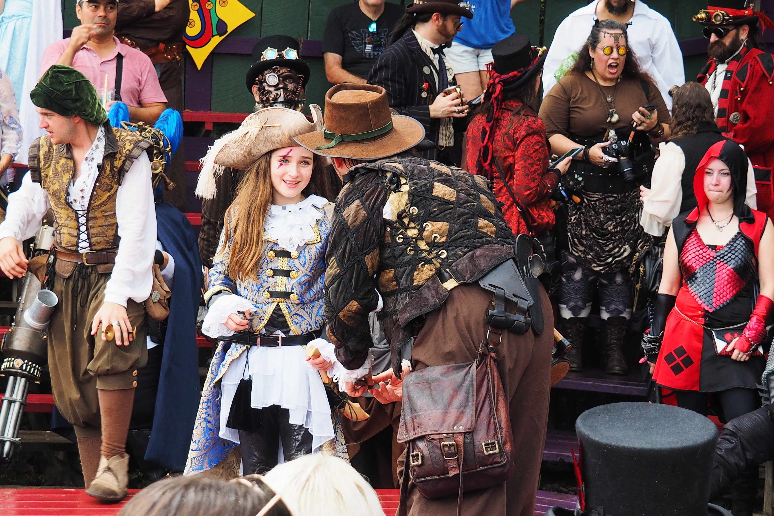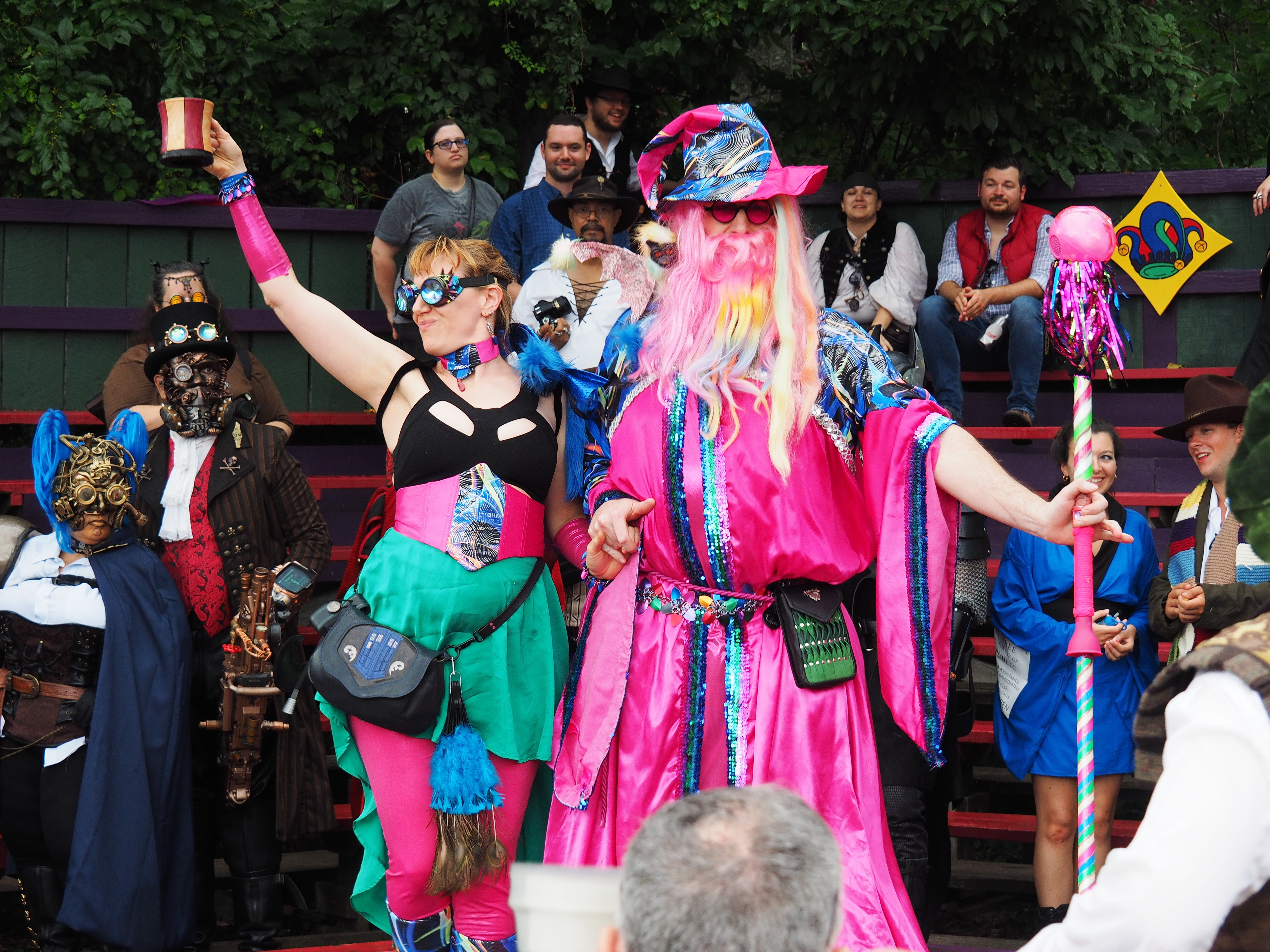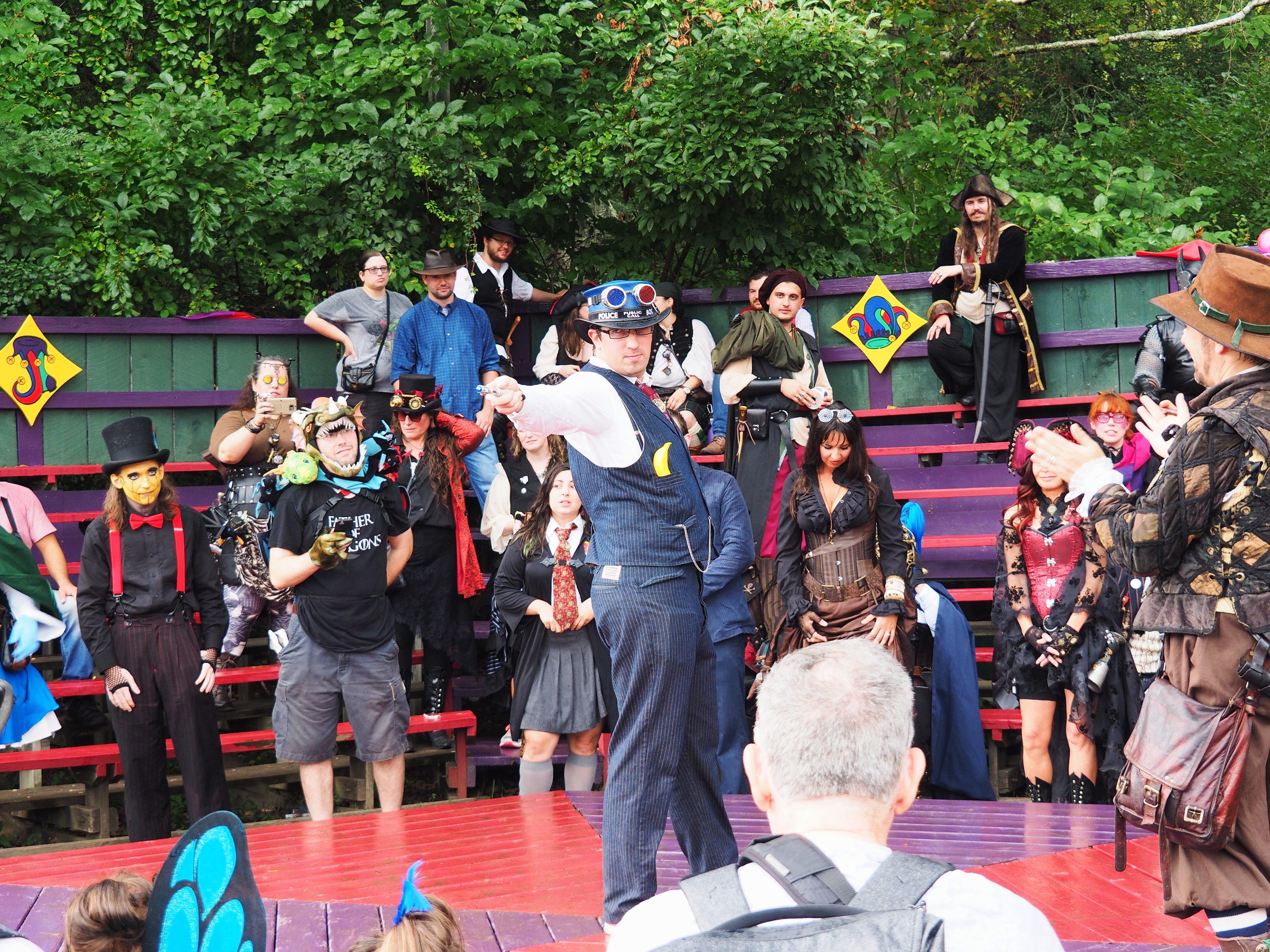 The theme for the weekend was time travelers weekend, and there was a patron costume contest in the afternoon. I carried my smaller steampunk camera box to the faire with the Olympus E-m5 mark I and Olympus 12-50mm lens inside. It was rather wet on the second day.