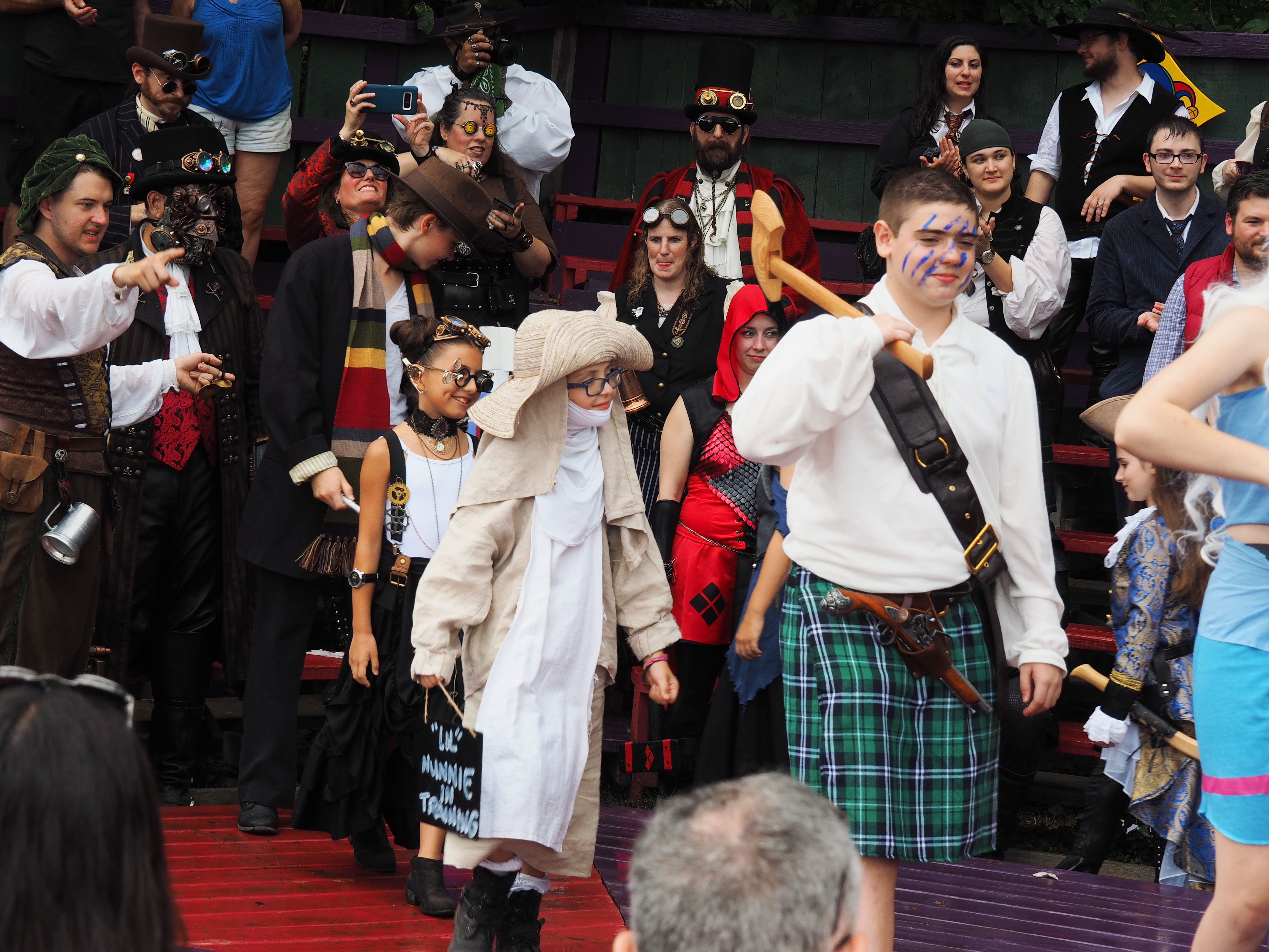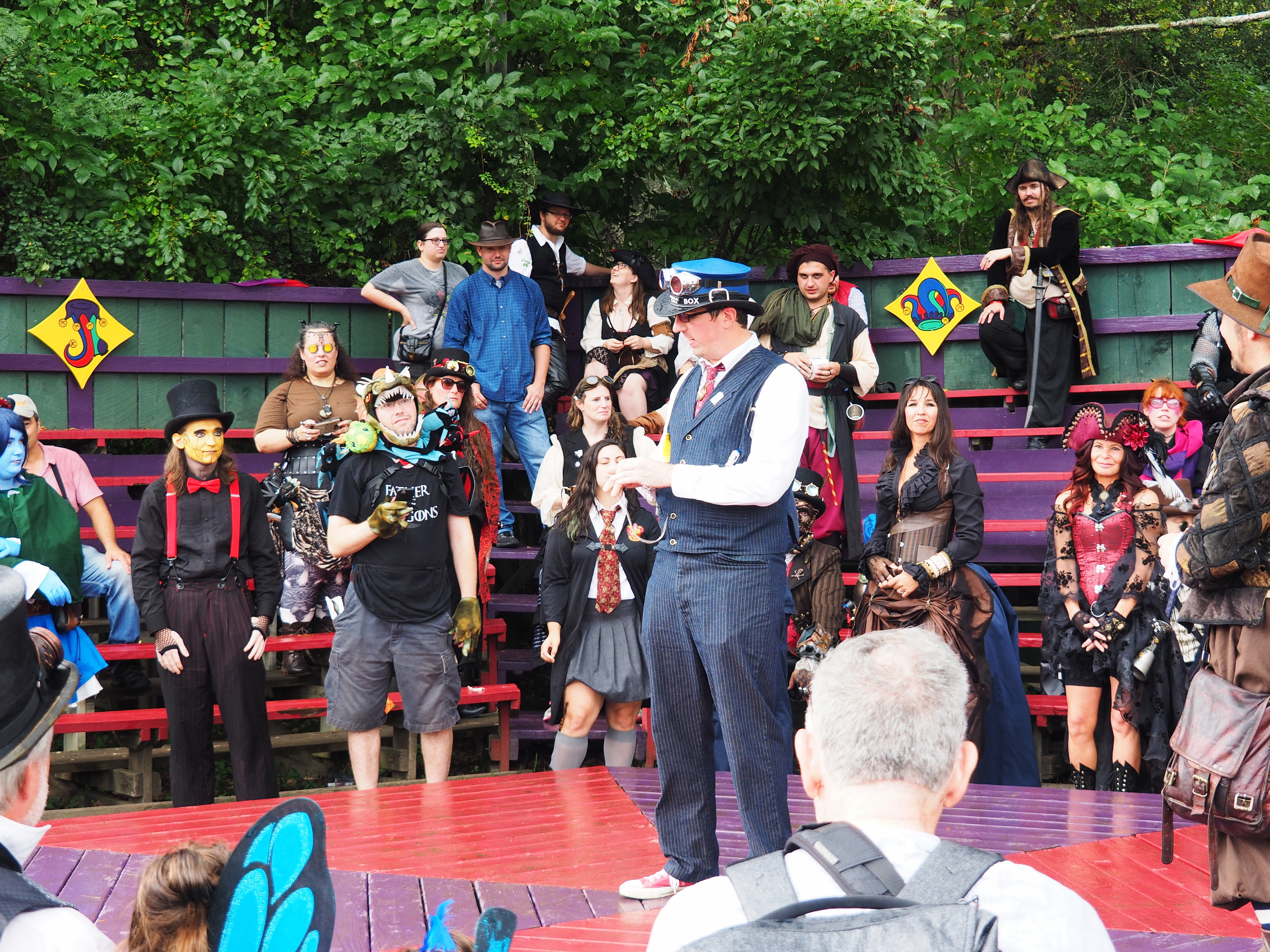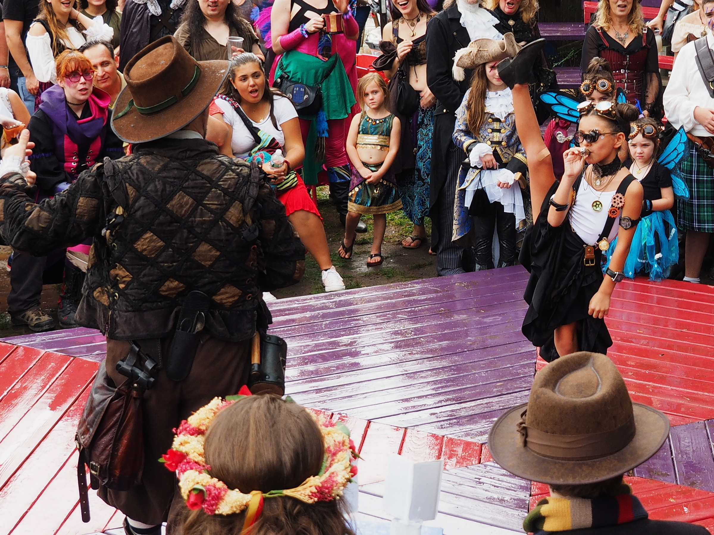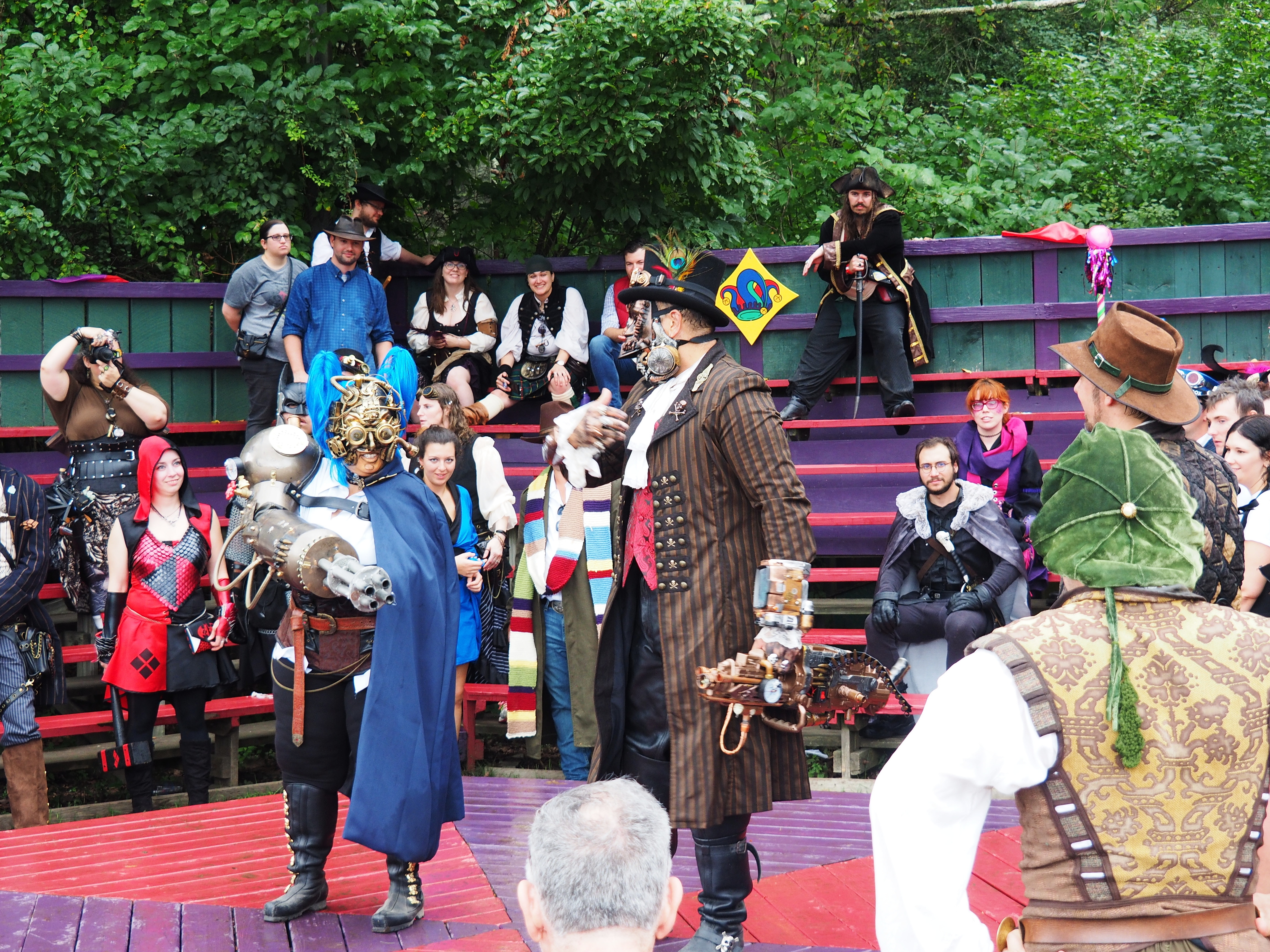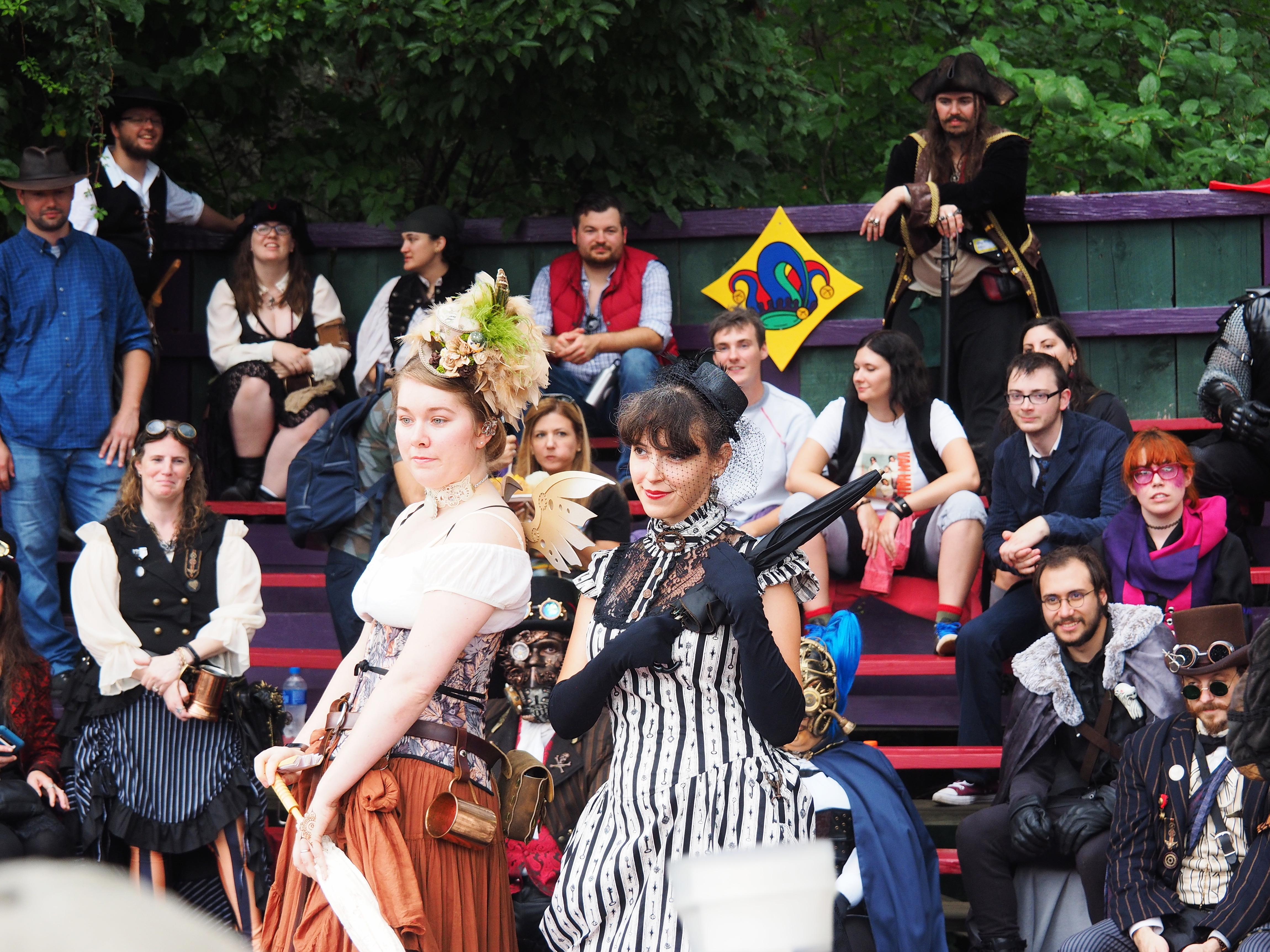 The theme for the weekend was time travelers weekend, and there was a patron costume contest in the afternoon. I carried my smaller steampunk camera box to the faire with the Olympus E-m5 mark I and Olympus 12-50mm lens inside. It was rather wet on the second day.
