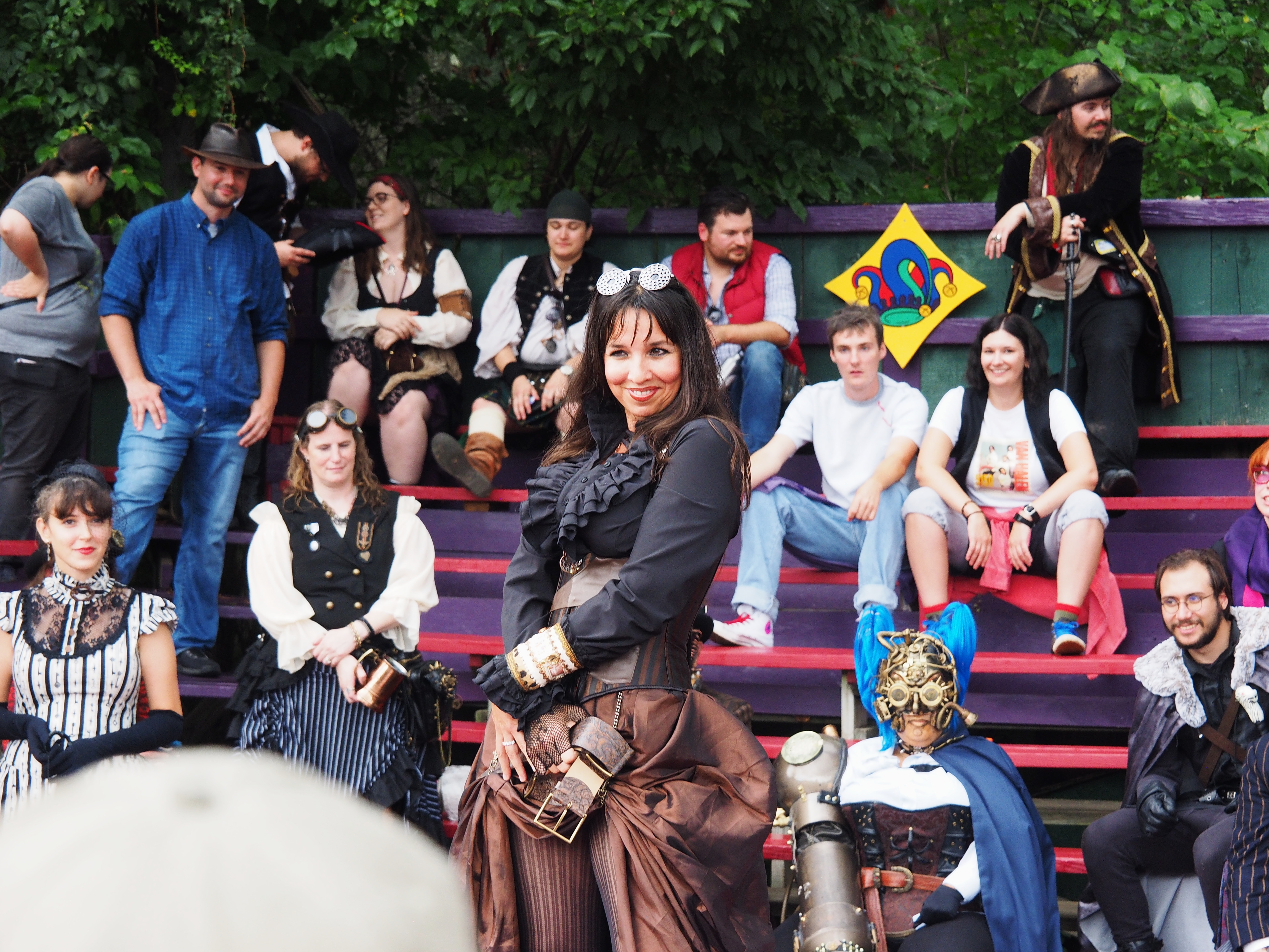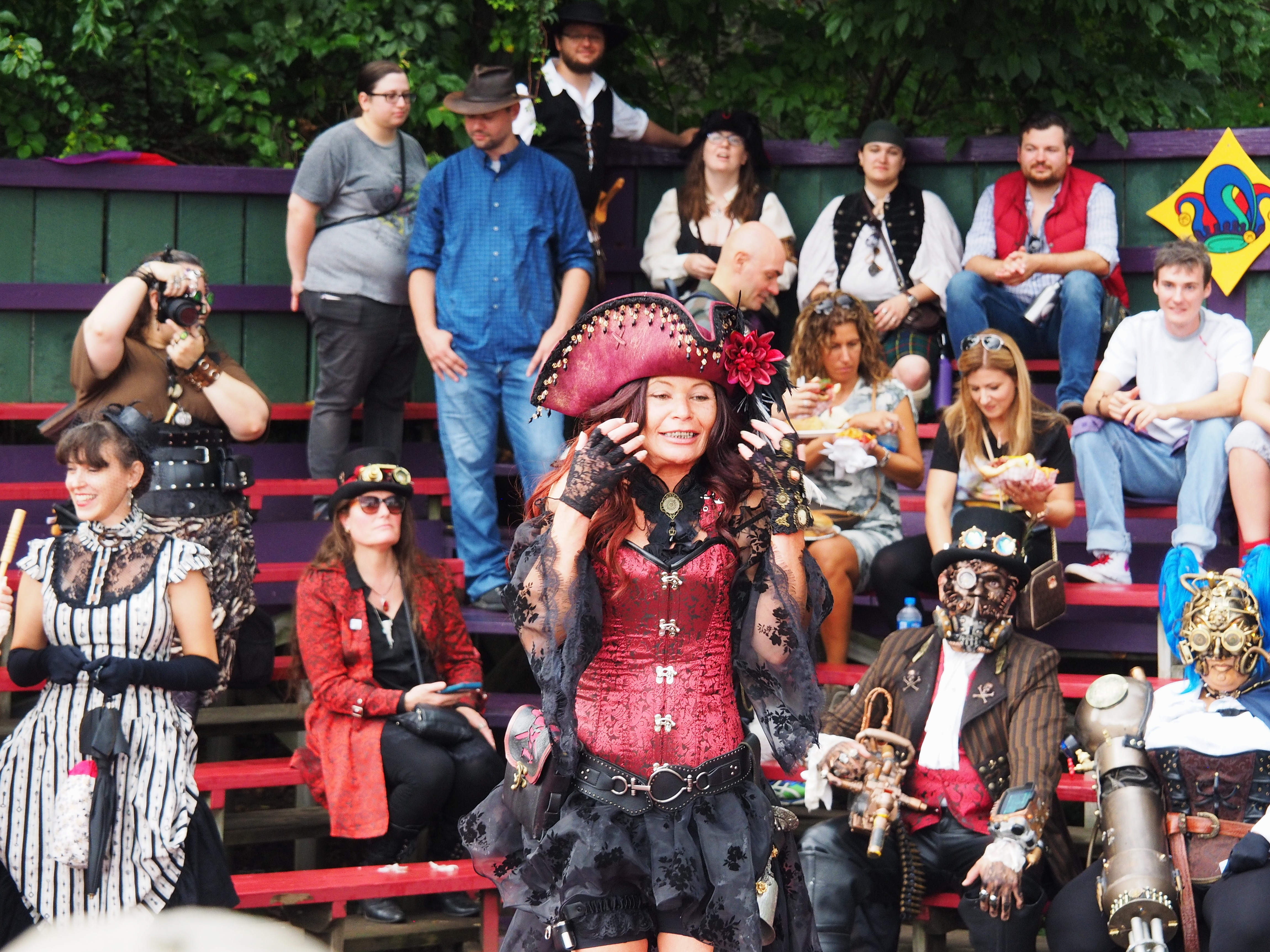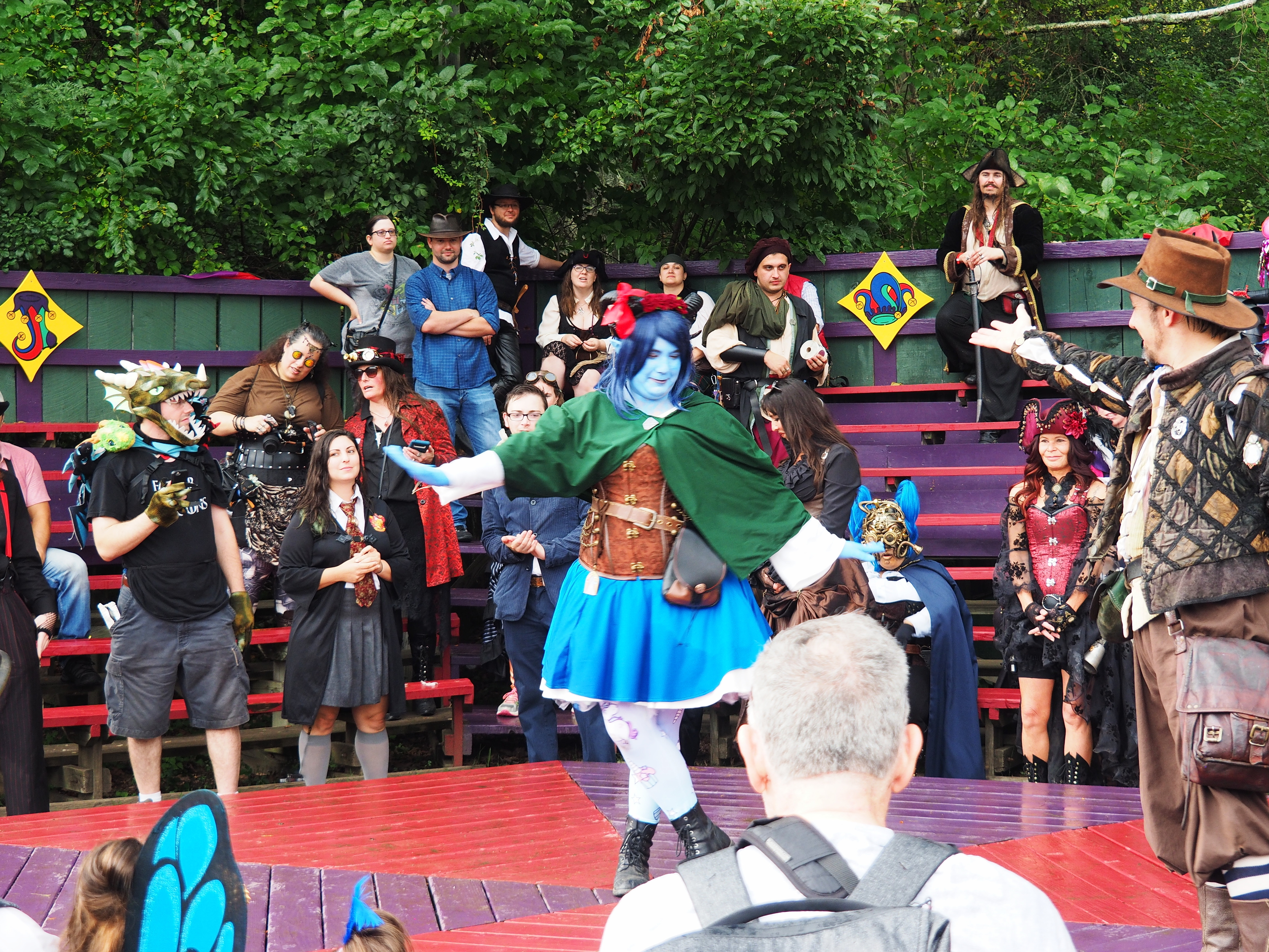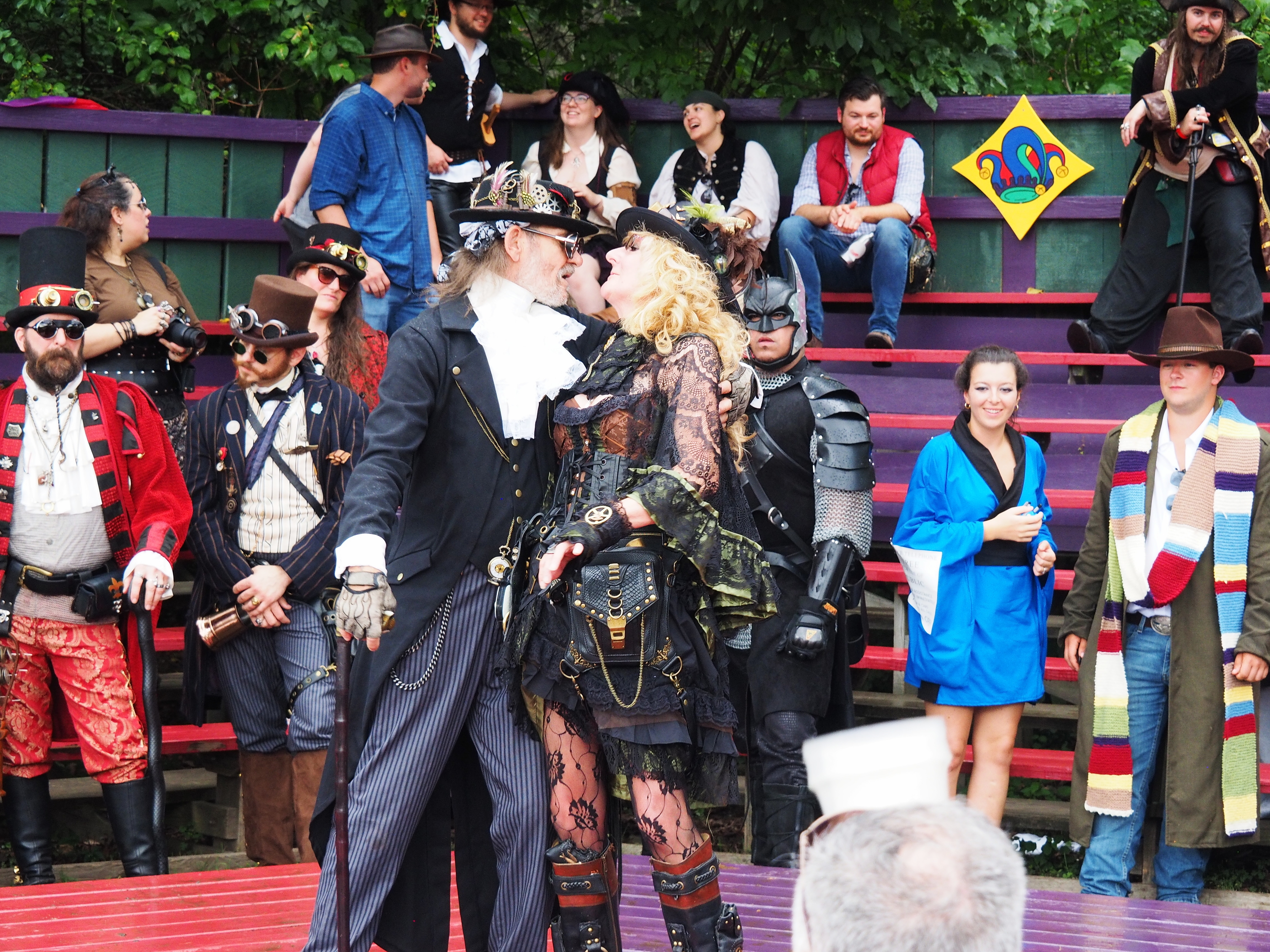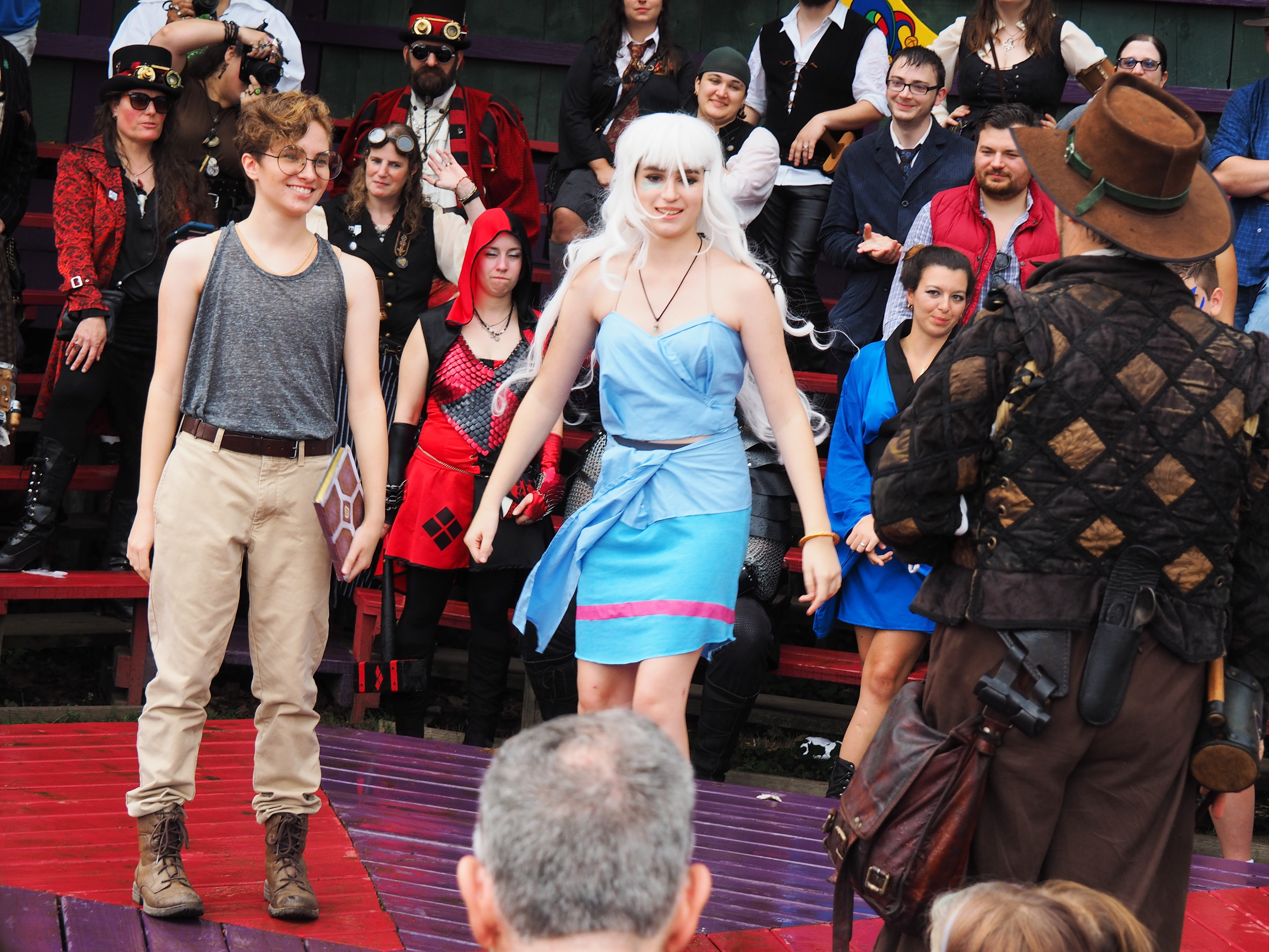 The theme for the weekend was time travelers weekend, and there was a patron costume contest in the afternoon. I carried my smaller steampunk camera box to the faire with the Olympus E-m5 mark I and Olympus 12-50mm lens inside. It was rather wet on the second day.