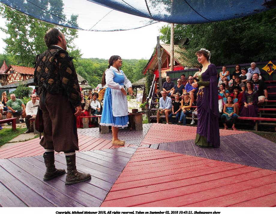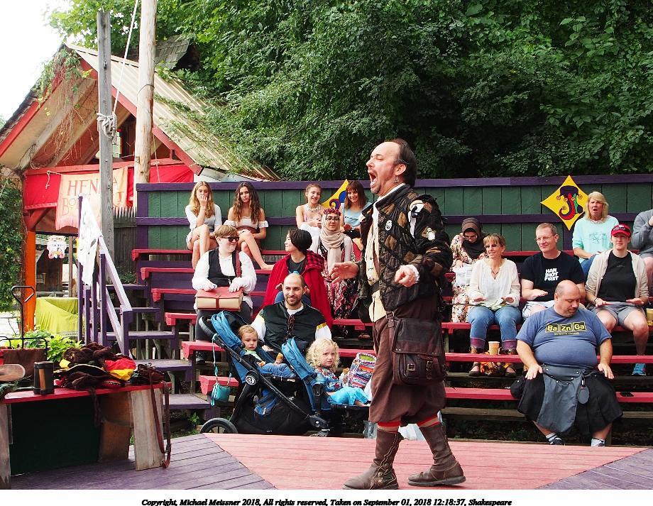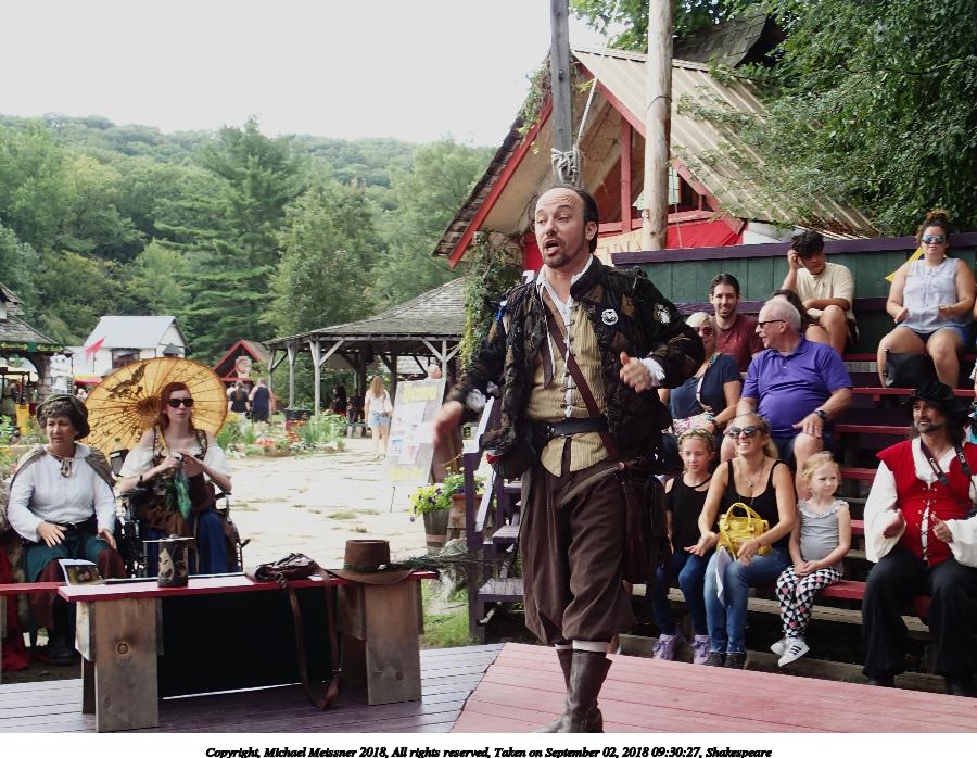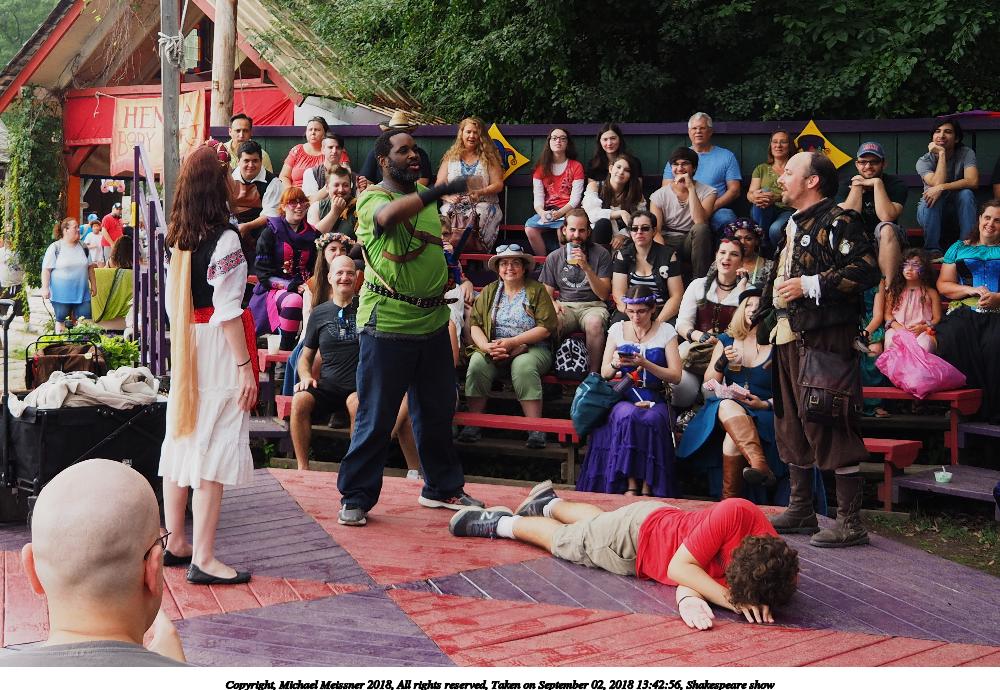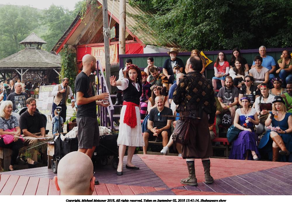 Picture #9: Shakespeare show #7 Small: 1000x690, 183,082 bytes (179K), (html file) Large: 3000x2000, 4,373,081 bytes (4.2M), (html file) Copyright, Michael Meissner 2018, All rights reserved Olympus E-M1-I camera with Olympus-m43 14-150mm-II f/4.0-5.6 lens f/4.5, ISO 200, 1/80 sec, 18.0mm, auto mode, vivid color, SHQ, matrix metering, IS Auto, noise reduction auto, anti-shock 35mm equivalent focal length 36.0mm Programs used: crop, gimp, raw therapee Taken by Michael Meissner on September 02, 2018 13:41:14 Last modified on November 14, 2018 at 09:18 |