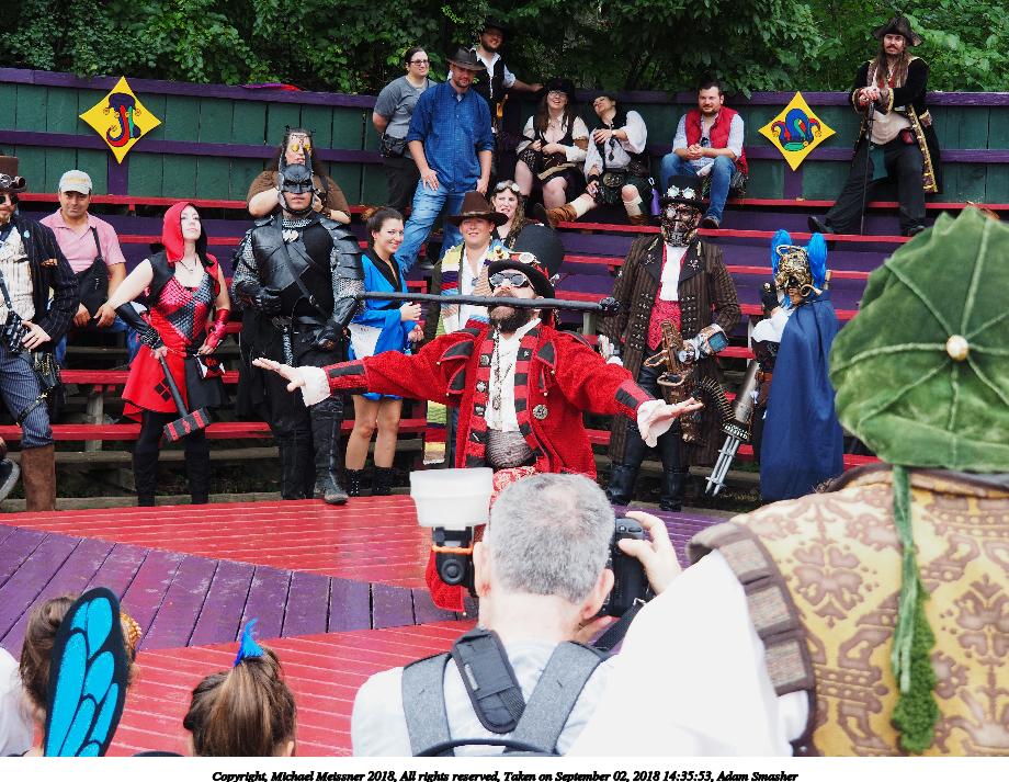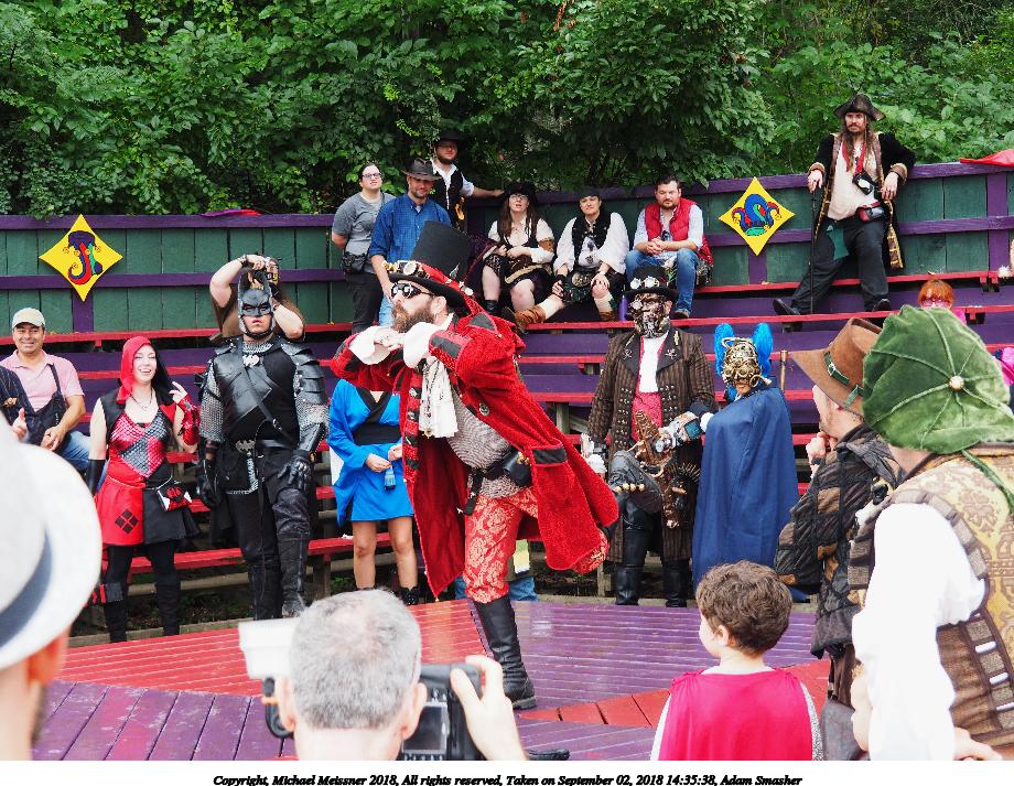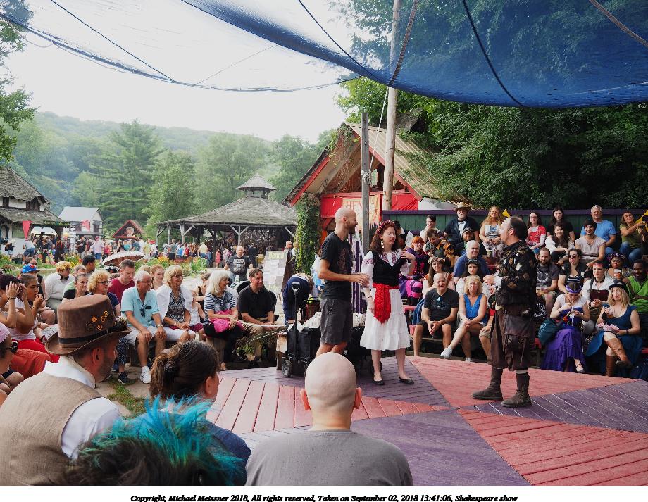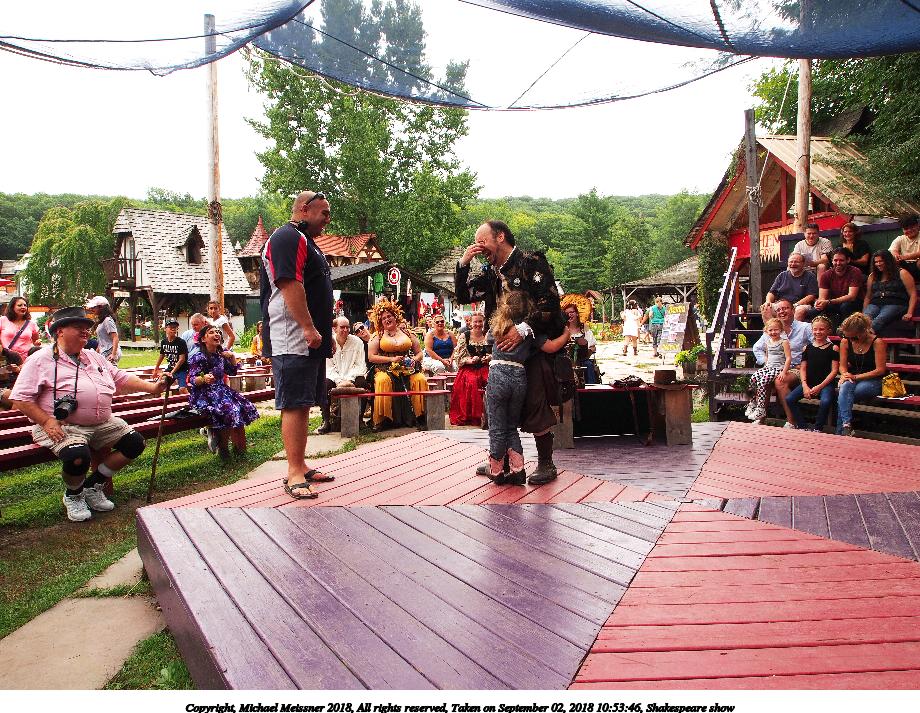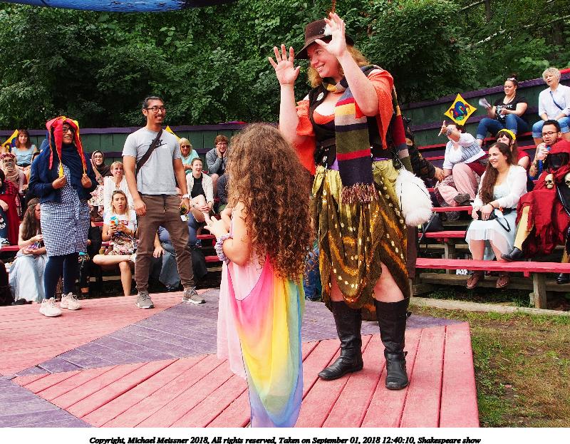 Picture #10: Shakespeare show #8 Small: 1000x690, 189,046 bytes (185K), (html file) Large: 3000x2000, 4,552,429 bytes (4.3M), (html file) Copyright, Michael Meissner 2018, All rights reserved Olympus E-M1-I camera with Olympus-m43 14-150mm-II f/4.0-5.6 lens f/4.5, ISO 200, 1/80 sec, 18.0mm, auto mode, vivid color, SHQ, matrix metering, IS Auto, noise reduction auto, anti-shock 35mm equivalent focal length 36.0mm Programs used: crop, gimp, raw therapee Taken by Michael Meissner on September 02, 2018 13:41:51 Last modified on November 14, 2018 at 09:19 |