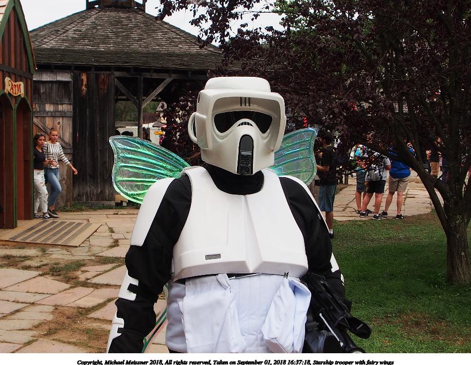 Picture #6: Starship trooper with fairy wings Small: 920x713, 167,686 bytes (164K), (html file) Large: 4600x3450, 3,284,217 bytes (3.1M), (html file) Copyright, Michael Meissner 2018, All rights reserved Olympus E-M5-I camera with Olympus-m43 12-50mm f/3.5-6.3 lens f/6.3, ISO 200, 1/250 sec, 12.0mm, auto mode, vivid color, matrix metering, digital zoom x2, IS1 (All Direction Shake IS), noise filter low 35mm equivalent focal length 48.0mm, digital zoom x2 Programs used: crop, raw therapee Taken by Michael Meissner on September 01, 2018 16:37:18 Last modified on November 13, 2018 at 21:55 |