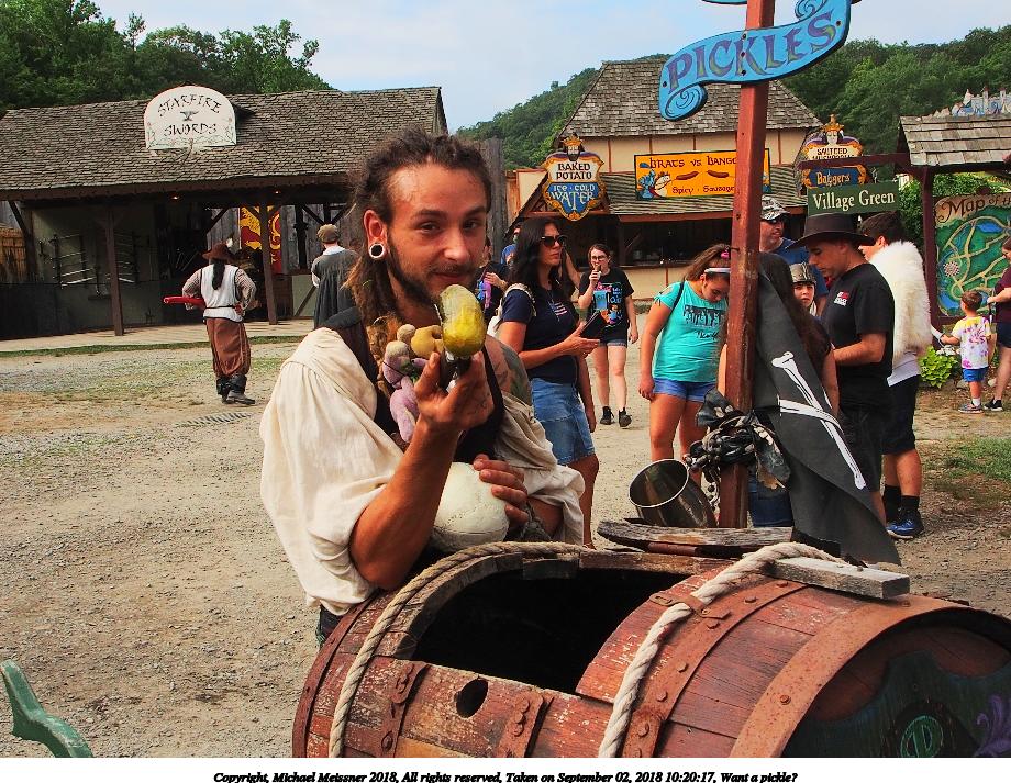 Picture #22: Want a pickle? Small: 920x713, 200,624 bytes (196K), (html file) Large: 4600x3450, 4,202,153 bytes (4.0M), (html file) Copyright, Michael Meissner 2018, All rights reserved Olympus E-M5-I camera with Olympus-m43 12-50mm f/3.5-6.3 lens f/7.1, ISO 200, 1/320 sec, 12.0mm, auto mode, vivid color, matrix metering, digital zoom x2, IS1 (All Direction Shake IS), noise filter low 35mm equivalent focal length 48.0mm, digital zoom x2 Programs used: crop, raw therapee Taken by Michael Meissner on September 02, 2018 10:20:17 Last modified on November 13, 2018 at 22:06 |