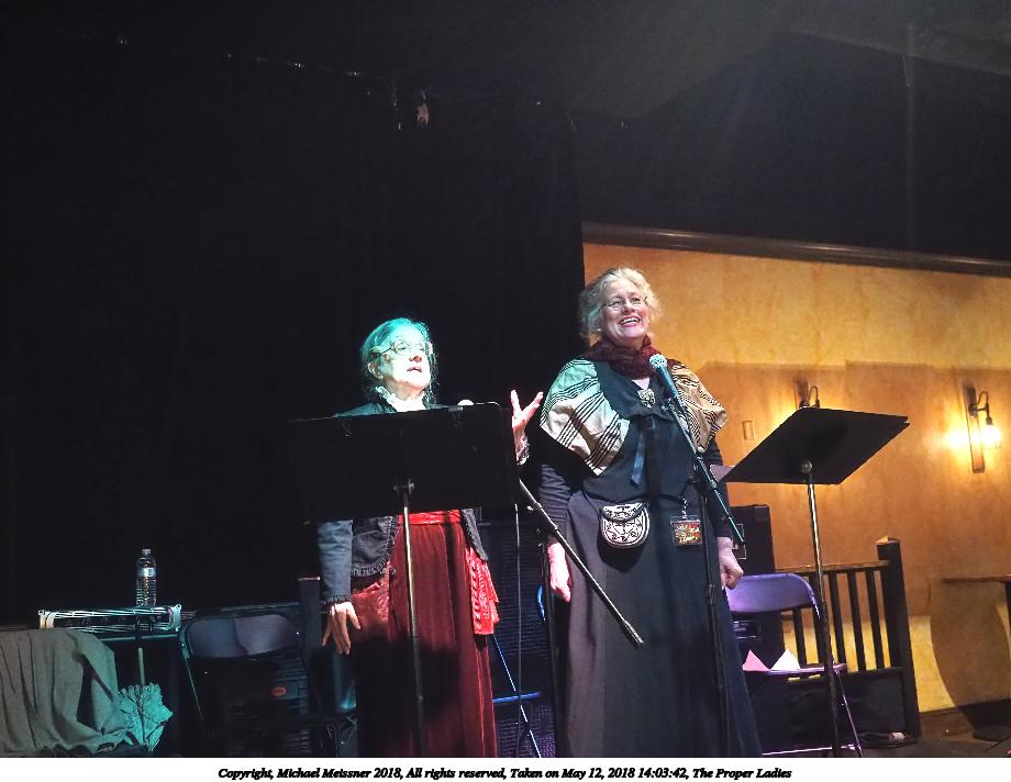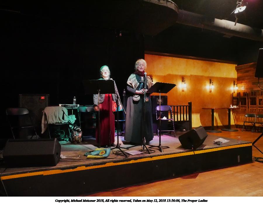 Picture #61: The Proper Ladies #3 Thumb: 460x345, 39,410 bytes (39K) Small: 920x712, 87,664 bytes (86K), (html file) Large: 4600x3450, 1,797,785 bytes (1.7M), (html file) Copyright, Michael Meissner 2018, All rights reserved Olympus E-M1-I camera with Olympus-m43 12-40mm f/2.8 lens f/2.8, ISO 6400, 1/60 sec, 22.0mm, auto mode, vivid color, SHQ, matrix metering, bias -0.7, IS Auto, noise reduction auto, anti-shock 35mm equivalent focal length 44.0mm Programs used: crop, raw therapee Taken by Michael Meissner on May 12, 2018 14:03:42 Last modified on May 20, 2018 at 00:59 |