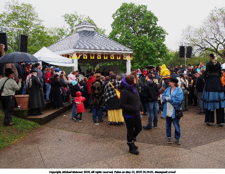 Picture #55: Steampunk crowd Thumb: 460x345, 57,539 bytes (57K) Small: 920x712, 229,036 bytes (224K), (html file) Large: 4600x3450, 6,176,539 bytes (5.9M), (html file) Copyright, Michael Meissner 2018, All rights reserved Olympus E-M5-I camera with Olympus 14-54mm-II f/2.8-3.5 lens f/3.5, ISO 200, 1/100 sec, 14.0mm, auto mode, vivid color, matrix metering, IS1 (All Direction Shake IS), noise filter low 35mm equivalent focal length 28.0mm Extra equipment used: Taken with my steampunk camera Programs used: crop, raw therapee Taken by Michael Meissner on May 12, 2018 16:16:01 Last modified on May 20, 2018 at 00:45 |
