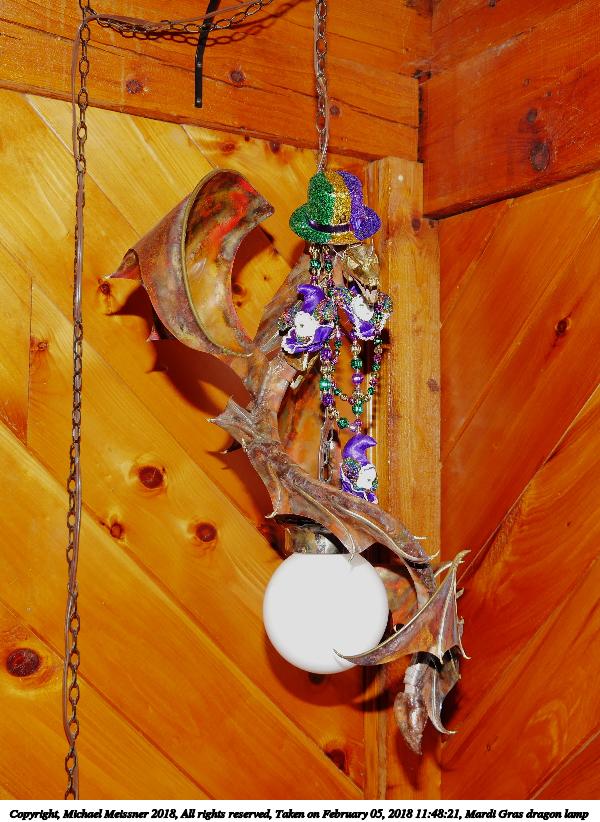 Picture #64: Mardi Gras dragon lamp 600x822, 126,348 bytes (124K), (html file) Copyright, Michael Meissner 2018, All rights reserved Panasonic G85 camera with Olympus-m43 14-150mm-II f/4.0-5.6 lens f/4.1, ISO 200, flash, 1/60 sec, 15.0mm, auto mode, auto wb (6100), matrix metering, image stabilization 35mm equivalent focal length 30.0mm Programs used: crop, raw therapee Taken by Michael Meissner on February 05, 2018 11:48:21 Last modified on February 05, 2018 at 23:44 |