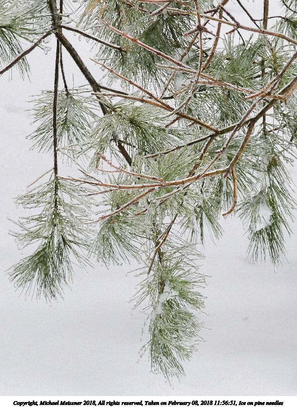 Picture #53: Ice on pine needles 675x922, 166,454 bytes (163K), (html file) Copyright, Michael Meissner 2018, All rights reserved Panasonic G85 camera with Panasonic 100-300mm-II f/4.0-5.6 lens f/5.6, ISO 500, 1/640 sec, 300.0mm, auto mode, auto wb (6000), matrix metering, digital zoom x2, noise reduction 1 35mm equivalent focal length 1200.0mm, digital zoom x2 Programs used: crop, raw therapee, rotate left Taken by Michael Meissner on February 08, 2018 11:56:04 Last modified on February 09, 2018 at 10:21 This picture is one of my favorites. |