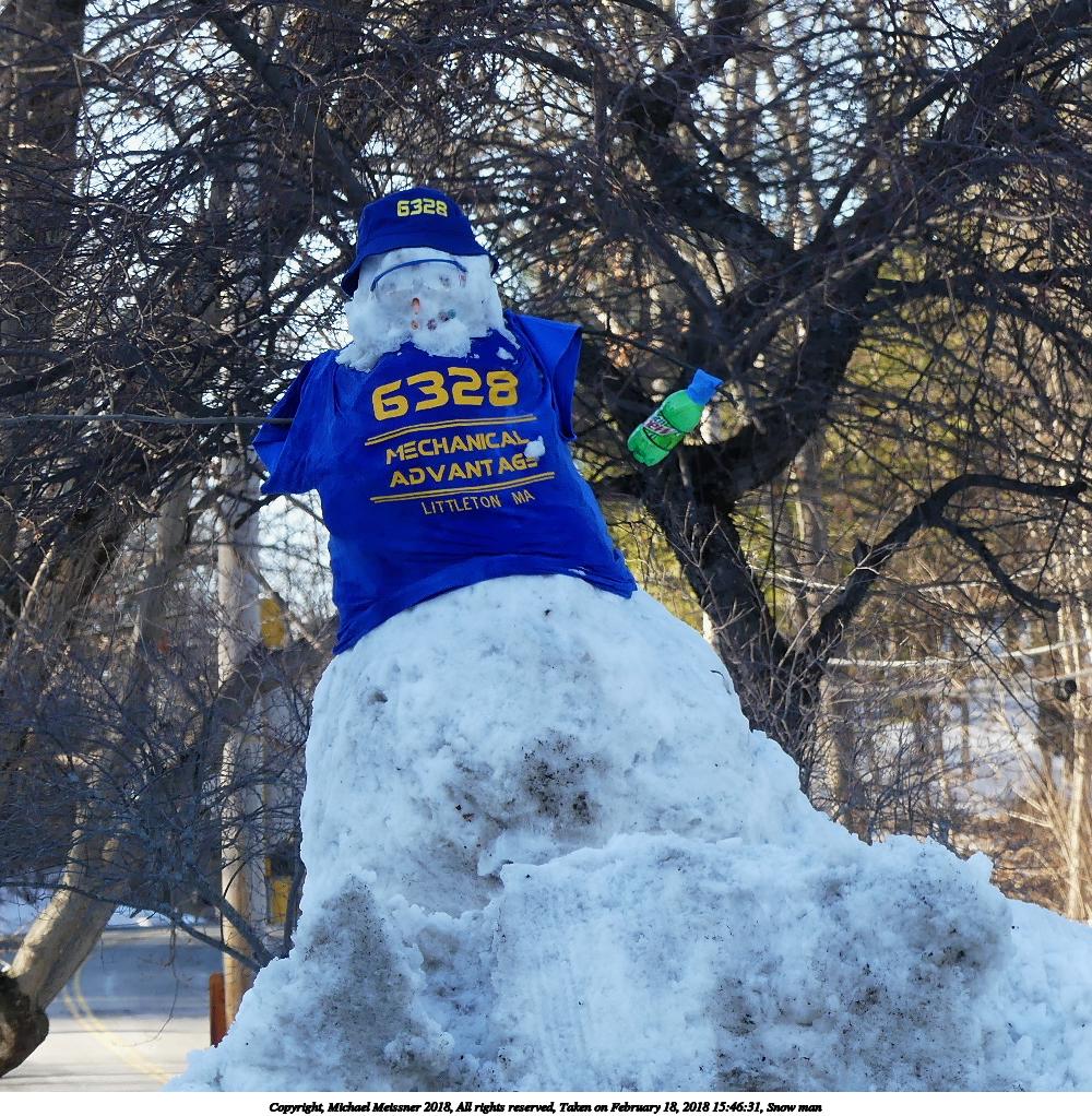 Picture #8: Snow man 1000x1022, 290,173 bytes (284K), (html file) Copyright, Michael Meissner 2018, All rights reserved Panasonic FZ300 camera f/3.5, ISO 100, 1/160 sec, 27.8mm, auto mode, auto wb (6000), matrix metering, image stabilization, normal color mode 35mm equivalent focal length 155.0mm Programs used: crop, gimp, raw therapee Taken by Michael Meissner on February 18, 2018 15:46:31 Last modified on February 18, 2018 at 19:47 |