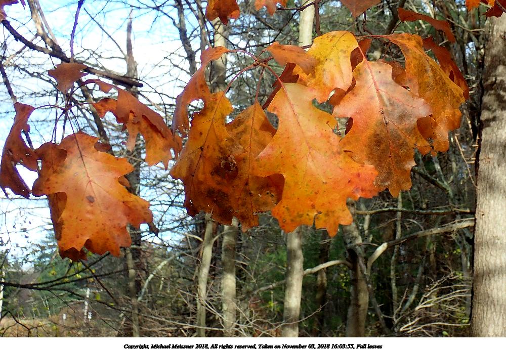Picture #45: Fall leaves 533x823, 115,969 bytes (114K), (html file) Copyright, Michael Meissner 2018, All rights reserved Olympus TG-5 camera f/3.4, ISO 160, 1/100 sec, 9.6mm, auto mode, vivid color, SHQ, matrix metering, IS1 (All Direction Shake IS), noise reduction 4 35mm equivalent focal length 53.0mm Programs used: gimp, rotate left Taken by Michael Meissner on November 03, 2018 16:03:52 Last modified on November 03, 2018 at 17:00 |
