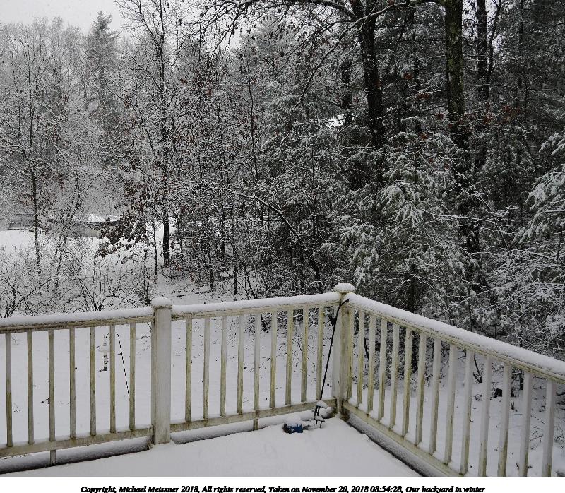 Picture #4: Our backyard in winter 800x698, 226,239 bytes (221K), (html file) Copyright, Michael Meissner 2018, All rights reserved Panasonic G85 camera with Panasonic 12-60mm f/3.5-5.6 lens f/4.0, ISO 200, 1/125 sec, 12.0mm, auto mode, auto wb (7100), matrix metering, noise reduction 1 35mm equivalent focal length 24.0mm Programs used: crop, gimp, rotate left Taken by Michael Meissner on November 20, 2018 08:54:28 Last modified on November 22, 2018 at 00:35 |