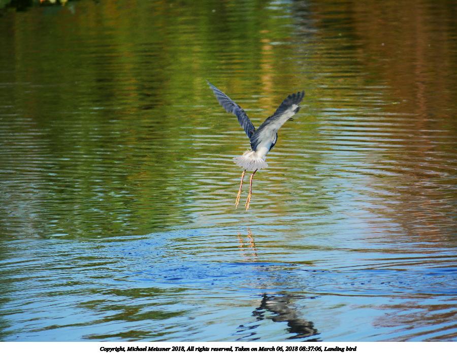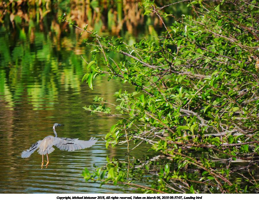 Picture #13: Landing bird #3 900x697, 149,328 bytes (146K), (html file) Copyright, Michael Meissner 2018, All rights reserved Panasonic G85 camera with Panasonic 100-300mm-II f/4.0-5.6 lens f/5.6, ISO 200, 1/640 sec, 300.0mm, auto mode, auto wb (5500), matrix metering, bias -0.7, continous focus, noise reduction 1 35mm equivalent focal length 600.0mm Programs used: crop, raw therapee Taken by Michael Meissner on March 06, 2018 08:37:06 Last modified on April 01, 2018 at 23:01 This picture is one of my favorites. |