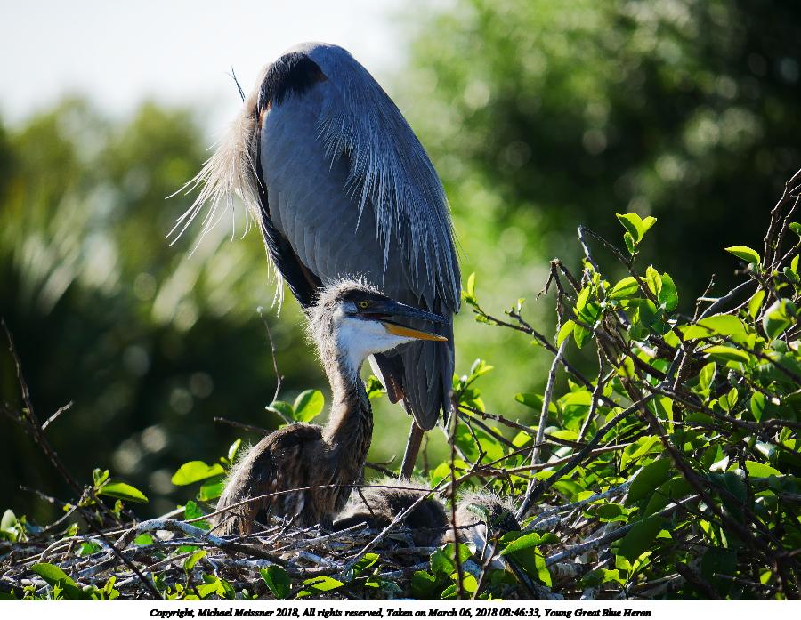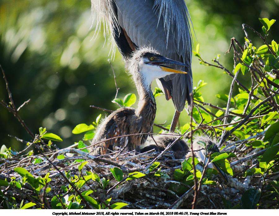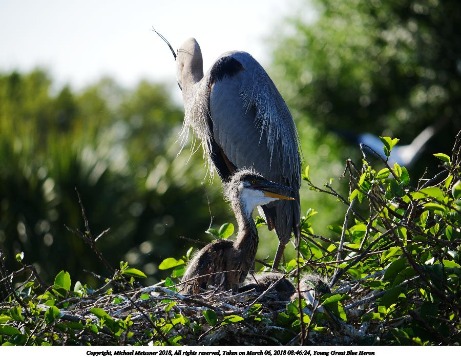 Picture #125: Great Blue Heron and young #4 920x712, 144,455 bytes (142K), (html file) Copyright, Michael Meissner 2018, All rights reserved Olympus E-M1-I camera with Panasonic 100-300mm-II lens f/8.0, ISO 200, 1/1000 sec, 100.0mm, auto mode, vivid color, SHQ, matrix metering, bias -0.3, digital zoom x2, IS1 (All Direction Shake IS), noise filter low 35mm equivalent focal length 401.0mm, digital zoom x2 Programs used: adjusttime, crop, raw therapee Taken by Michael Meissner on March 02, 2018 10:01:47 Last modified on March 30, 2018 at 23:25 |