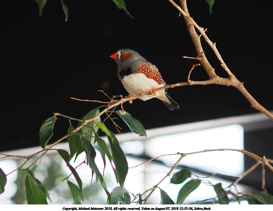Picture #79: Zebra finch 920x712, 91,462 bytes (90K), (html file) Copyright, Michael Meissner 2018, All rights reserved Olympus E-M1-I camera with Olympus-m43 45mm f/1.8 lens f/2.2, ISO 200, 1/160 sec, 45.0mm, auto mode, vivid color, SHQ, matrix metering, bias -0.3, digital zoom x2, IS Auto, noise reduction auto, anti-shock 35mm equivalent focal length 180.0mm, digital zoom x2 Programs used: crop, raw therapee Taken by Michael Meissner on August 07, 2018 12:35:36 Last modified on September 18, 2018 at 00:00 |