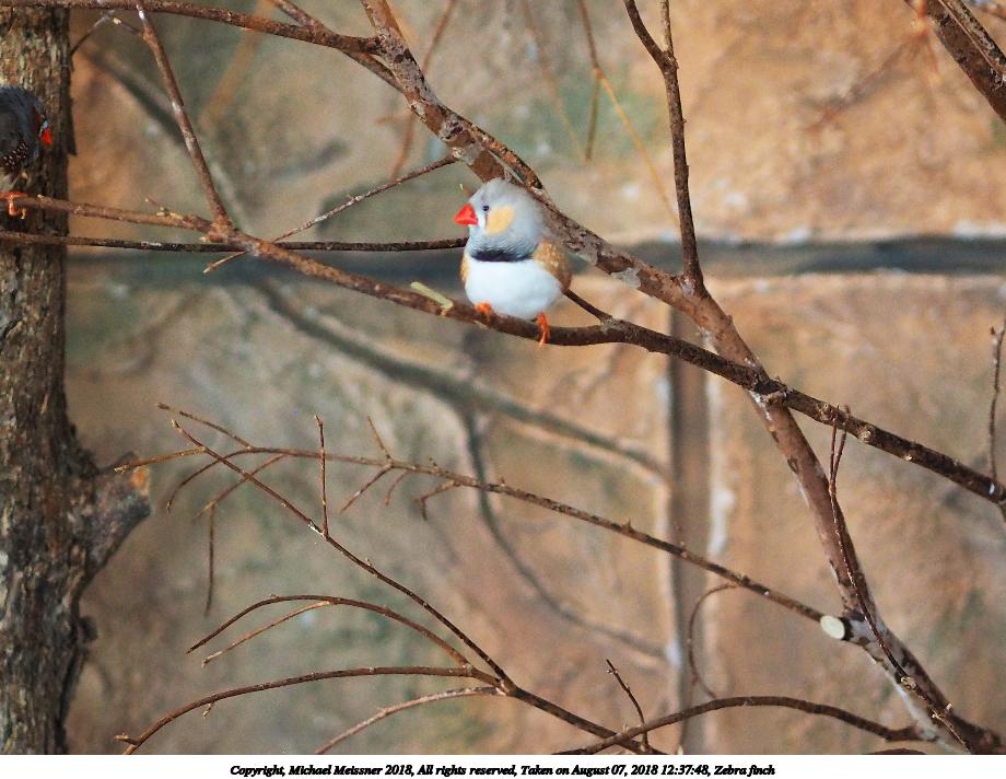 Picture #78: Zebra finch #2 920x712, 113,841 bytes (112K), (html file) Copyright, Michael Meissner 2018, All rights reserved Olympus E-M1-I camera with Olympus-m43 45mm f/1.8 lens f/1.8, ISO 1000, 1/100 sec, 45.0mm, auto mode, vivid color, SHQ, matrix metering, bias -0.3, digital zoom x2, IS Auto, noise reduction auto, anti-shock 35mm equivalent focal length 180.0mm, digital zoom x2 Programs used: crop, raw therapee Taken by Michael Meissner on August 07, 2018 12:37:48 Last modified on September 18, 2018 at 00:00 |