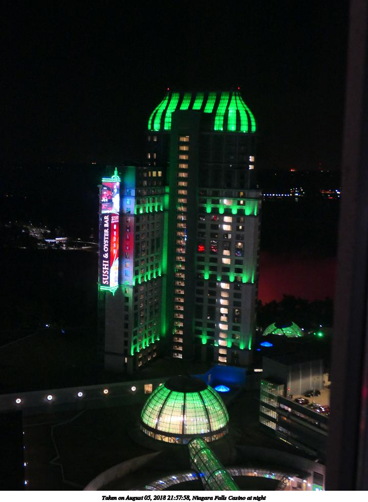 Picture #3: Niagara Falls Casino at night 720x982, 104,853 bytes (103K), (html file) Panasonic LX-10 camera f/2.8, ISO 1600, 1/10 sec, 15.9mm, auto mode, auto wb (3000), matrix metering, bias 0.3, image stabilization 35mm equivalent focal length 47.0mm Extra equipment used: Taken through hotel window Programs used: crop, rotate Taken by Michael Meissner on August 05, 2018 21:57:58 Last modified on August 19, 2018 at 18:24 |
