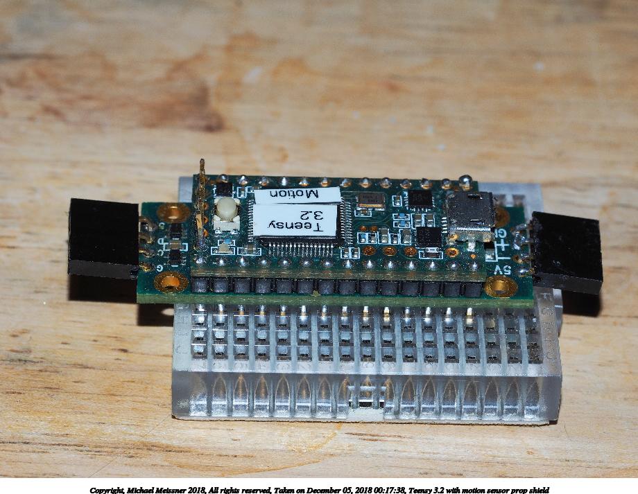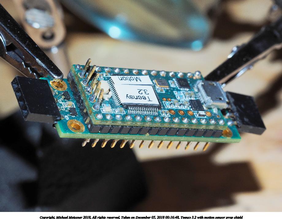 Picture #5: Teensy 3.2 with motion sensor prop shield 920x713, 107,800 bytes (106K), (html file) Copyright, Michael Meissner 2018, All rights reserved Olympus E-M1-I camera with Olympus-m43 60mm f/2.8 lens f/8.0, ISO 320, flash, 1/60 sec, 60.0mm, aperture priority, vivid color, SHQ, matrix metering, IS Auto, noise reduction auto, anti-shock 35mm equivalent focal length 120.0mm Programs used: crop, gimp, raw therapee Taken by Michael Meissner on December 05, 2018 00:16:48 Last modified on December 05, 2018 at 01:01 |