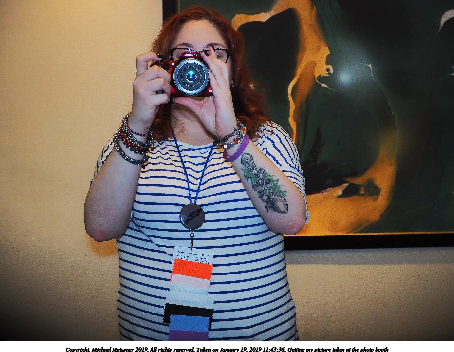 Picture #4: Getting my picture taken at the photo booth Thumb: 460x345, 44,758 bytes (44K) Small: 920x713, 123,907 bytes (122K), (html file) Large: 4600x3450, 4,059,380 bytes (3.9M), (html file) Copyright, Michael Meissner 2019, All rights reserved Olympus E-M10-II camera with Olympus-m43 12-50mm f/3.5-6.3 lens f/5.2, ISO 800, flash (-0.33 flash compensation), 1/60 sec, 26.0mm, auto mode, vivid color, auto gradation, SHQ, matrix metering, IS Auto, noise reduction auto 35mm equivalent focal length 52.0mm Programs used: crop, raw therapee Taken by Michael Meissner on January 19, 2019 11:43:36 Last modified on April 10, 2019 at 23:10 |