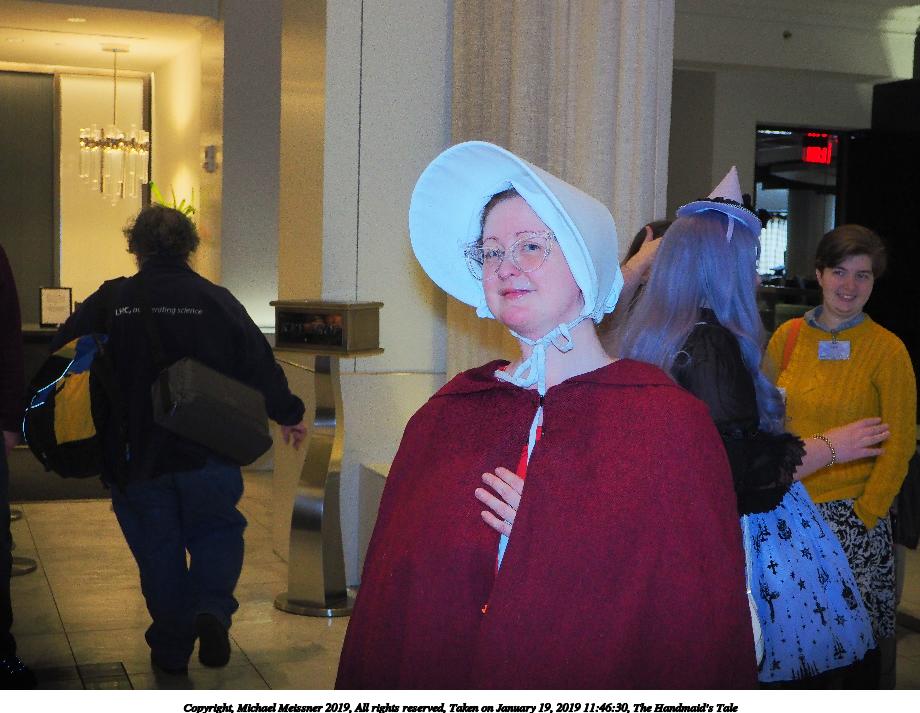 Picture #5: The Handmaid's Tale Thumb: 460x345, 42,926 bytes (42K) Small: 920x713, 104,628 bytes (103K), (html file) Large: 4600x3450, 3,488,873 bytes (3.3M), (html file) Copyright, Michael Meissner 2019, All rights reserved Olympus E-M10-II camera with Olympus-m43 12-50mm f/3.5-6.3 lens f/5.2, ISO 800, flash (-0.33 flash compensation), 1/60 sec, 26.0mm, auto mode, vivid color, auto gradation, SHQ, matrix metering, IS Auto, noise reduction auto 35mm equivalent focal length 52.0mm Programs used: crop, raw therapee Taken by Michael Meissner on January 19, 2019 11:46:30 Last modified on April 10, 2019 at 23:11 |