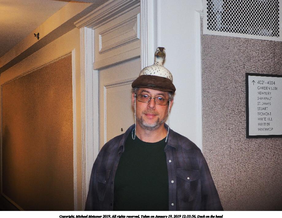 Picture #8: Duck on the head Thumb: 460x345, 41,369 bytes (41K) Small: 920x713, 134,098 bytes (131K), (html file) Large: 4600x3450, 4,503,448 bytes (4.3M), (html file) Copyright, Michael Meissner 2019, All rights reserved Olympus E-M10-II camera with Olympus-m43 12-50mm f/3.5-6.3 lens f/5.2, ISO 800, flash (-0.33 flash compensation), 1/60 sec, 26.0mm, auto mode, vivid color, auto gradation, SHQ, matrix metering, IS Auto, noise reduction auto 35mm equivalent focal length 52.0mm Programs used: crop, raw therapee Taken by Michael Meissner on January 19, 2019 12:33:56 Last modified on April 10, 2019 at 23:13 |