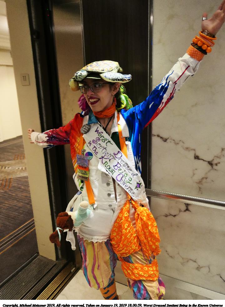Picture #15: Worst Dressed Sentient Being in the Known Universe Thumb: 360x480, 68,328 bytes (67K) Small: 720x983, 143,307 bytes (140K), (html file) Large: 3600x4800, 3,482,465 bytes (3.3M), (html file) Copyright, Michael Meissner 2019, All rights reserved Panasonic LX-10 camera f/1.4, ISO 400, 1/60 sec, 8.8mm, auto mode, auto wb (2800), matrix metering, bias -0.3, image stabilization 35mm equivalent focal length 26.0mm Programs used: adjusttime, crop, raw therapee, rotate left Taken by Michael Meissner on January 19, 2019 18:30:59 Last modified on April 10, 2019 at 23:16 |