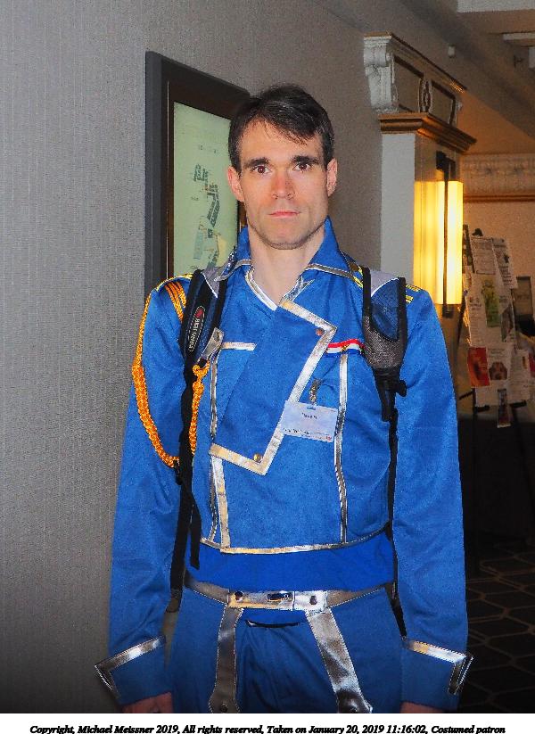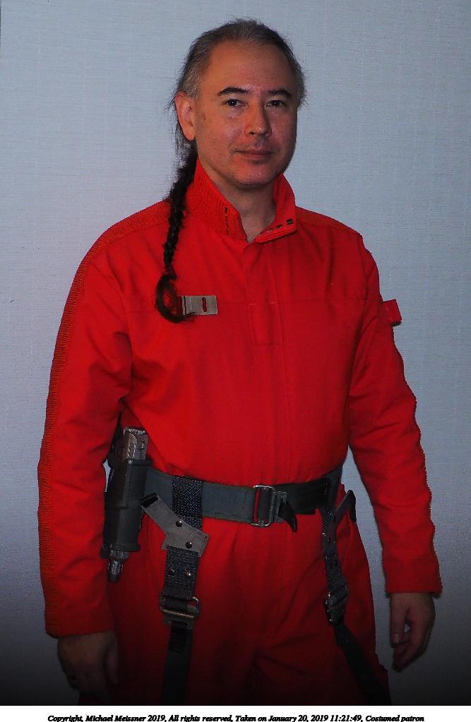 Picture #7: Costumed patron Thumb: 460x345, 42,635 bytes (42K) Small: 920x713, 149,300 bytes (146K), (html file) Large: 4600x3450, 5,464,994 bytes (5.2M), (html file) Copyright, Michael Meissner 2019, All rights reserved Olympus E-M10-II camera with Olympus-m43 12-50mm f/3.5-6.3 lens f/5.2, ISO 800, flash (-0.33 flash compensation), 1/60 sec, 26.0mm, auto mode, vivid color, auto gradation, SHQ, matrix metering, IS Auto, noise reduction auto 35mm equivalent focal length 52.0mm Programs used: crop, raw therapee Taken by Michael Meissner on January 19, 2019 12:32:03 Last modified on April 10, 2019 at 23:12 |