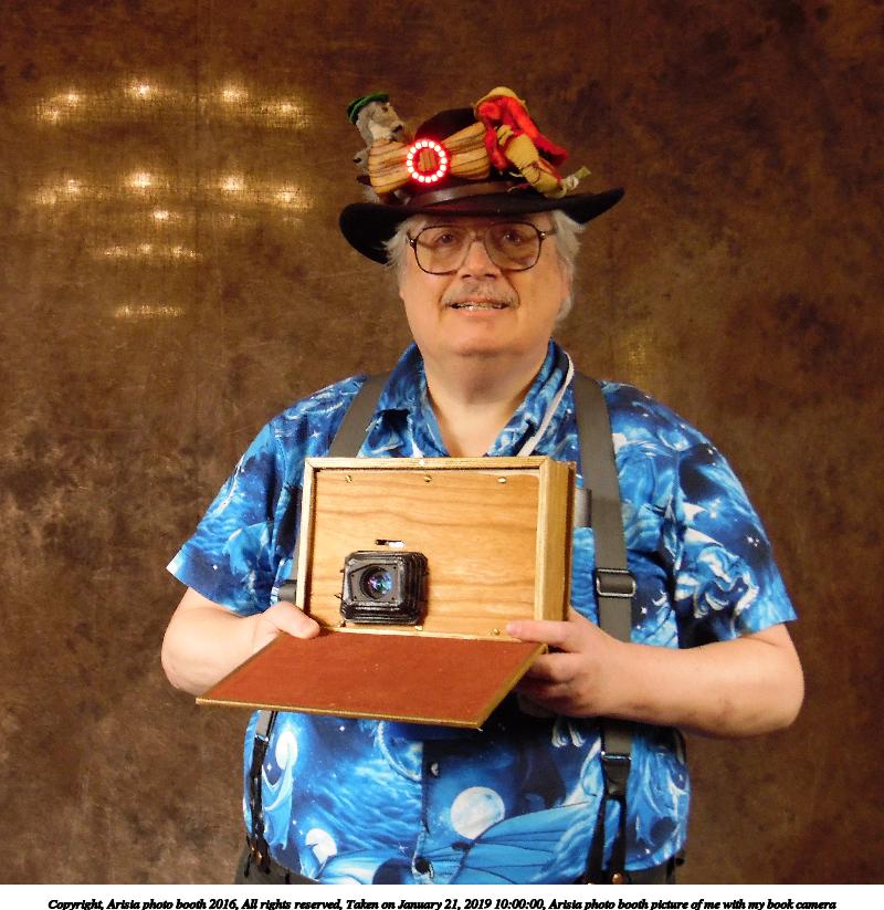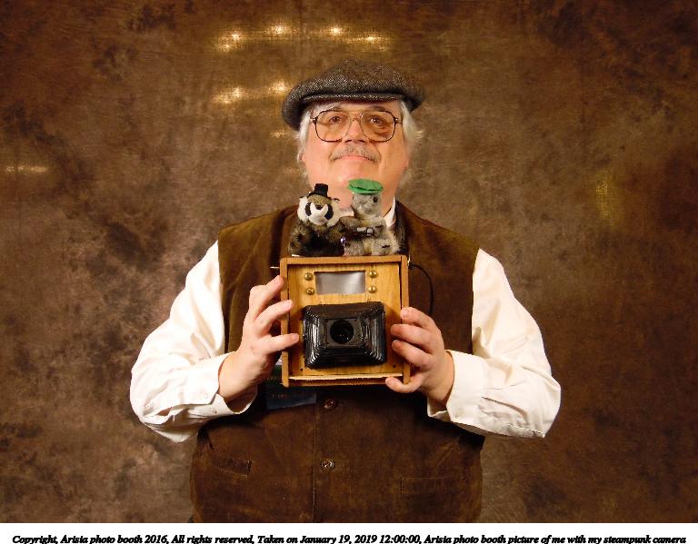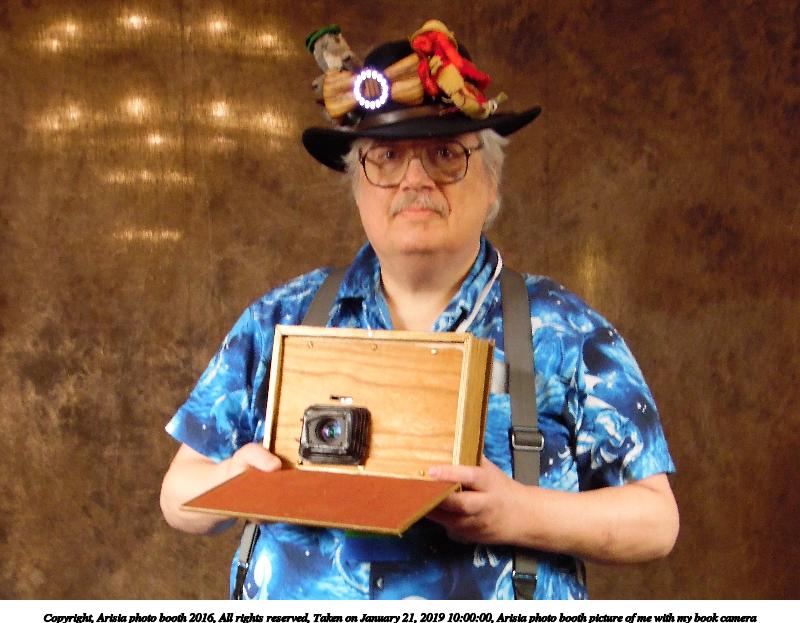 Picture #1: Arisia photo booth picture of me with my steampunk camera Thumb: 400x400, 33,577 bytes (33K) Small: 800x823, 81,061 bytes (80K), (html file) Large: 3200x3200, 5,388,658 bytes (5.1M), (html file) Copyright, Arisia photo booth 2016, All rights reserved SAMSUNG WB1100F f/3.4, ISO 200, 1/12 sec, 8.2mm, auto mode, sunny, multispot metering, bias -1.0, +1 sharpening 35mm equivalent focal length 46.0mm Programs used: gimp Taken on January 19, 2019 12:00:00 Last modified on January 23, 2019 at 10:57 This picture is one of my favorites. |