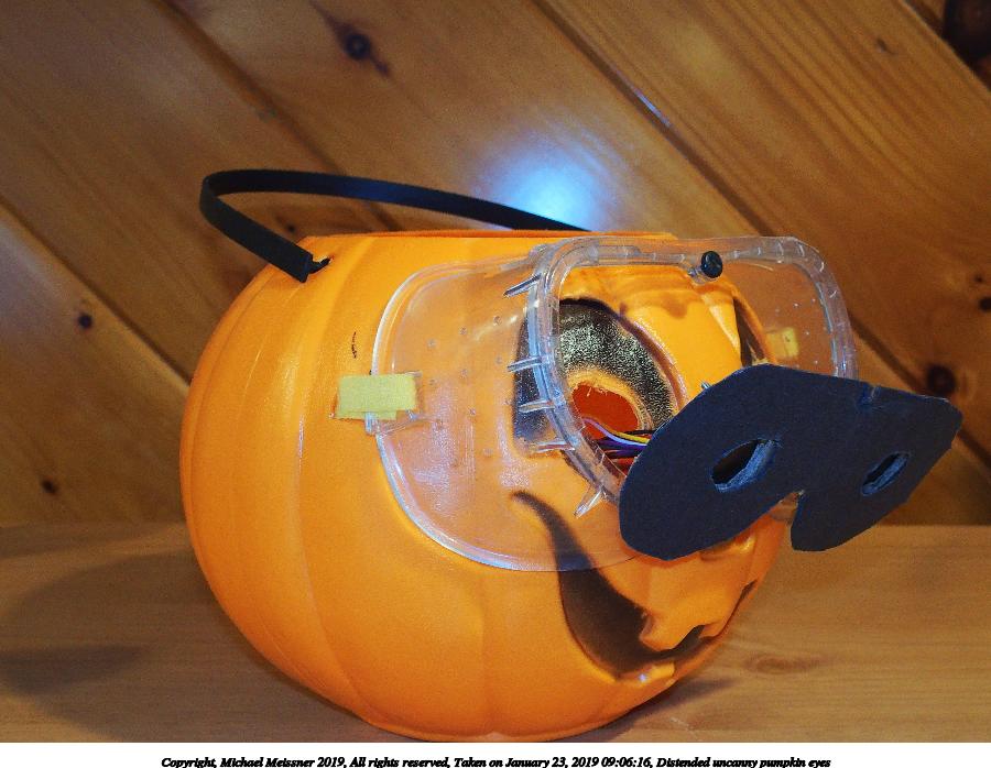Picture #2: Distended uncanny pumpkin eyes Thumb: 450x338, 38,775 bytes (38K) Small: 900x698, 97,591 bytes (96K), (html file) Large: 3600x2700, 2,398,341 bytes (2.3M), (html file) Copyright, Michael Meissner 2019, All rights reserved Olympus Stylus-1 camera f/2.8, ISO 400, flash (+0.33 flash compensation), 1/40 sec, 8.1mm, auto mode, vivid color, SHQ, matrix metering, IS Auto, noise reduction auto, noise filter low 35mm equivalent focal length 38.0mm Programs used: crop, raw therapee Taken by Michael Meissner on January 23, 2019 09:06:16 Last modified on January 23, 2019 at 10:02 I brought my Halloween prop that uses the Teensy uncanny eyes program to the Arisia science fiction convention. When I brought it home, the eyes had popped out, and I liked the image. |