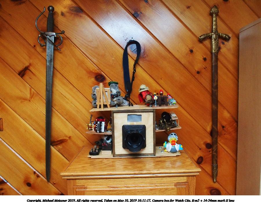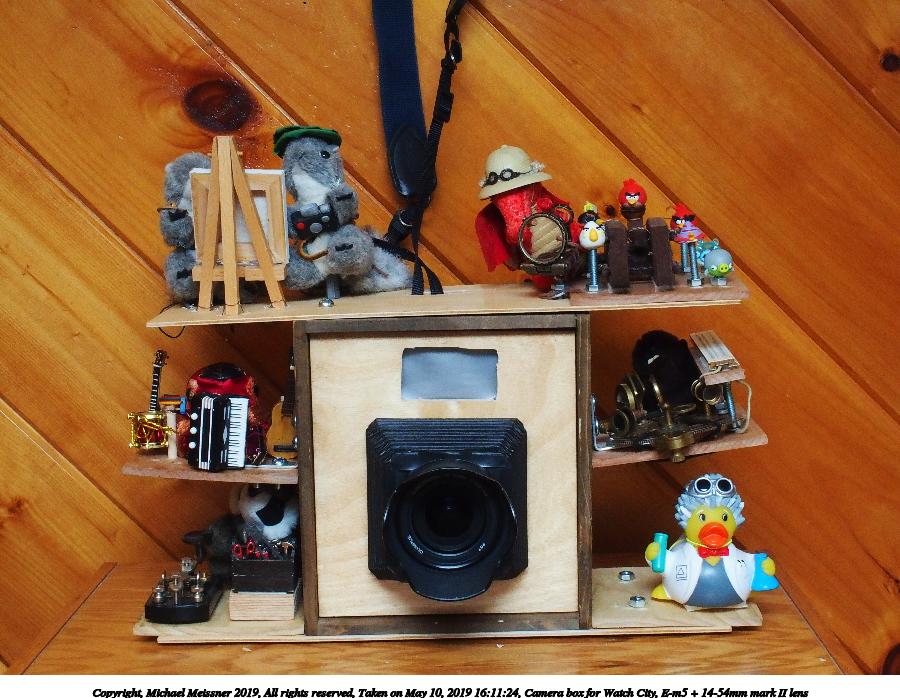 Picture #1: Camera box for Watch City, E-m5 + 14-54mm mark II lens Thumb: 450x338, 49,032 bytes (48K) Small: 900x698, 127,936 bytes (125K), (html file) Large: 3600x2700, 2,517,188 bytes (2.4M), (html file) Copyright, Michael Meissner 2019, All rights reserved Olympus Stylus-1 camera f/8.0, ISO 800, FL-36R flash (+0.33 flash compensation), 1/30 sec, 6.0mm, aperture priority, vivid color, SHQ, matrix metering, IS Auto, noise reduction auto, noise filter low 35mm equivalent focal length 28.0mm Programs used: crop, raw therapee Taken by Michael Meissner on May 10, 2019 16:11:17 Last modified on May 11, 2019 at 23:26 |