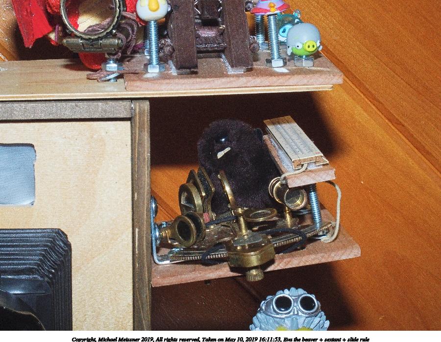 Picture #7: Eva the beaver + sextant + slide rule Thumb: 450x338, 49,194 bytes (49K) Small: 900x698, 157,992 bytes (155K), (html file) Large: 3600x2700, 3,362,906 bytes (3.2M), (html file) Copyright, Michael Meissner 2019, All rights reserved Olympus Stylus-1 camera f/8.0, ISO 400, FL-36R flash (+0.33 flash compensation), 1/60 sec, 19.6mm, aperture priority, vivid color, SHQ, matrix metering, IS Auto, noise reduction auto, noise filter low 35mm equivalent focal length 92.0mm Programs used: crop, raw therapee Taken by Michael Meissner on May 10, 2019 16:11:53 Last modified on May 11, 2019 at 23:32 |