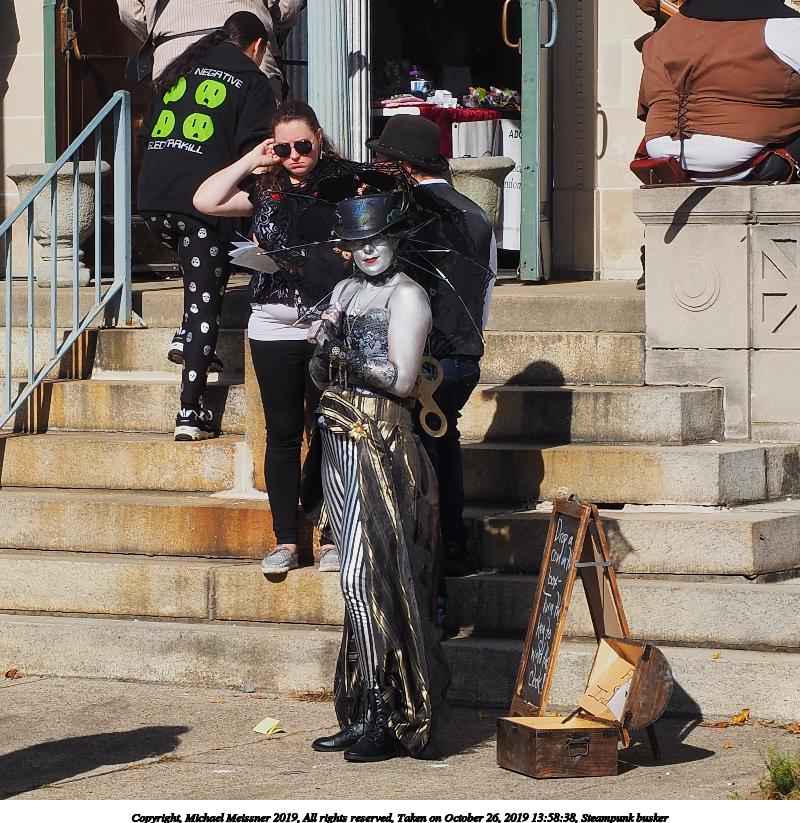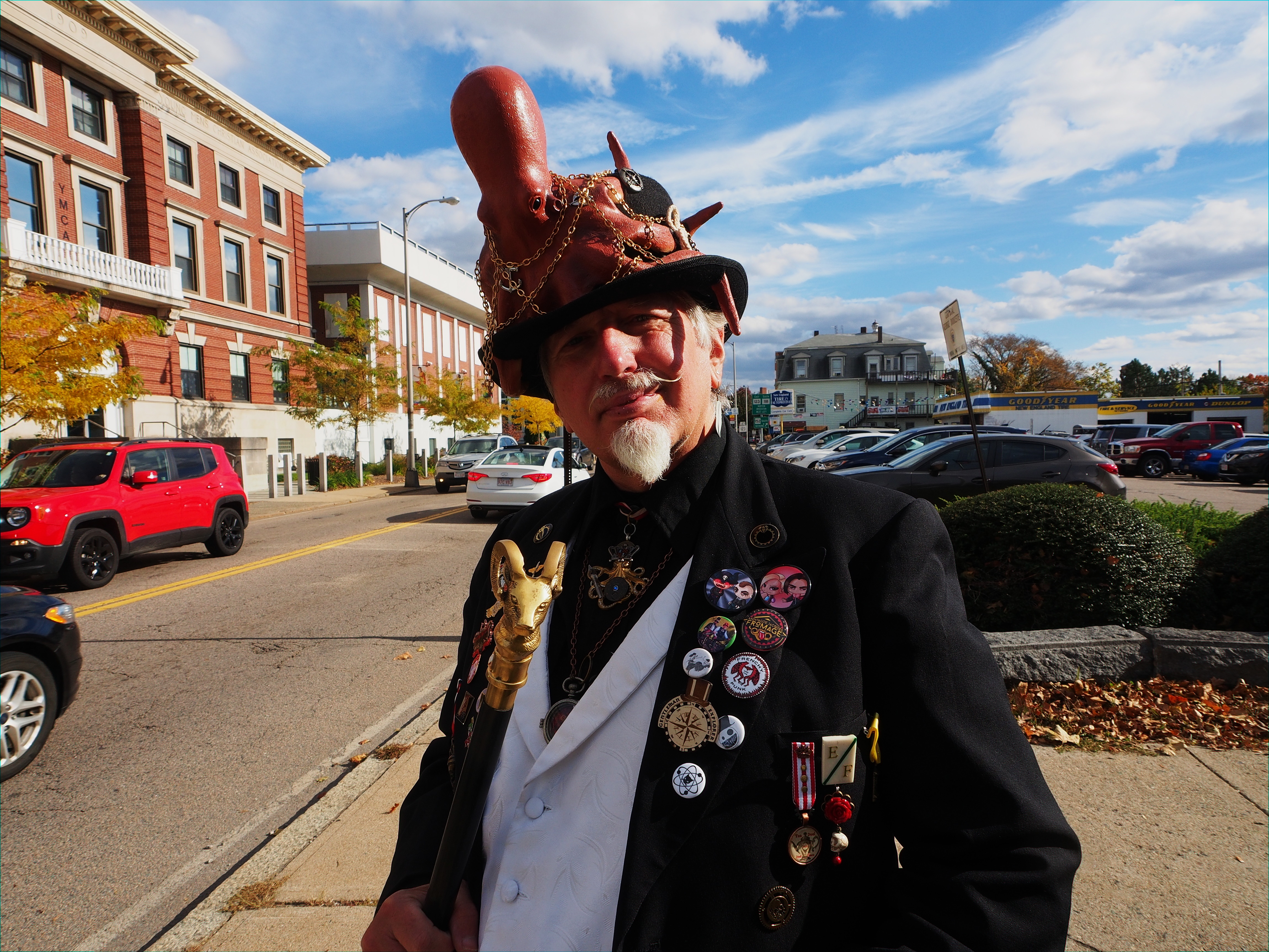 Picture #101: Steampunk busker Small: 800x823, 179,433 bytes (176K), (html file) Large: 3200x3200, 5,904,609 bytes (5.6M), (html file) Copyright, Michael Meissner 2019, All rights reserved Olympus E-M10-II camera with Olympus-m43 12-40mm f/2.8 lens f/8.0, ISO 200, 1/640 sec, 40.0mm, auto mode, vivid color, auto gradation, SHQ, matrix metering, digital zoom x2, noise filter low 35mm equivalent focal length 160.0mm, digital zoom x2 Programs used: crop, gimp, raw therapee Taken by Michael Meissner on October 26, 2019 13:58:38 Last modified on April 02, 2020 at 01:24 |