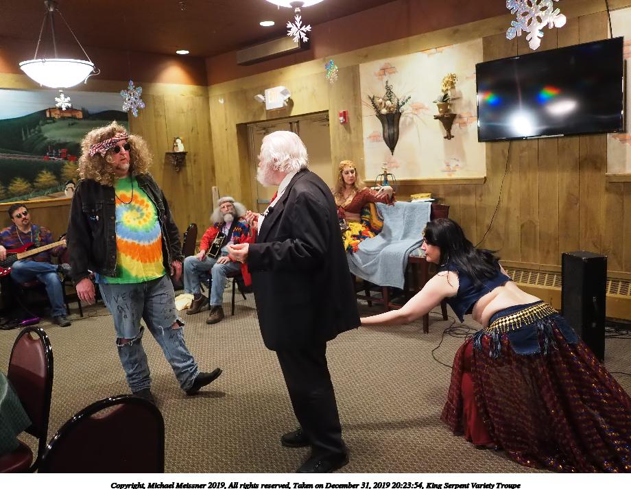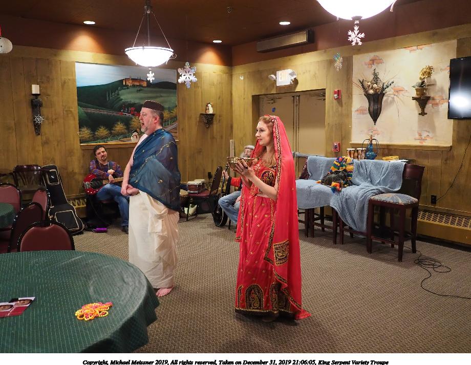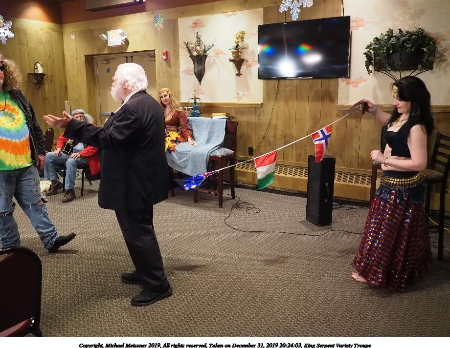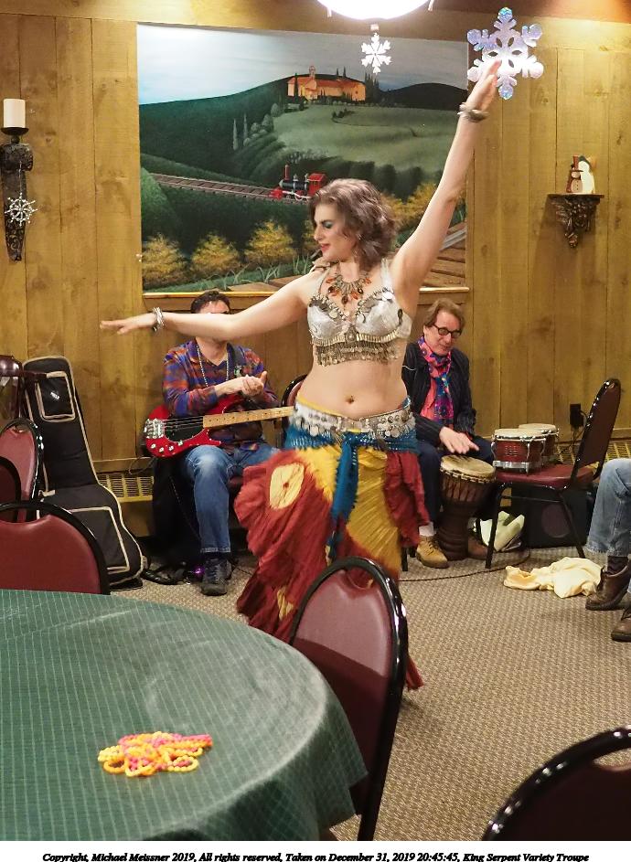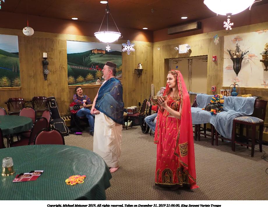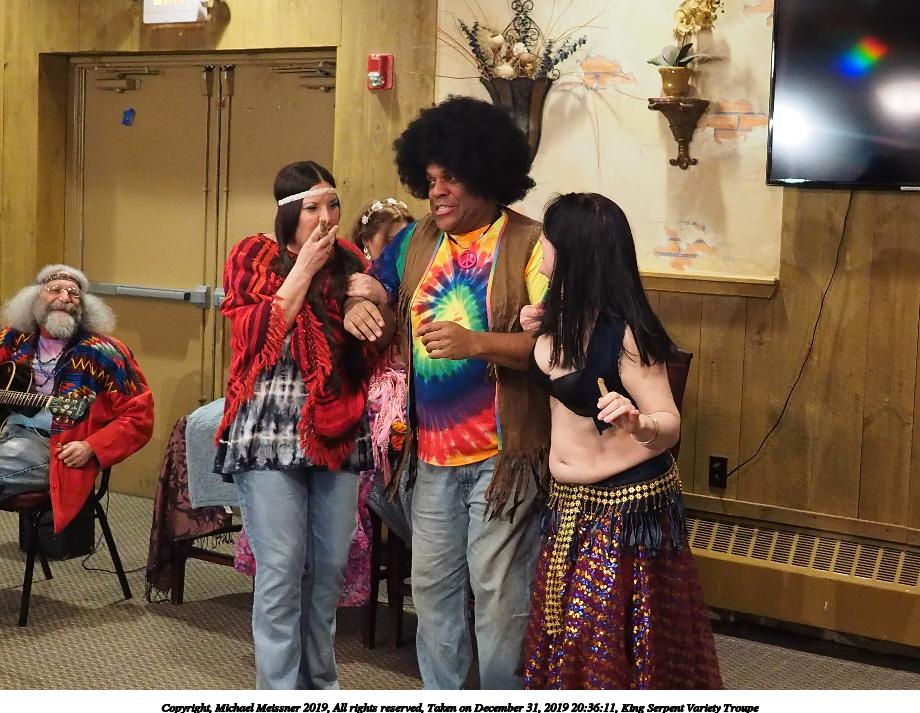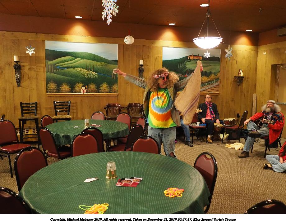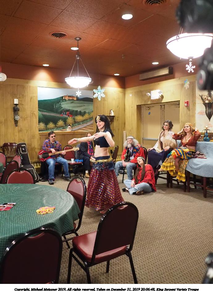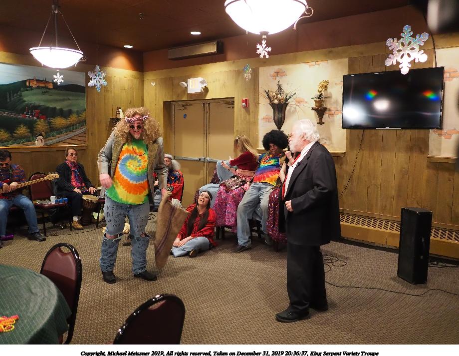 Picture #93: King Serpent Variety Troupe #93 Small: 920x713, 155,680 bytes (153K), (html file) Large: 4600x3450, 3,369,902 bytes (3.2M), (html file) Copyright, Michael Meissner 2019, All rights reserved Olympus E-M1-I camera with Panasonic-Leica 15mm f/1.7 lens f/1.7, ISO 3200, 1/60 sec, 15.0mm, auto mode, vivid color, SHQ, center weight metering, IS Auto, noise filter low, anti-shock 35mm equivalent focal length 30.0mm Programs used: crop, raw therapee Taken by Michael Meissner on December 31, 2019 21:40:14 Last modified on April 02, 2020 at 22:49 |