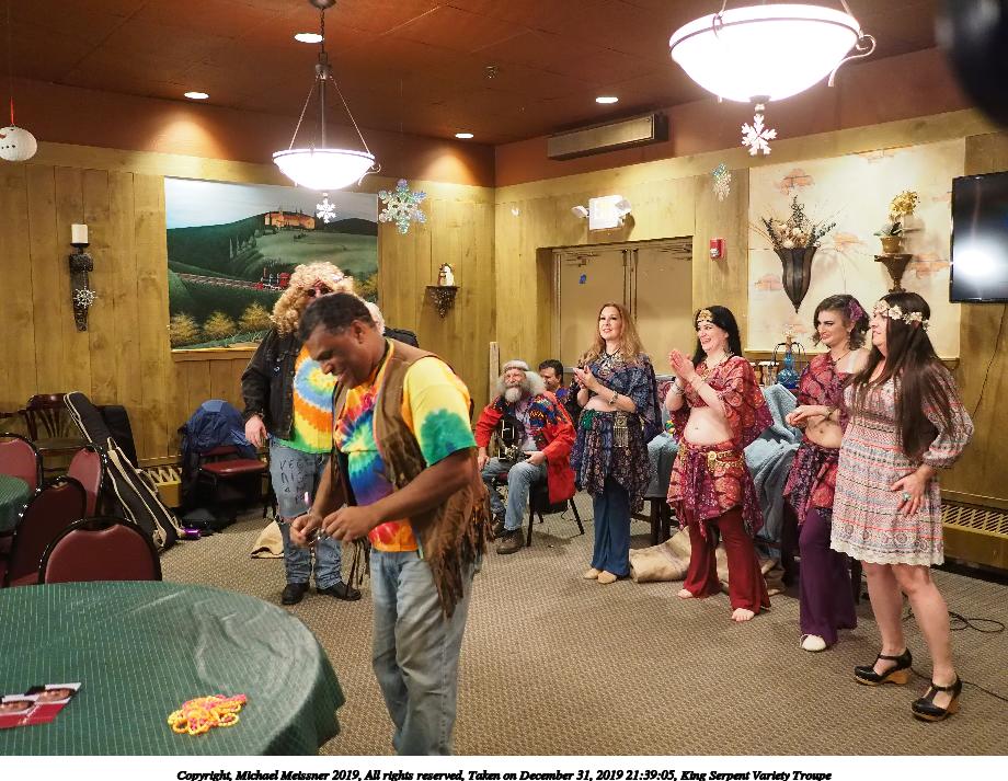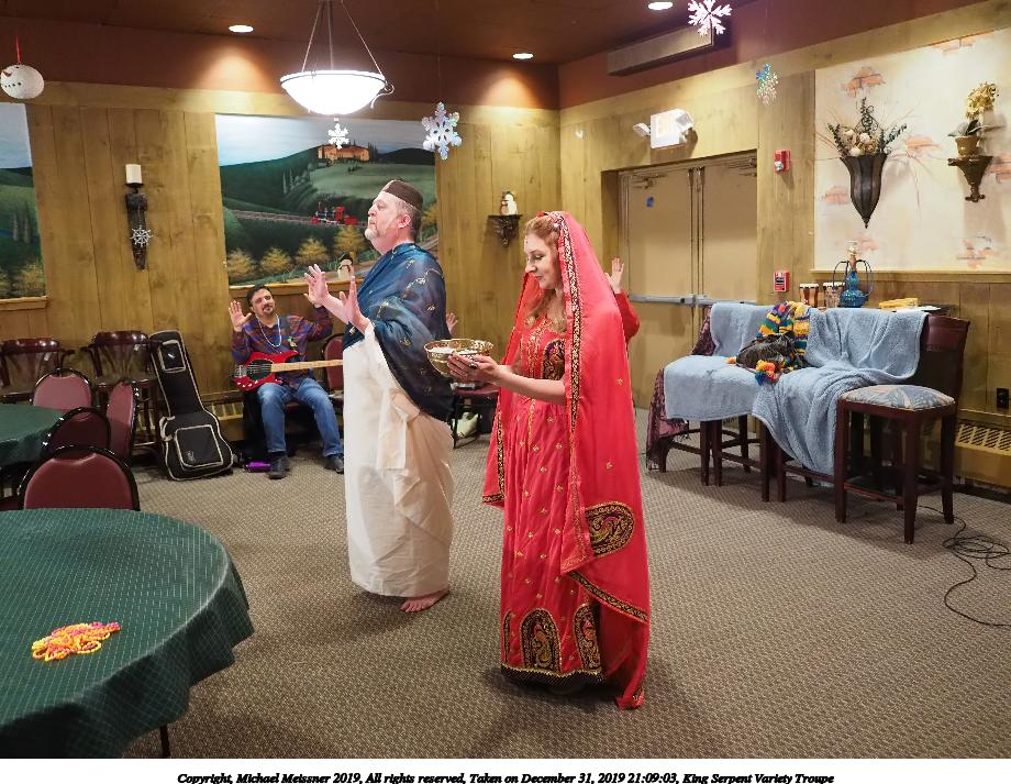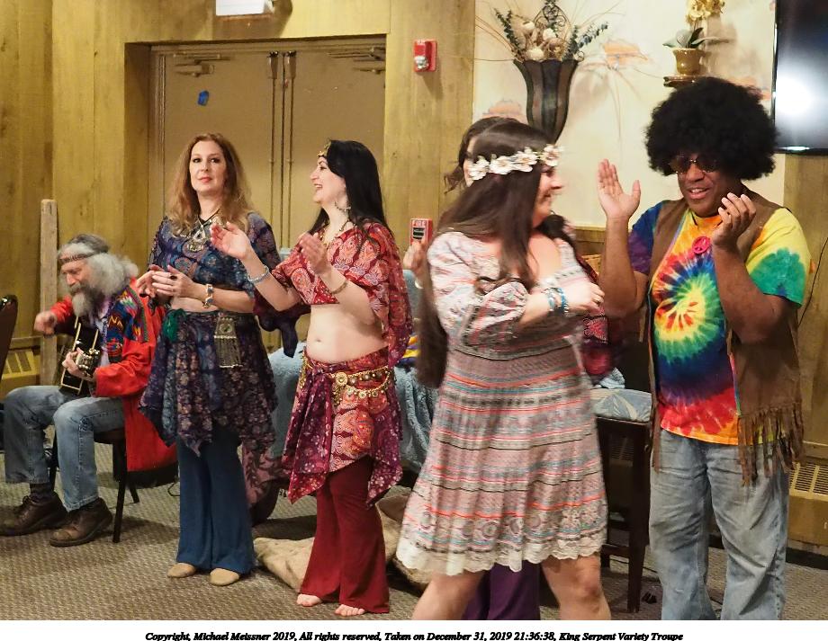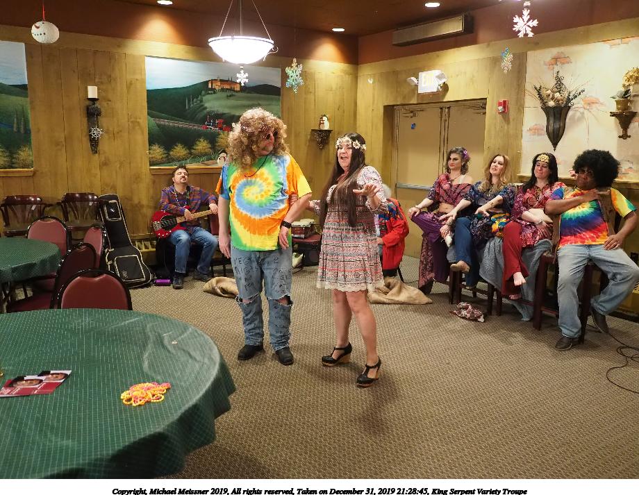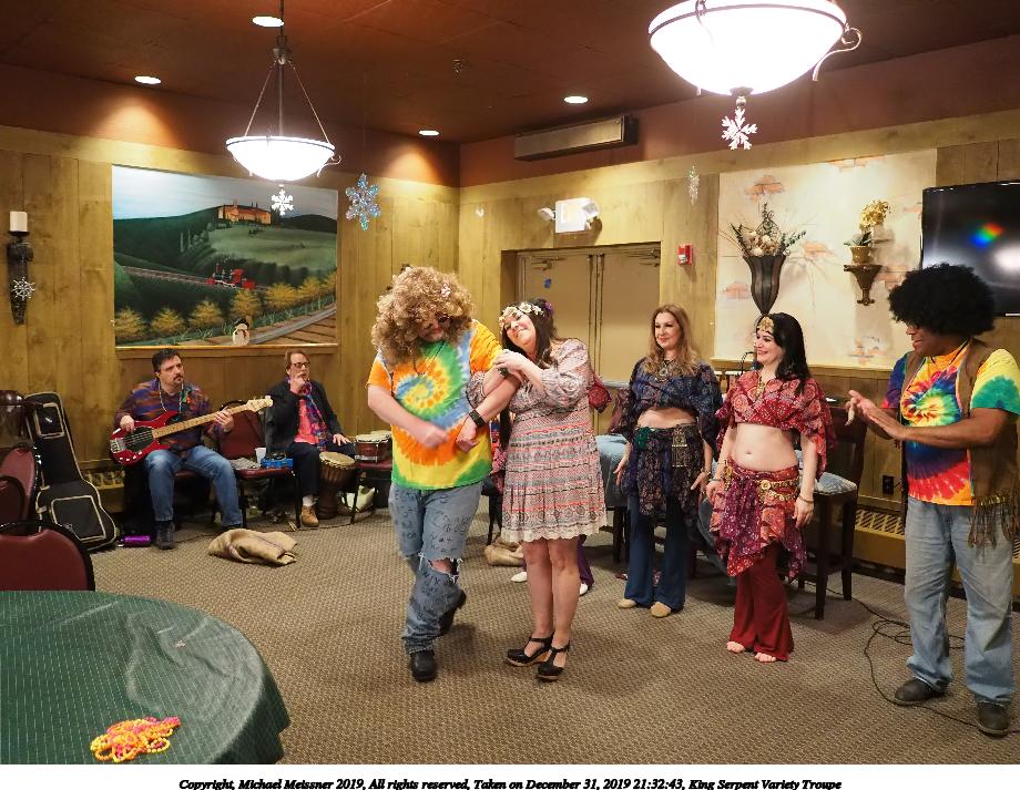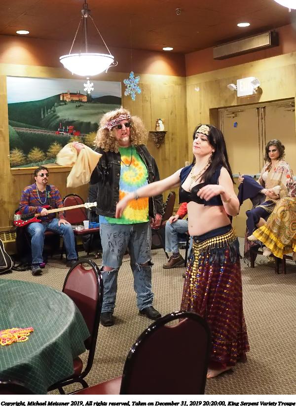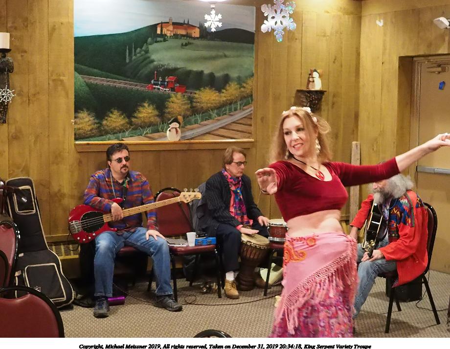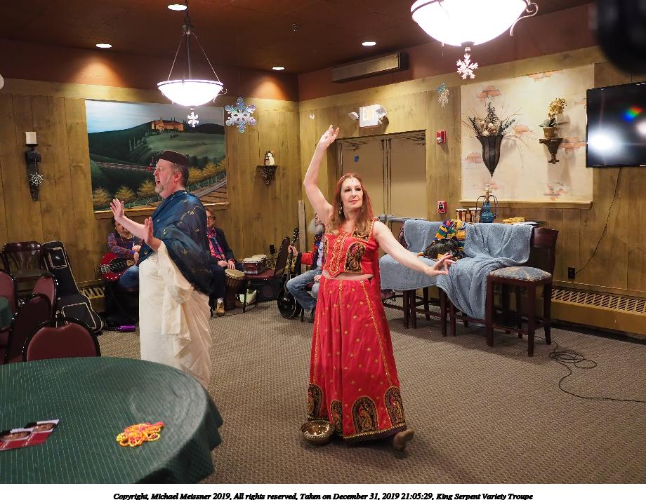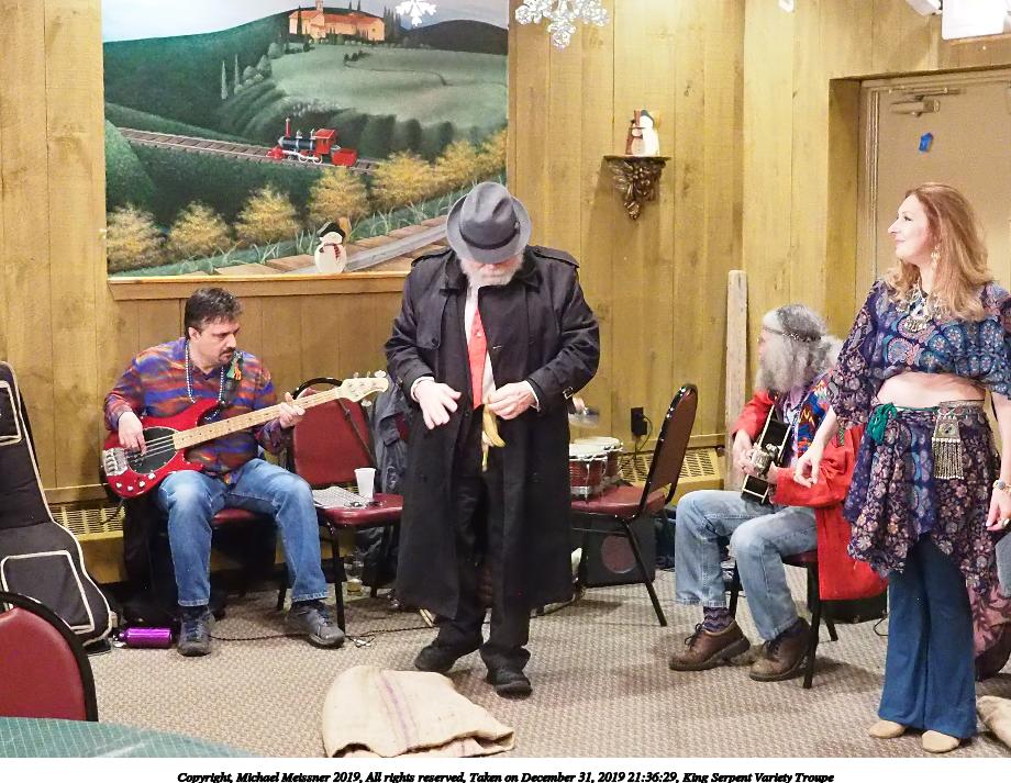 Picture #93: King Serpent Variety Troupe #93 Small: 920x713, 155,680 bytes (153K), (html file) Large: 4600x3450, 3,369,902 bytes (3.2M), (html file) Copyright, Michael Meissner 2019, All rights reserved Olympus E-M1-I camera with Panasonic-Leica 15mm f/1.7 lens f/1.7, ISO 3200, 1/60 sec, 15.0mm, auto mode, vivid color, SHQ, center weight metering, IS Auto, noise filter low, anti-shock 35mm equivalent focal length 30.0mm Programs used: crop, raw therapee Taken by Michael Meissner on December 31, 2019 21:40:14 Last modified on April 02, 2020 at 22:49 |