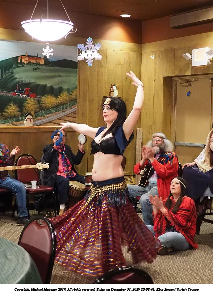 Picture #5: King Serpent Variety Troupe #5 Small: 920x713, 173,652 bytes (170K), (html file) Large: 4600x3450, 3,238,685 bytes (3.1M), (html file) Copyright, Michael Meissner 2019, All rights reserved Olympus E-M1-I camera with Panasonic-Leica 15mm f/1.7 lens f/1.7, ISO 4000, 1/60 sec, 15.0mm, auto mode, vivid color, SHQ, center weight metering, digital zoom x2, IS Auto, noise filter low, anti-shock 35mm equivalent focal length 60.0mm, digital zoom x2 Programs used: crop, raw therapee Taken by Michael Meissner on December 31, 2019 20:11:49 Last modified on April 02, 2020 at 22:26 |