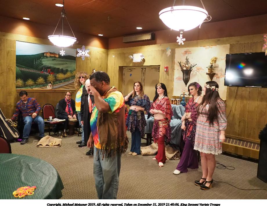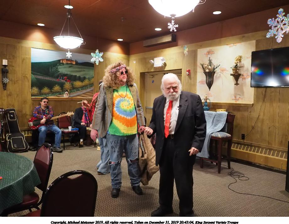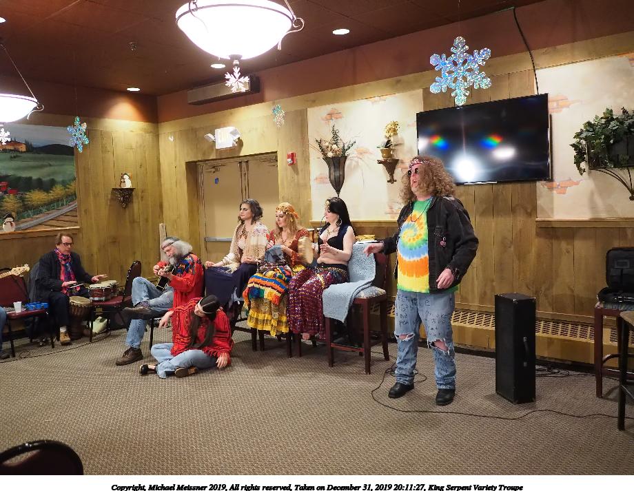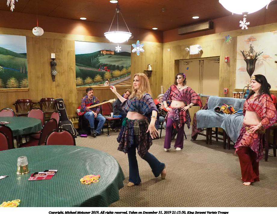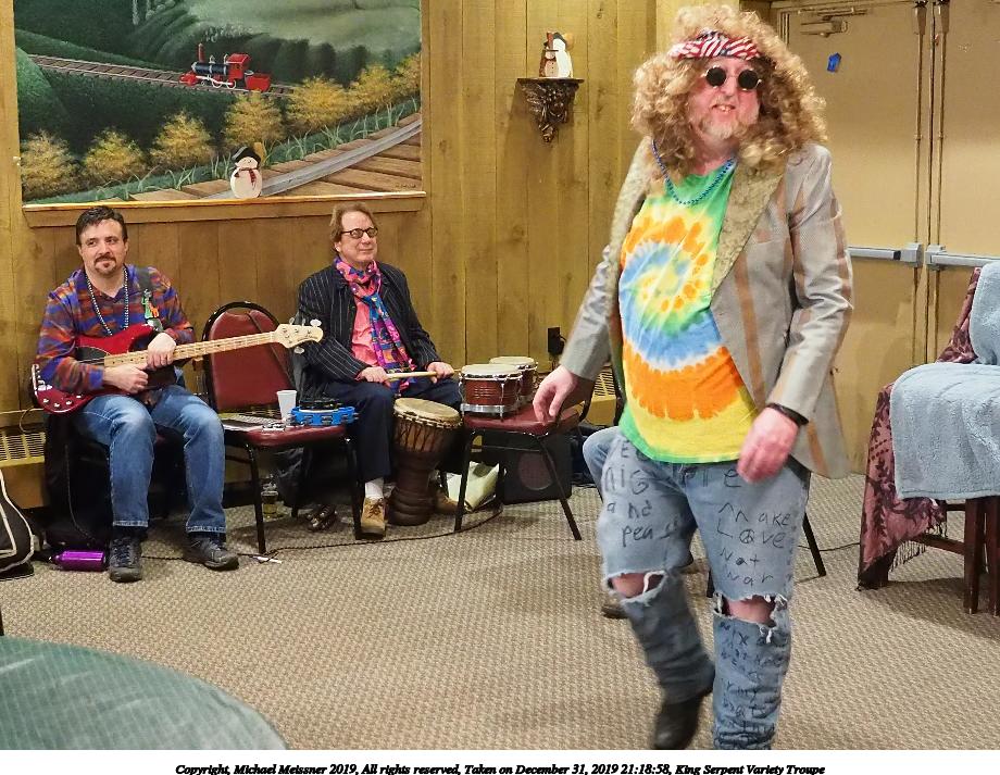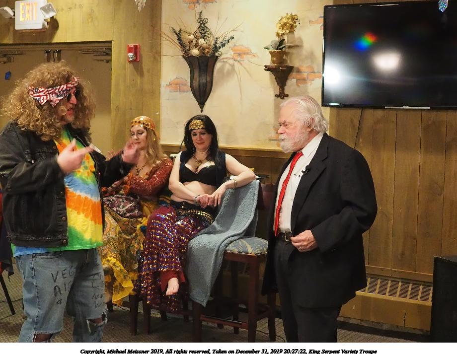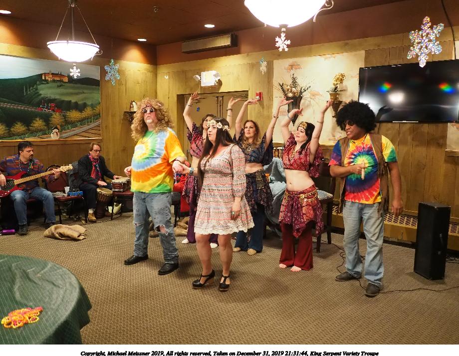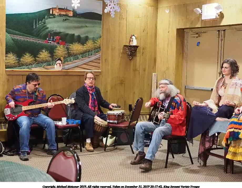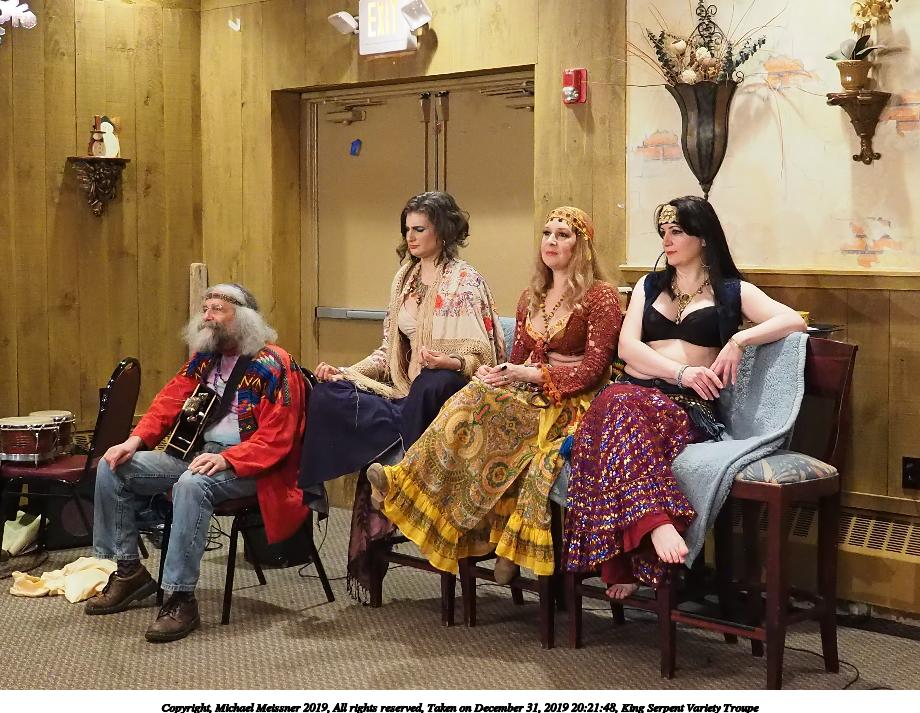 Picture #50: King Serpent Variety Troupe #50 Small: 920x713, 145,115 bytes (142K), (html file) Large: 4600x3450, 2,687,229 bytes (2.6M), (html file) Copyright, Michael Meissner 2019, All rights reserved Olympus E-M1-I camera with Panasonic-Leica 15mm f/1.7 lens f/1.7, ISO 3200, 1/60 sec, 15.0mm, auto mode, vivid color, SHQ, center weight metering, digital zoom x2, IS Auto, noise filter low, anti-shock 35mm equivalent focal length 60.0mm, digital zoom x2 Programs used: crop, raw therapee Taken by Michael Meissner on December 31, 2019 21:16:32 Last modified on April 02, 2020 at 22:39 |