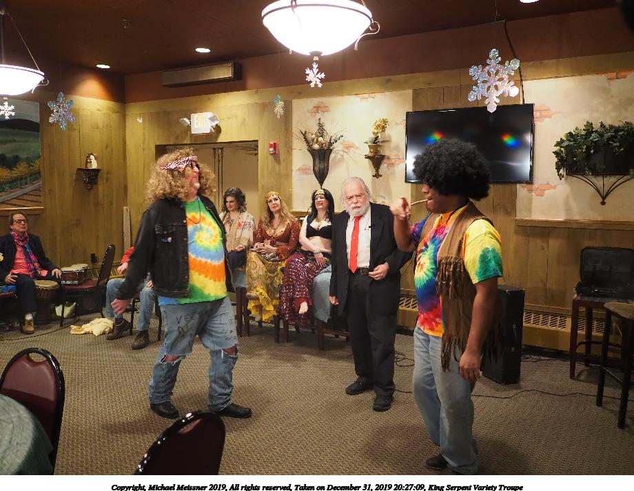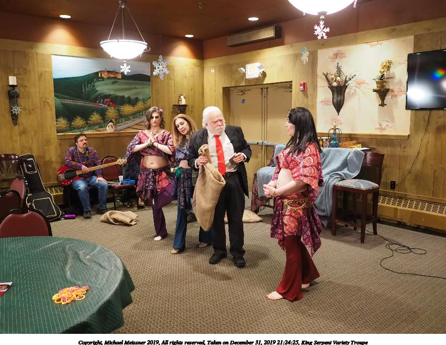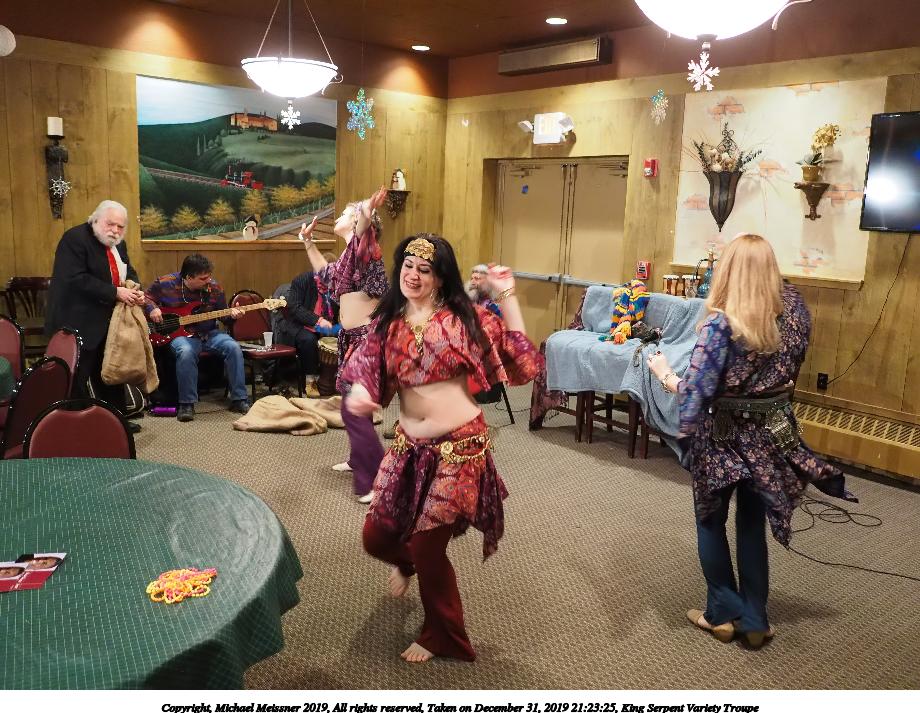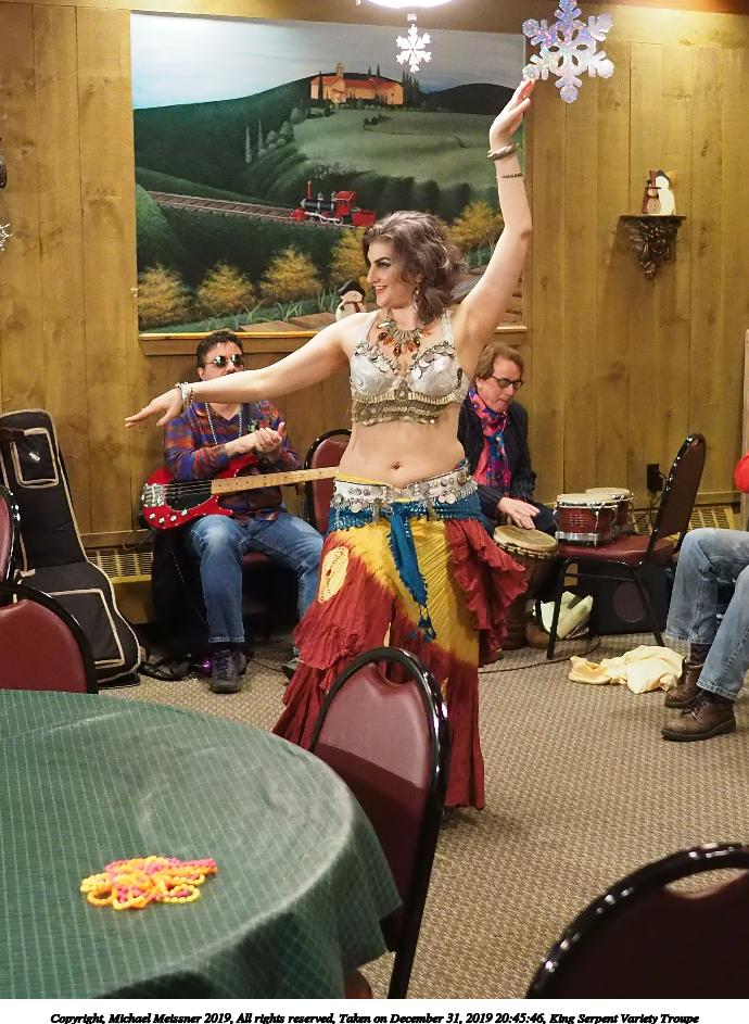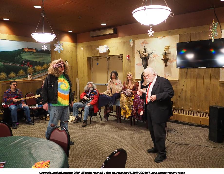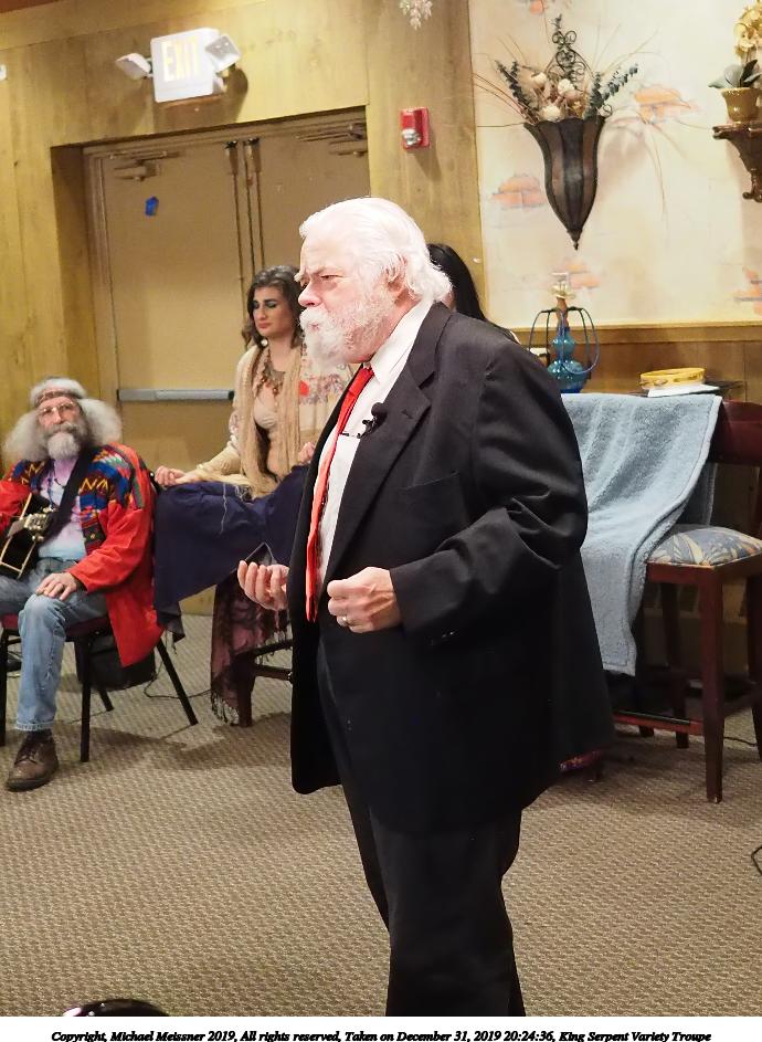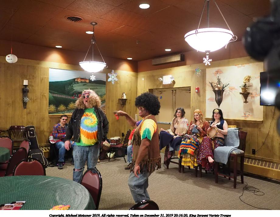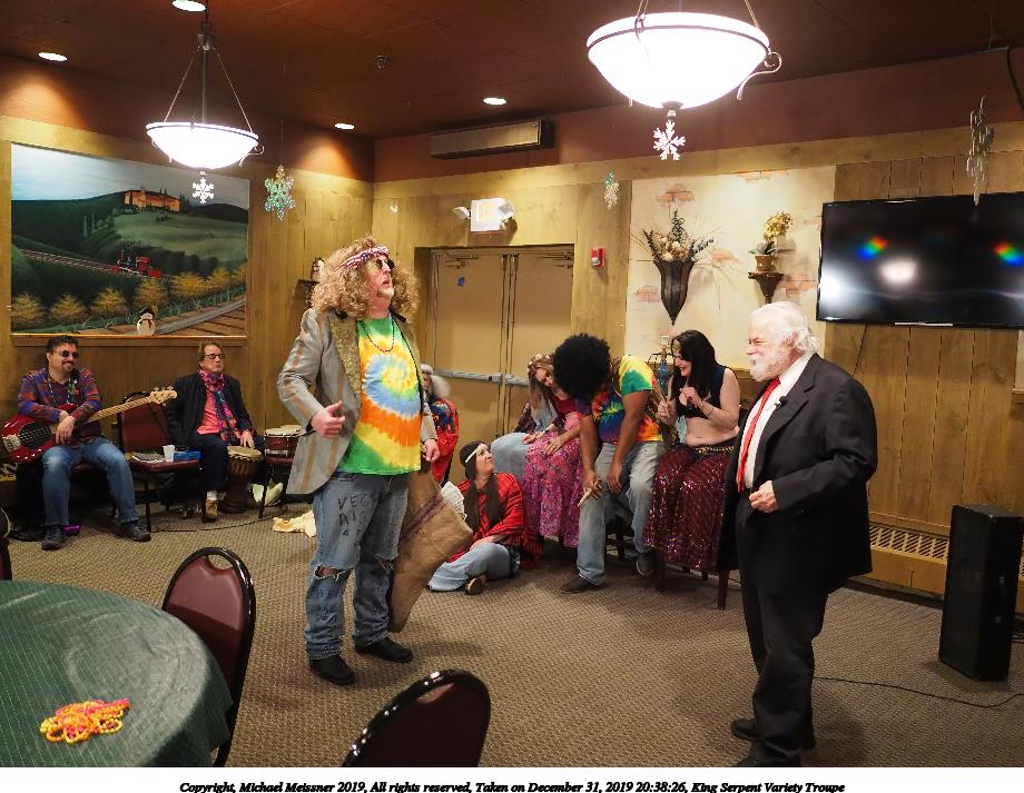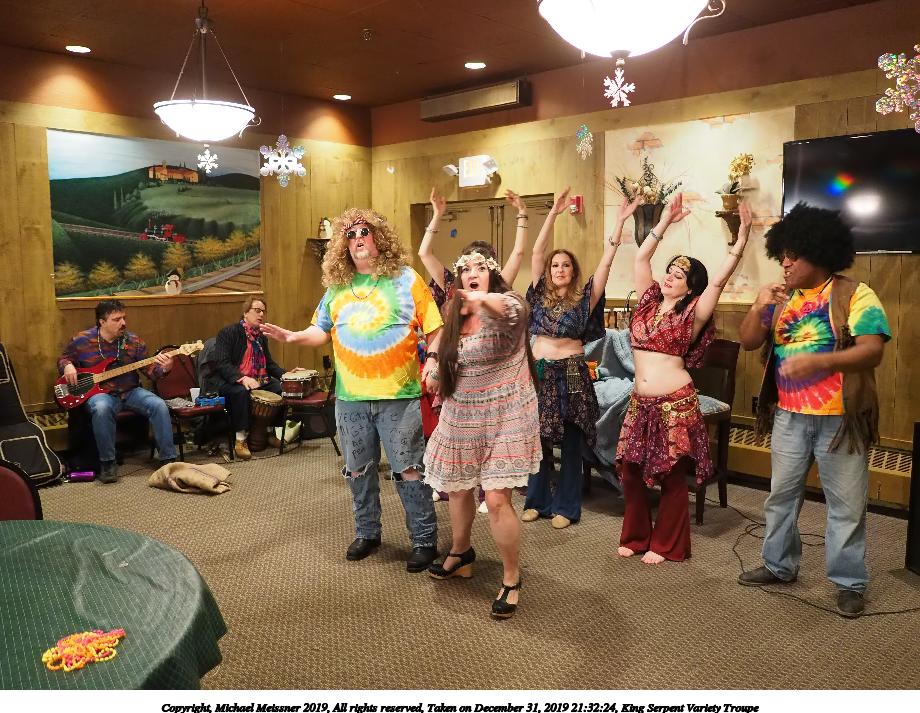Picture #88: King Serpent Variety Troupe #88 Small: 920x713, 160,786 bytes (158K), (html file) Large: 4600x3450, 3,579,633 bytes (3.4M), (html file) Copyright, Michael Meissner 2019, All rights reserved Olympus E-M1-I camera with Panasonic-Leica 15mm f/1.7 lens f/1.7, ISO 3200, 1/60 sec, 15.0mm, auto mode, vivid color, SHQ, center weight metering, IS Auto, noise filter low, anti-shock 35mm equivalent focal length 30.0mm Programs used: crop, raw therapee Taken by Michael Meissner on December 31, 2019 21:37:34 Last modified on April 02, 2020 at 22:49 |