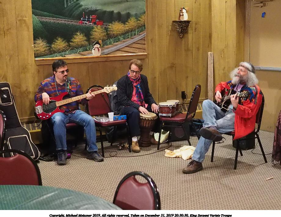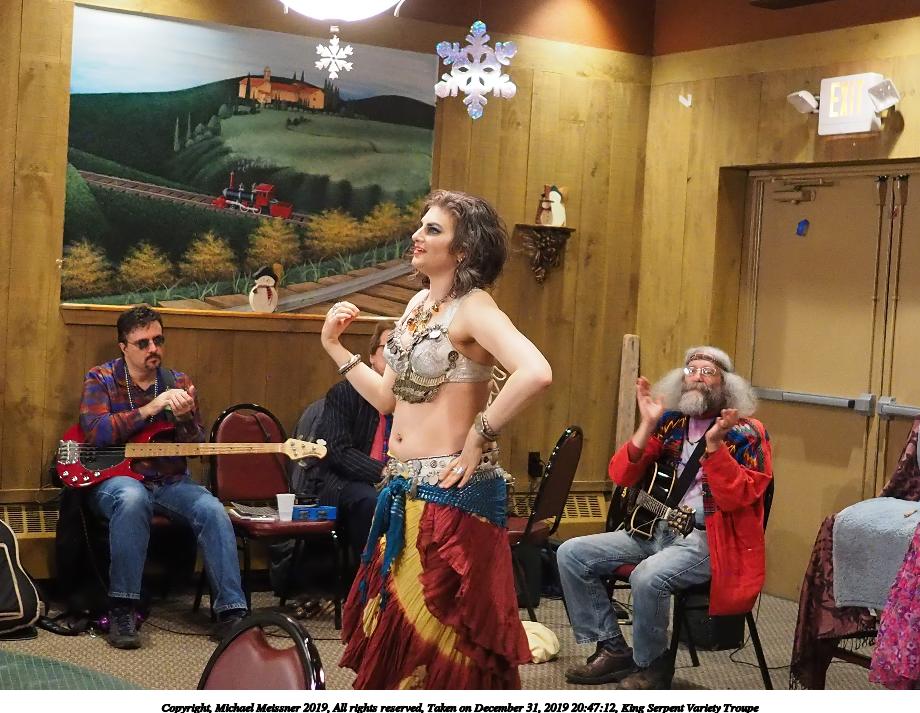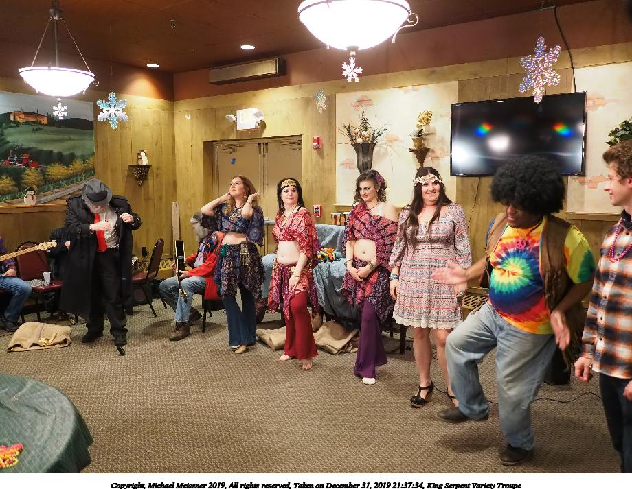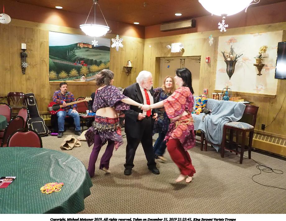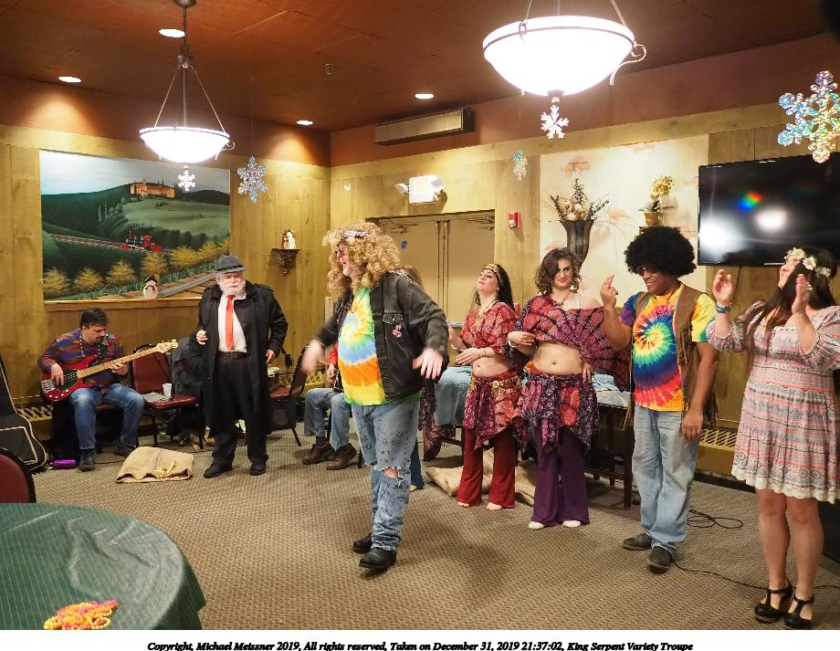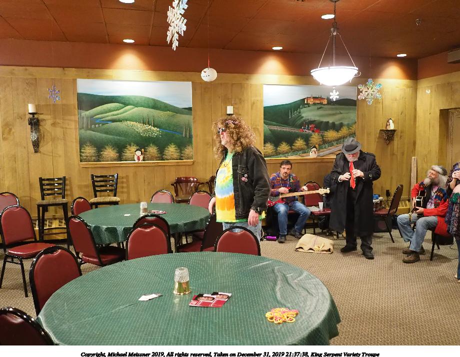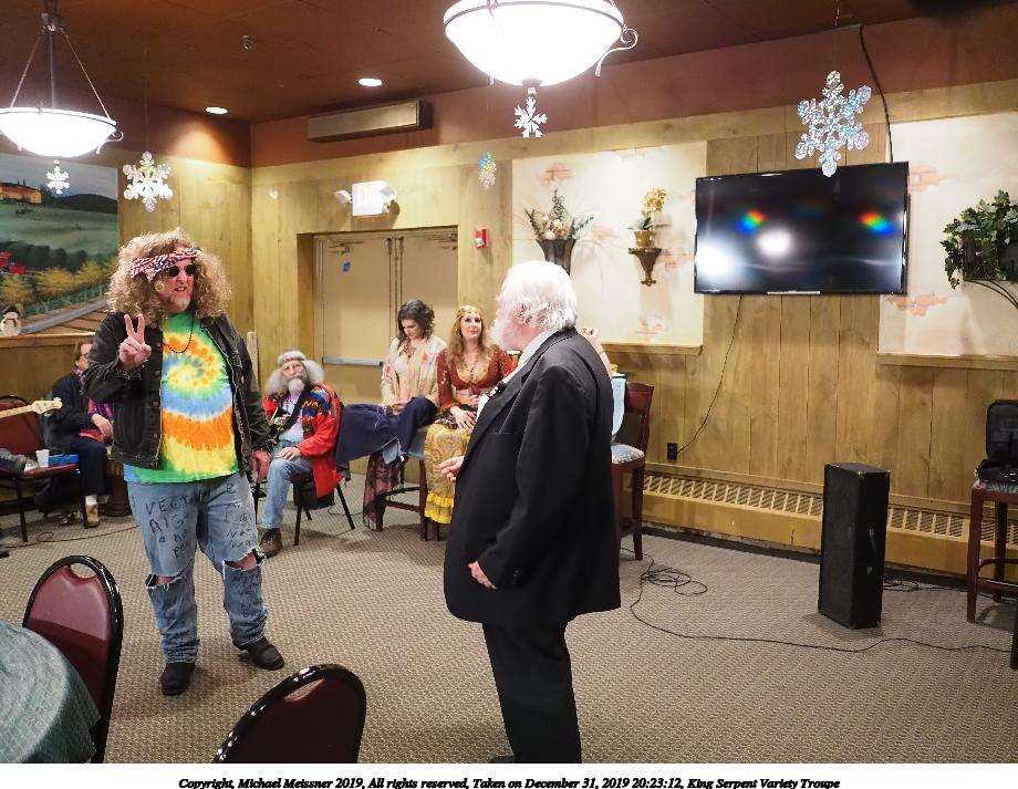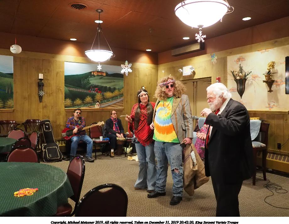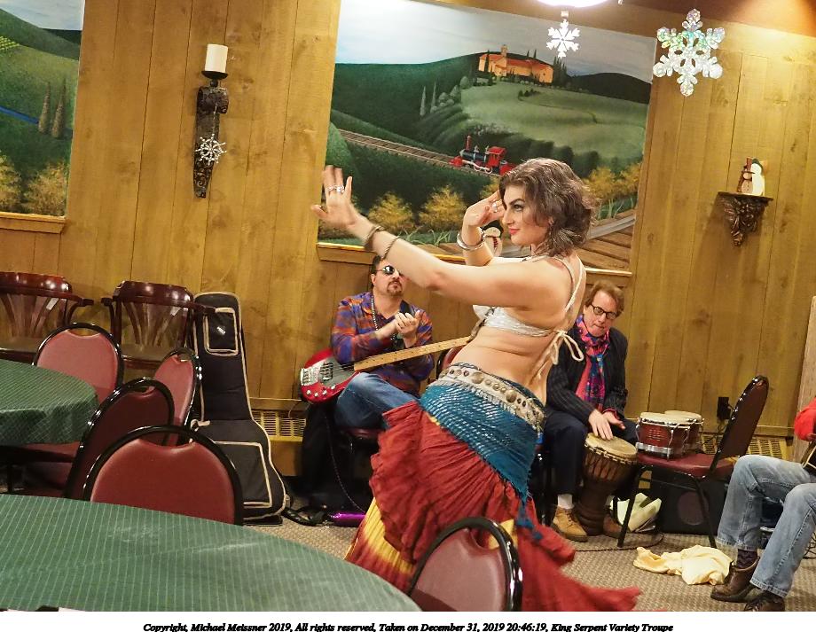 Picture #88: King Serpent Variety Troupe #88 Small: 920x713, 160,786 bytes (158K), (html file) Large: 4600x3450, 3,579,633 bytes (3.4M), (html file) Copyright, Michael Meissner 2019, All rights reserved Olympus E-M1-I camera with Panasonic-Leica 15mm f/1.7 lens f/1.7, ISO 3200, 1/60 sec, 15.0mm, auto mode, vivid color, SHQ, center weight metering, IS Auto, noise filter low, anti-shock 35mm equivalent focal length 30.0mm Programs used: crop, raw therapee Taken by Michael Meissner on December 31, 2019 21:37:34 Last modified on April 02, 2020 at 22:49 |