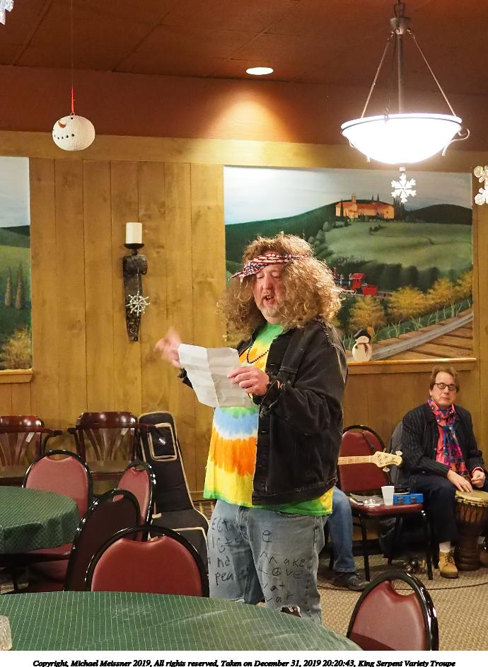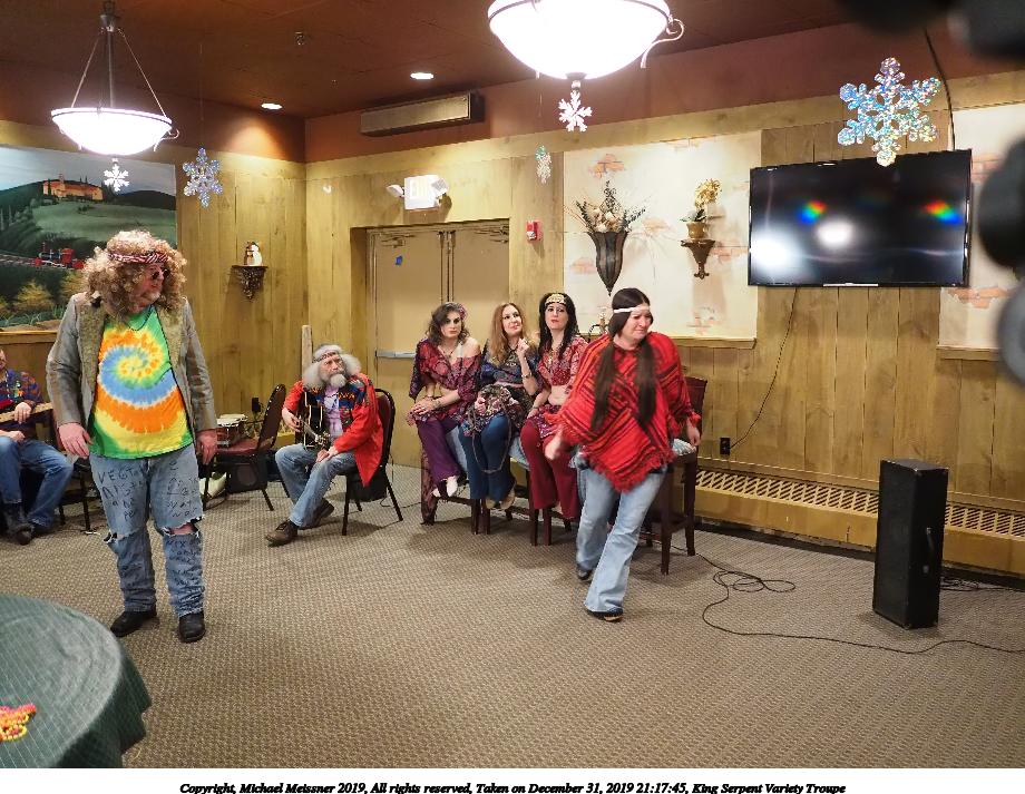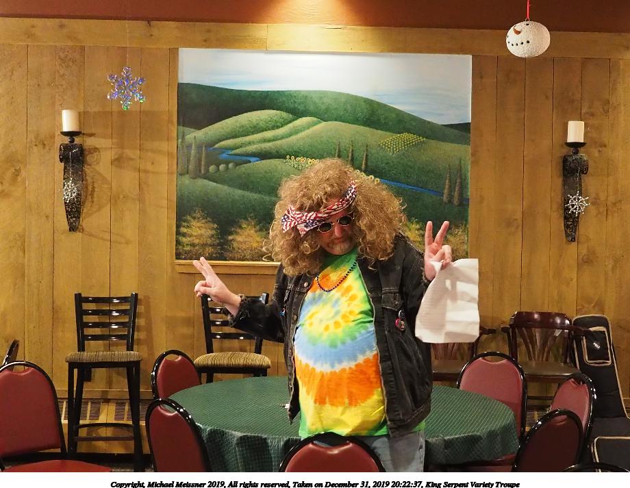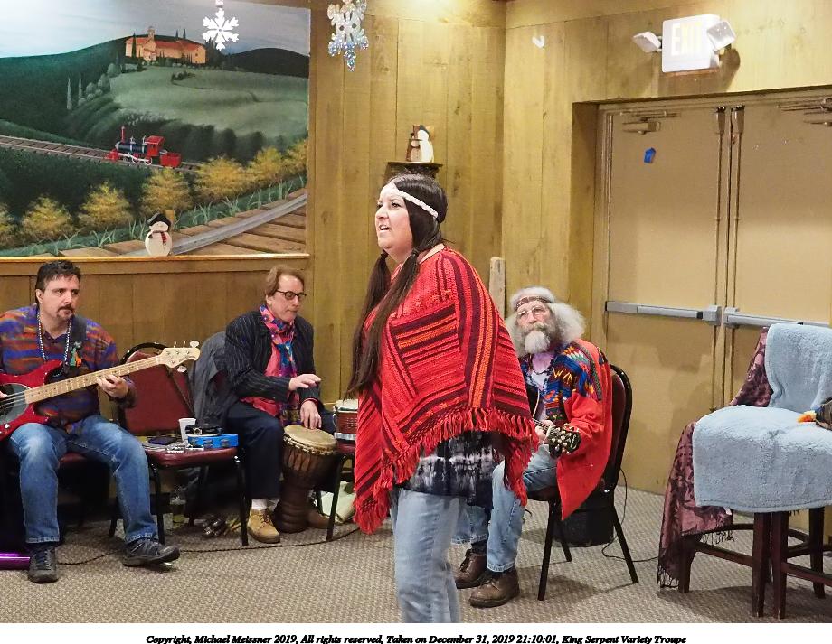 Picture #8: King Serpent Variety Troupe #8 Small: 690x943, 129,096 bytes (127K), (html file) Large: 3450x4600, 2,486,479 bytes (2.4M), (html file) Copyright, Michael Meissner 2019, All rights reserved Olympus E-M1-I camera with Panasonic-Leica 15mm f/1.7 lens f/1.7, ISO 3200, 1/60 sec, 15.0mm, auto mode, vivid color, SHQ, center weight metering, digital zoom x2, IS Auto, noise filter low, anti-shock 35mm equivalent focal length 60.0mm, digital zoom x2 Programs used: crop, raw therapee, rotate left Taken by Michael Meissner on December 31, 2019 20:19:27 Last modified on April 02, 2020 at 22:26 |