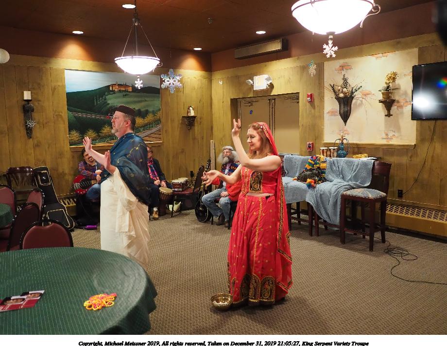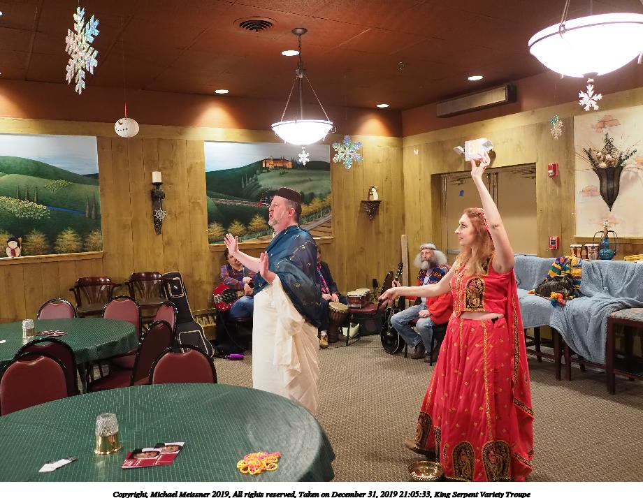 Picture #63: King Serpent Variety Troupe #63 Small: 920x713, 160,124 bytes (157K), (html file) Large: 4600x3450, 3,491,475 bytes (3.3M), (html file) Copyright, Michael Meissner 2019, All rights reserved Olympus E-M1-I camera with Panasonic-Leica 15mm f/1.7 lens f/1.7, ISO 3200, 1/60 sec, 15.0mm, auto mode, vivid color, SHQ, center weight metering, IS Auto, noise filter low, anti-shock 35mm equivalent focal length 30.0mm Programs used: crop, raw therapee Taken by Michael Meissner on December 31, 2019 21:24:25 Last modified on April 02, 2020 at 22:42 |