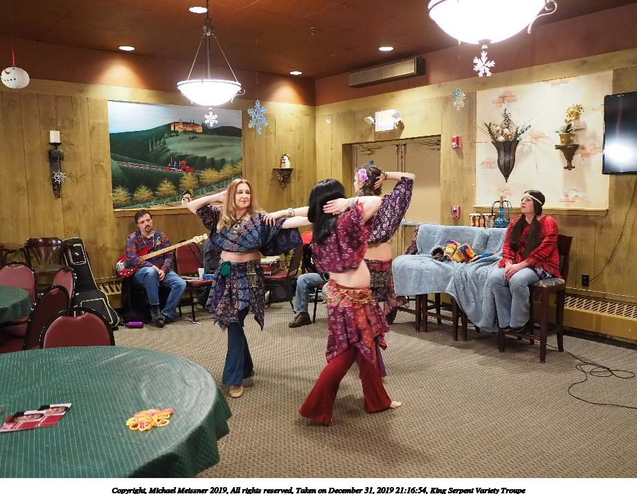 Picture #59: King Serpent Variety Troupe #59 Small: 920x713, 150,664 bytes (148K), (html file) Large: 4600x3450, 3,296,039 bytes (3.1M), (html file) Copyright, Michael Meissner 2019, All rights reserved Olympus E-M1-I camera with Panasonic-Leica 15mm f/1.7 lens f/1.8, ISO 4000, 1/60 sec, 15.0mm, auto mode, vivid color, SHQ, center weight metering, IS Auto, noise filter low, anti-shock 35mm equivalent focal length 30.0mm Programs used: crop, raw therapee Taken by Michael Meissner on December 31, 2019 21:23:51 Last modified on April 02, 2020 at 22:41 |
