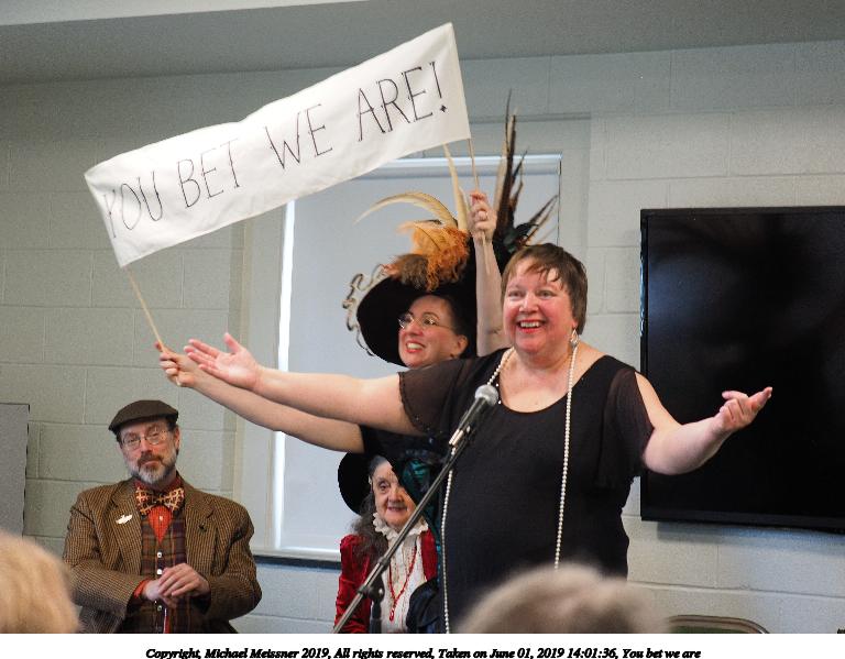 Picture #28: You bet we are Small: 768x599, 80,297 bytes (79K), (html file) Large: 4608x3456, 8,347,778 bytes (8.0M), (html file) Copyright, Michael Meissner 2019, All rights reserved Olympus E-M1-I camera with Panasonic 35-100mm f/2.8 lens f/2.8, ISO 640, 1/100 sec, 49.0mm, auto mode, vivid color, SHQ, center weight metering, IS Auto, noise filter low, anti-shock 35mm equivalent focal length 98.0mm Taken by Michael Meissner on June 01, 2019 14:01:36 Last modified on September 02, 2019 at 18:41 |