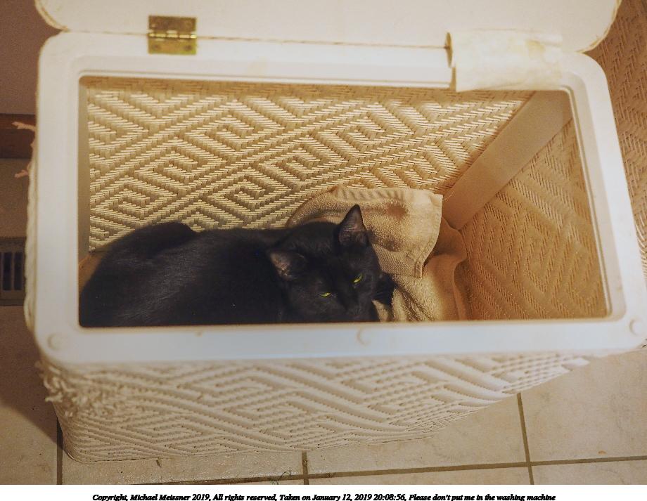 Picture #5: Please don't put me in the washing machine #3 920x713, 110,073 bytes (108K), (html file) Copyright, Michael Meissner 2019, All rights reserved Olympus E-M1-I camera with Olympus-m43 12-40mm f/2.8 lens f/2.8, ISO 1600, 1/60 sec, 27.0mm, auto mode, natural color, HQ, matrix metering, IS Auto, noise reduction auto 35mm equivalent focal length 54.0mm Programs used: crop, raw therapee Taken by Michael Meissner on January 12, 2019 20:08:56 Last modified on January 13, 2019 at 01:59 |