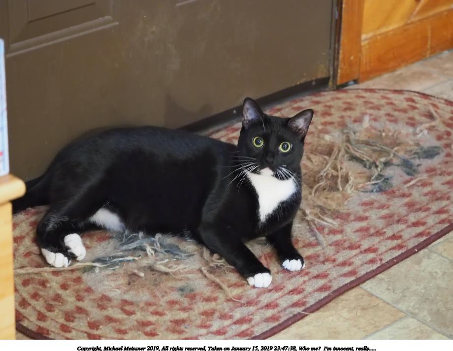 Picture #2: Who me? I'm innocent, really..... 920x713, 91,243 bytes (90K), (html file) Copyright, Michael Meissner 2019, All rights reserved Olympus E-M10-II camera with Olympus-m43 60mm f/2.8 lens f/2.8, ISO 3200, 1/6 sec, 60.0mm, auto mode, vivid color, auto gradation, SHQ, matrix metering, IS Auto, noise reduction auto 35mm equivalent focal length 120.0mm Programs used: crop, raw therapee Taken by Michael Meissner on January 15, 2019 23:47:38 Last modified on January 16, 2019 at 02:00 This picture is one of my favorites. |